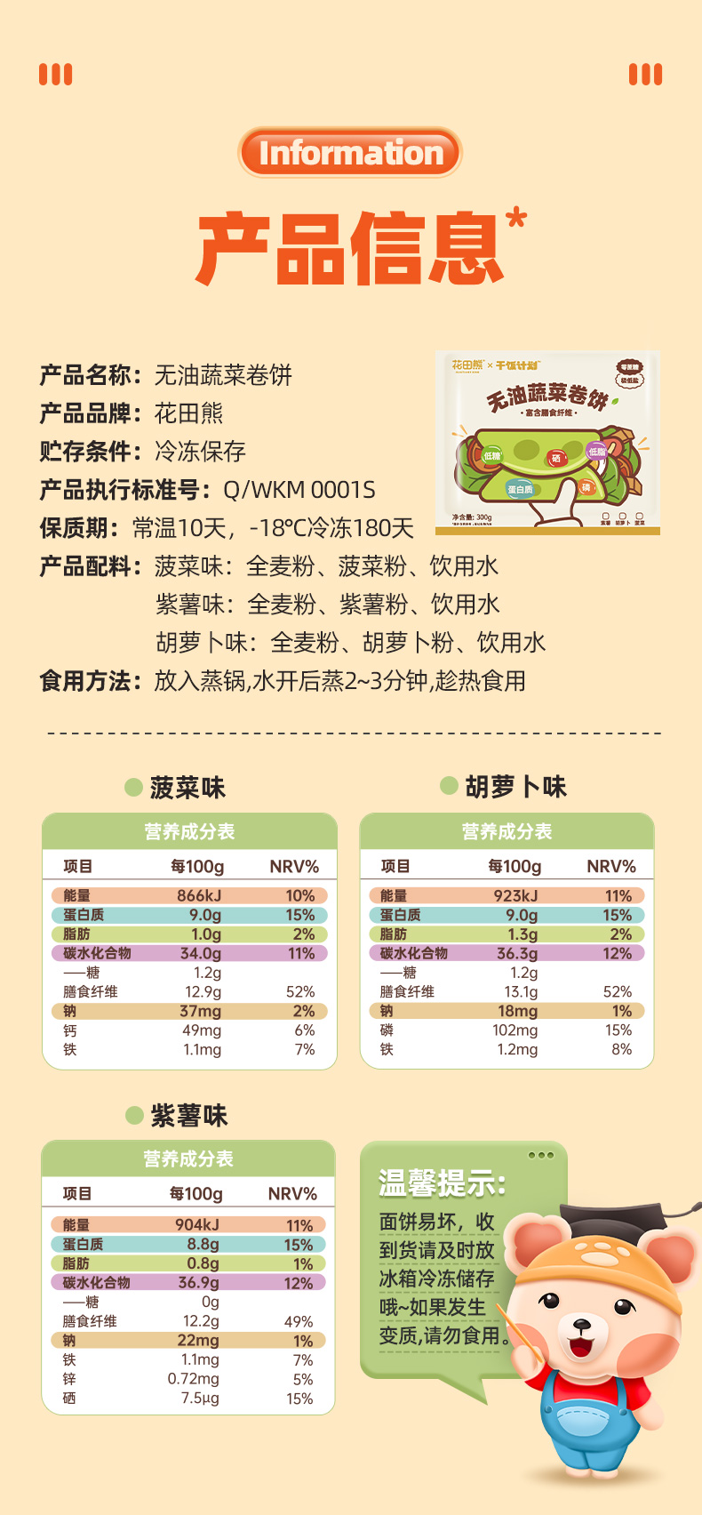 花田熊儿童无油蔬菜卷饼春饼粗粮健康早餐主食手抓饼筋煎饼皮杂粮fs