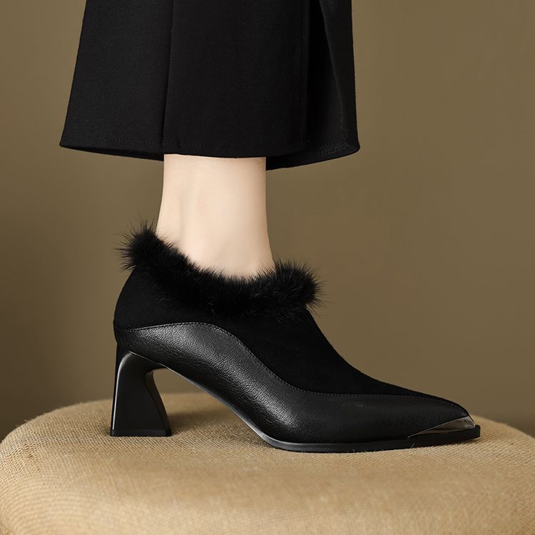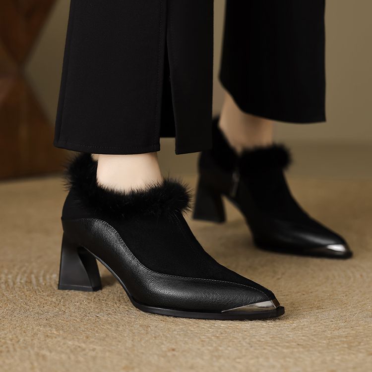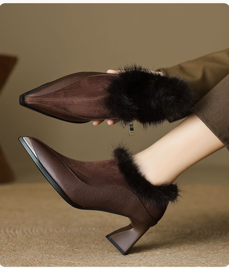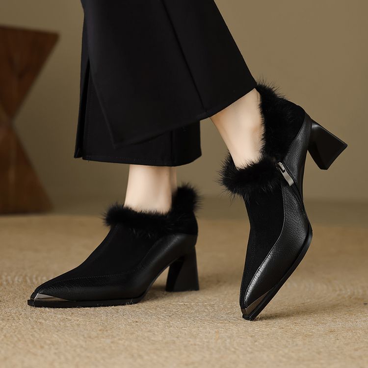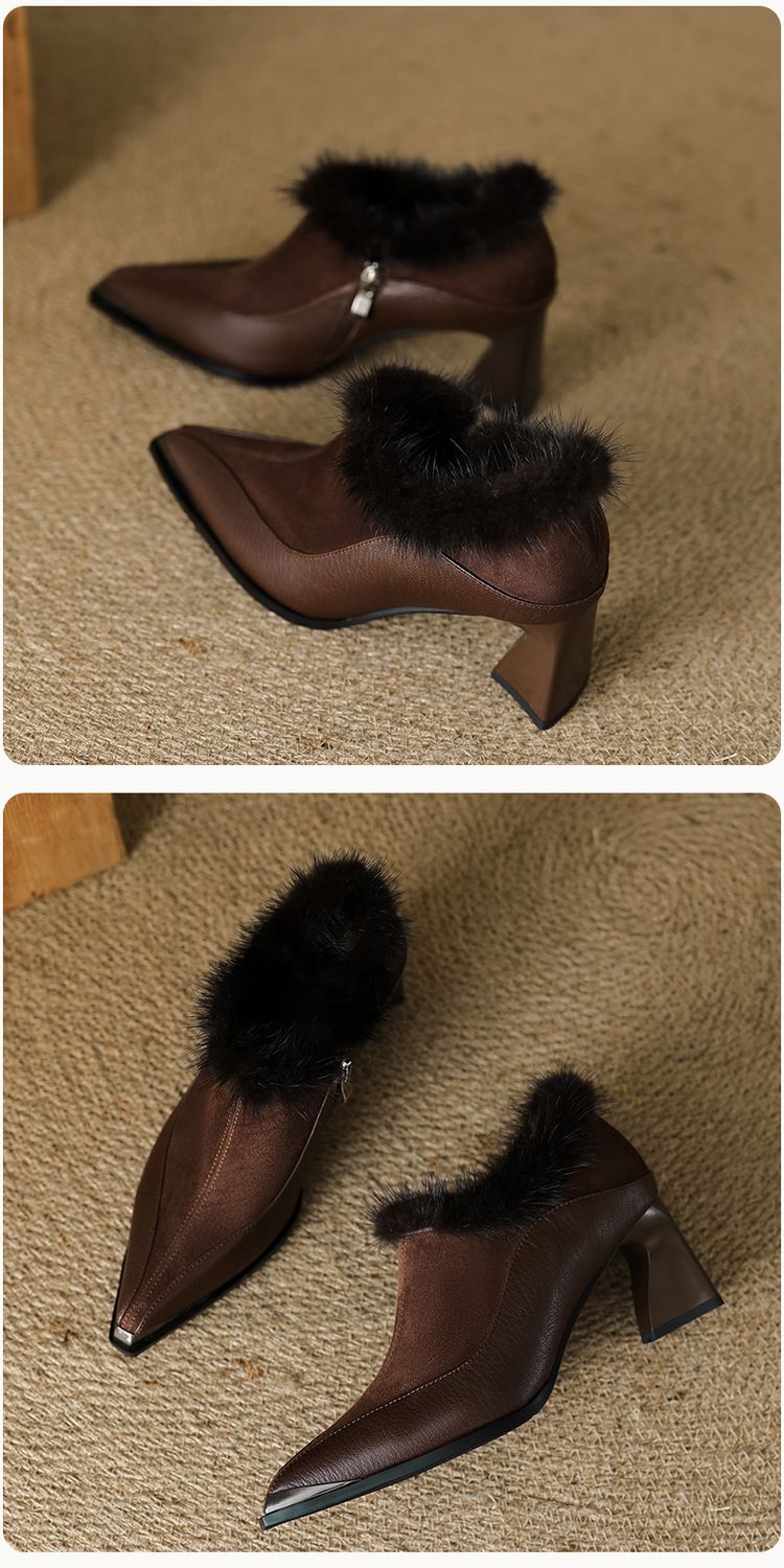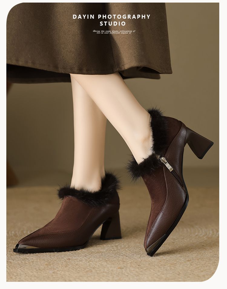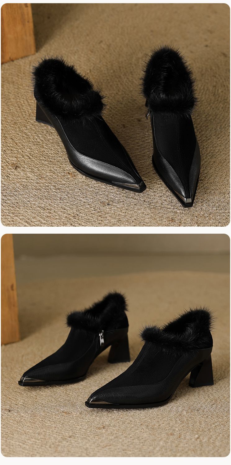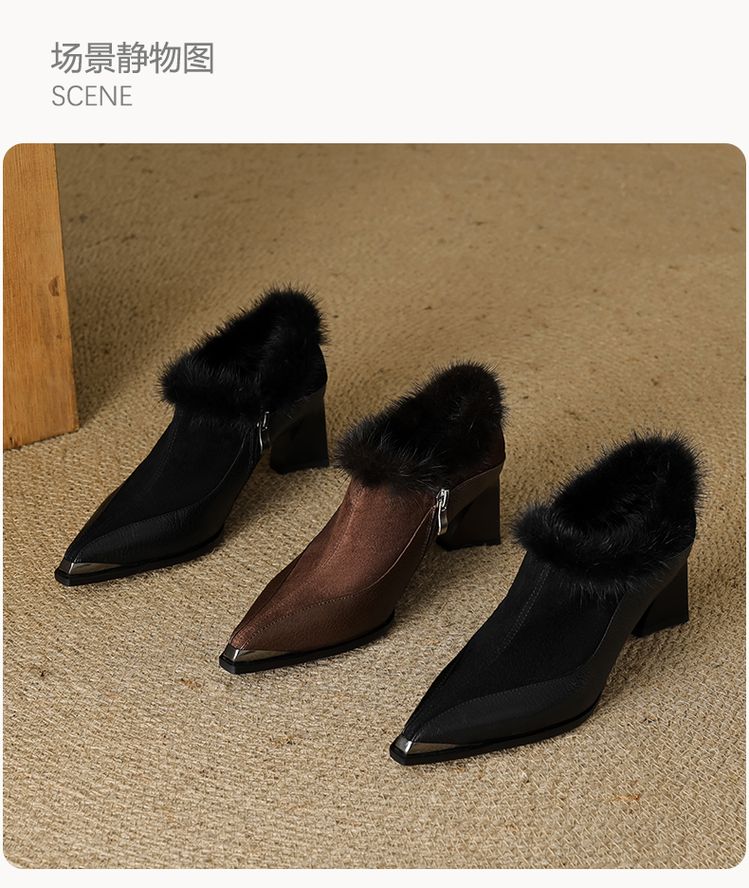 【预售5天】秋冬新款真皮女鞋尖头粗跟牛皮侧拉链短筒靴貂毛时装靴绒里YCJX&H-6165
