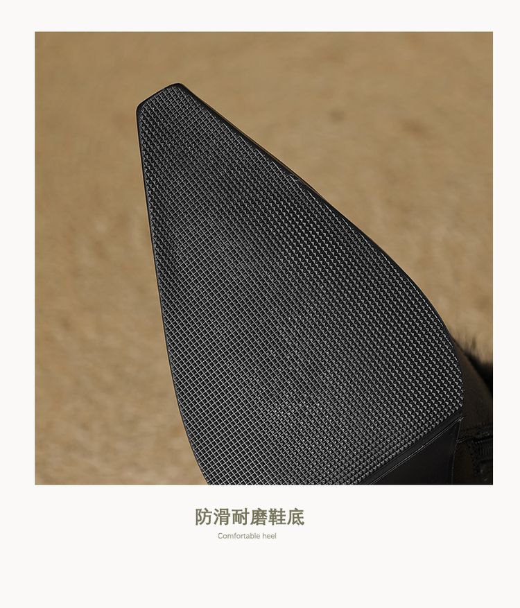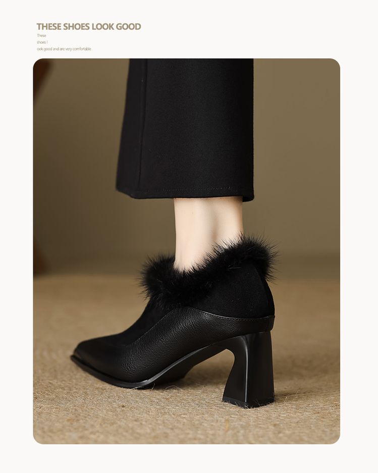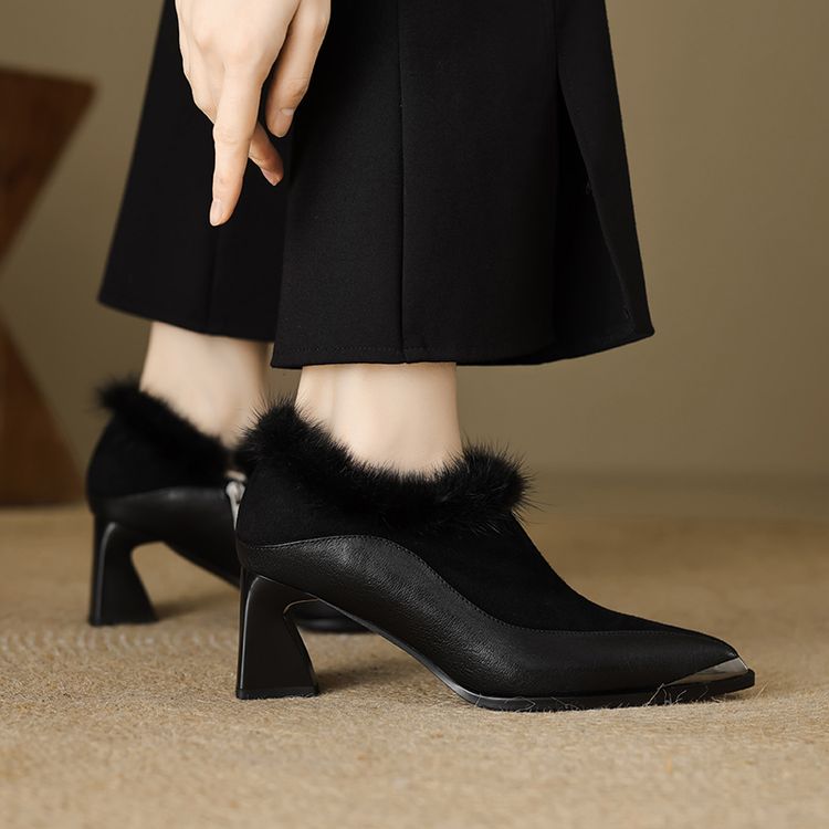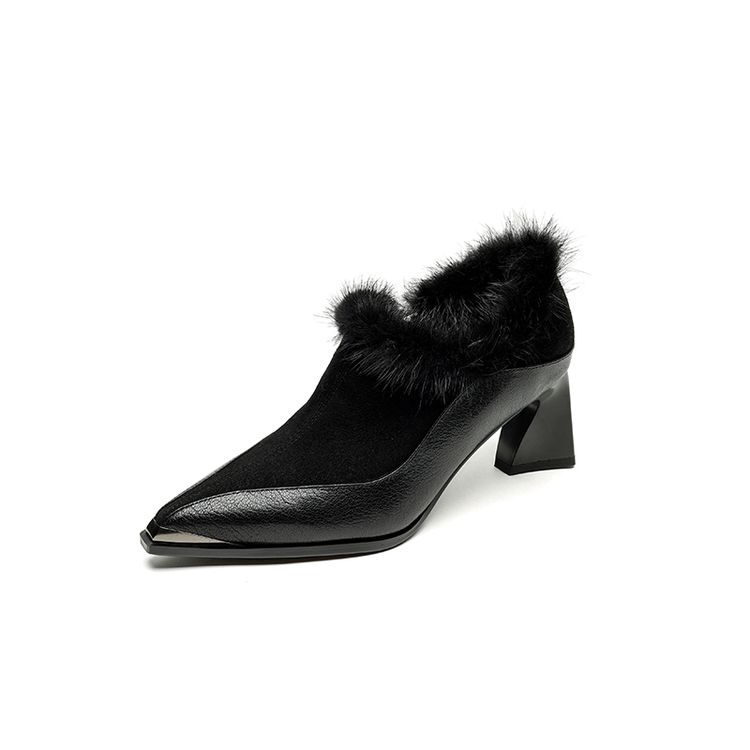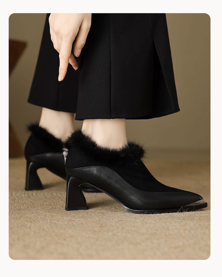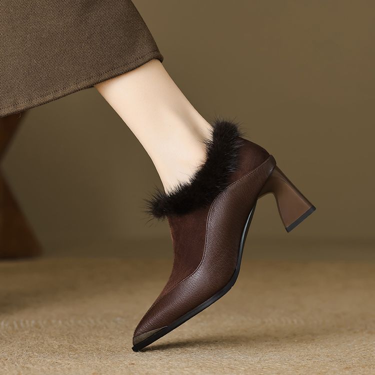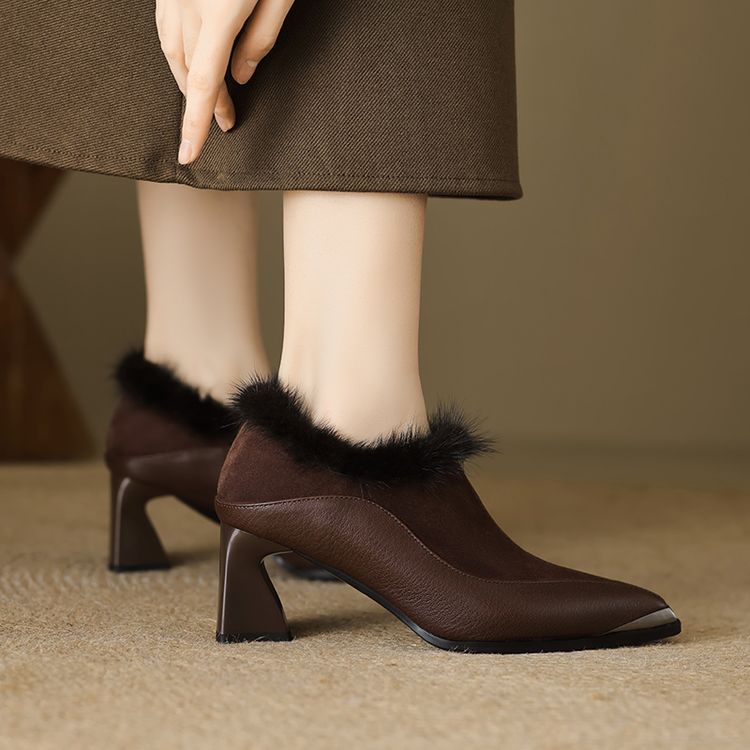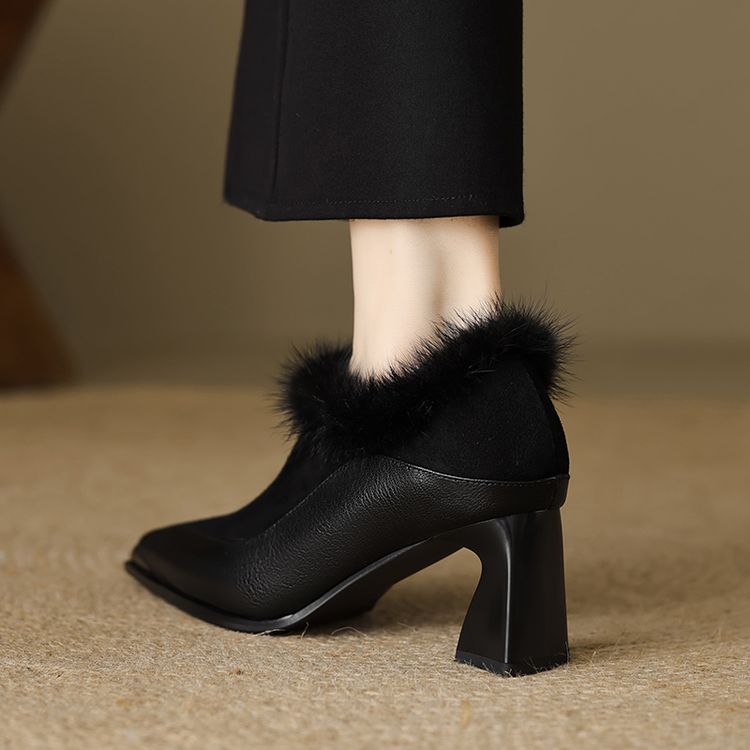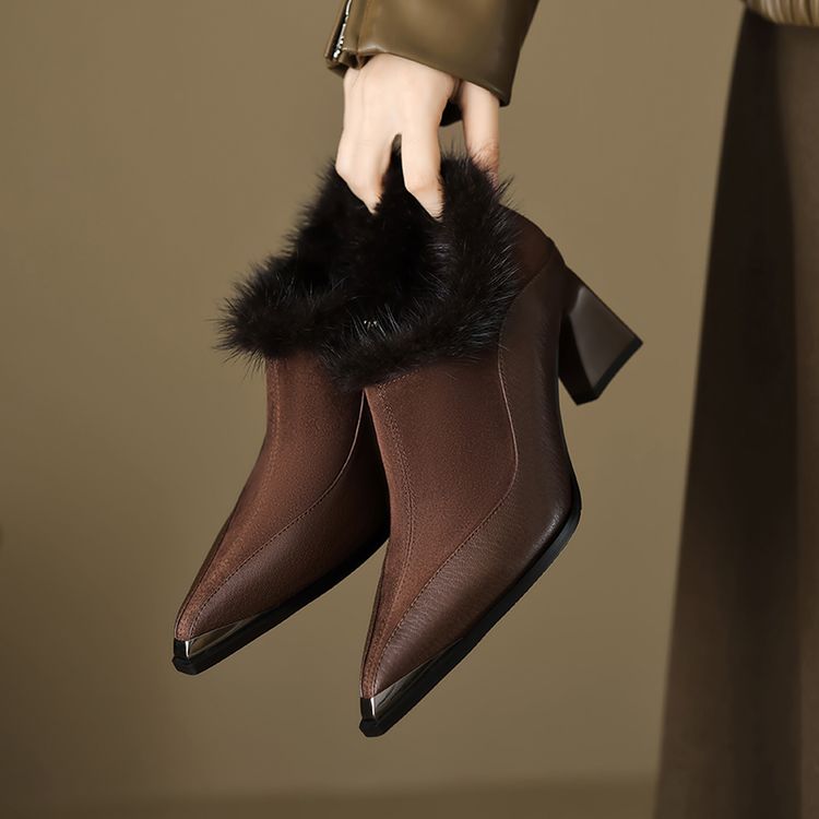 【预售5天】秋冬新款真皮女鞋尖头粗跟牛皮侧拉链短筒靴貂毛时装靴绒里YCJX&H-6165