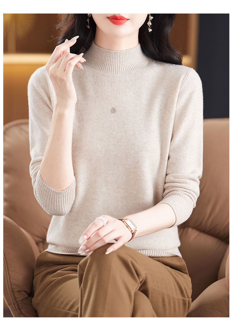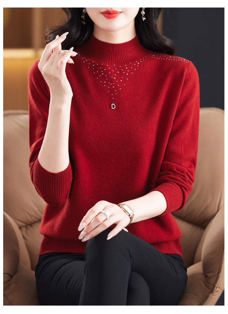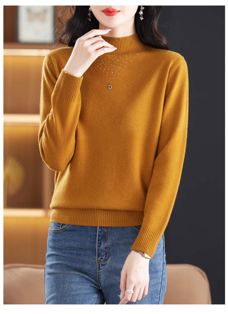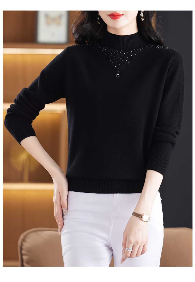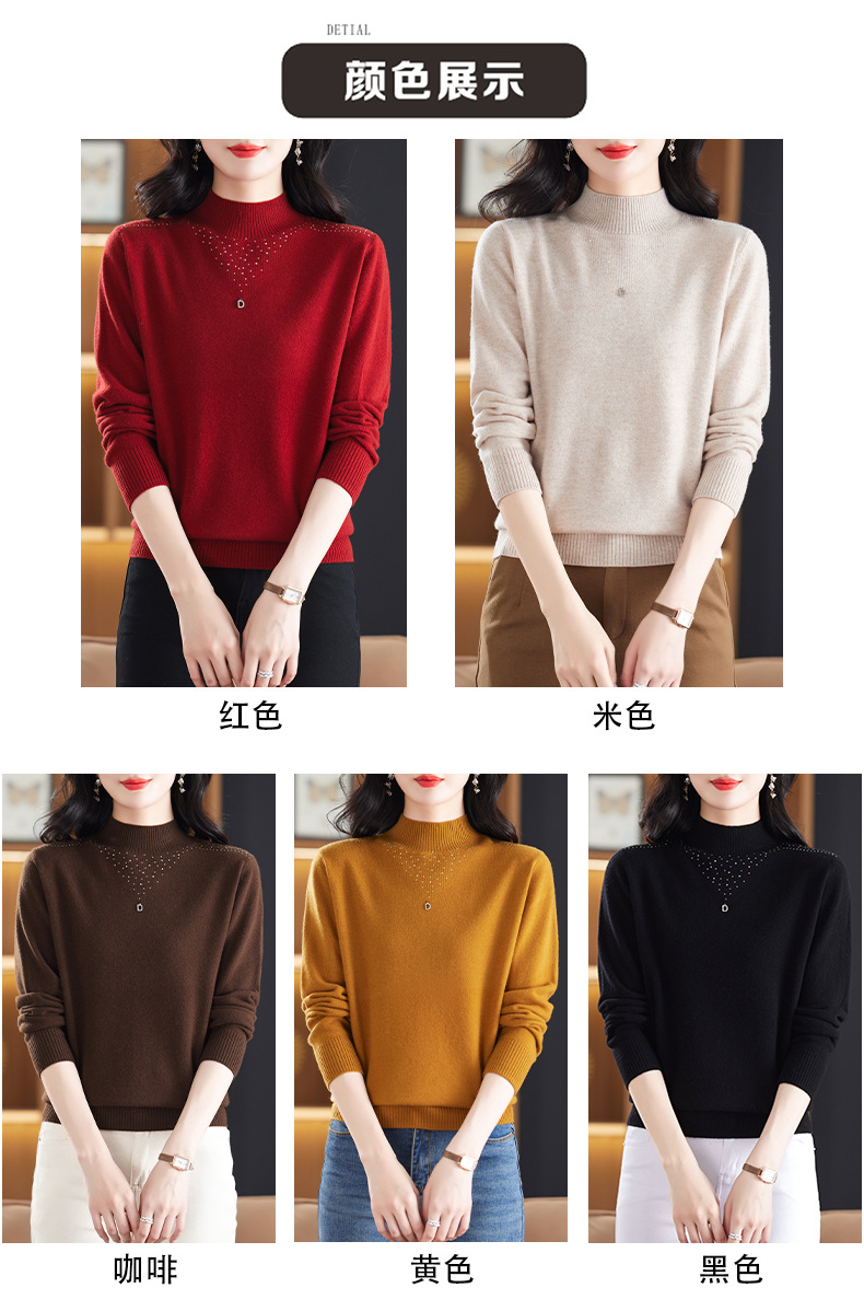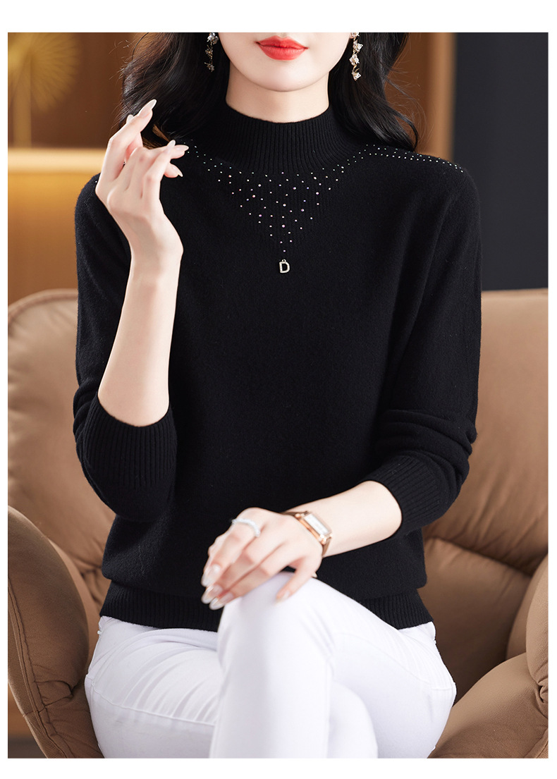 CC-13-6921 2024秋冬半高领100纯羊毛针织衫女内搭打底衫镶钻软糯薄款毛衣女