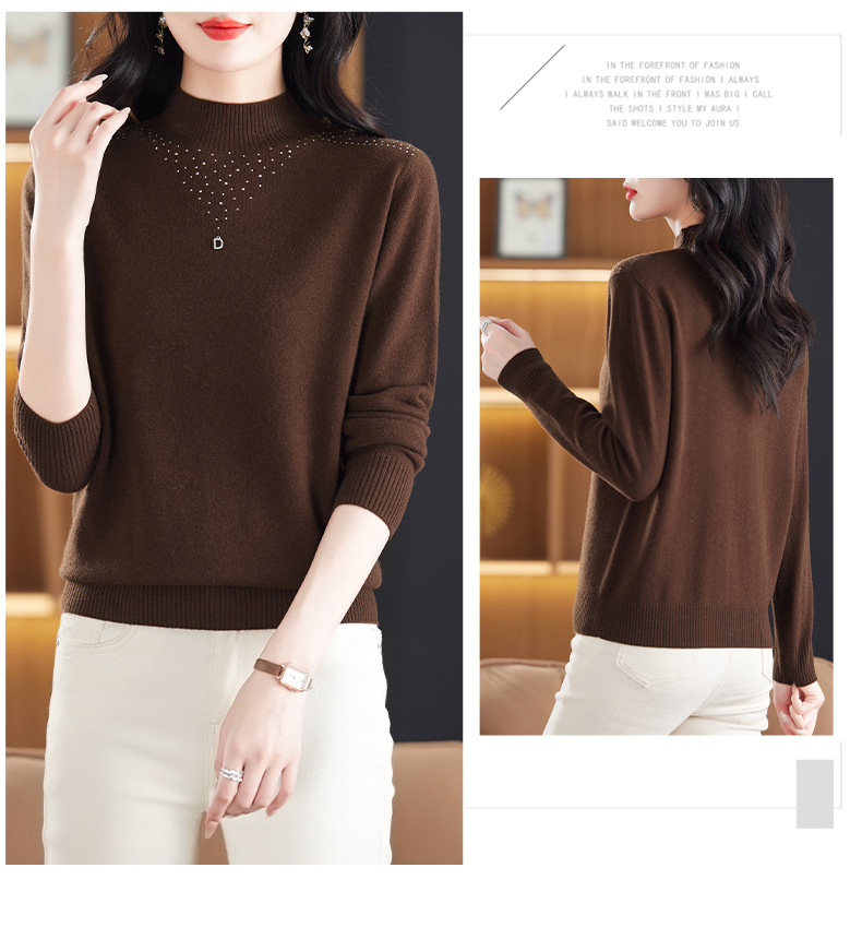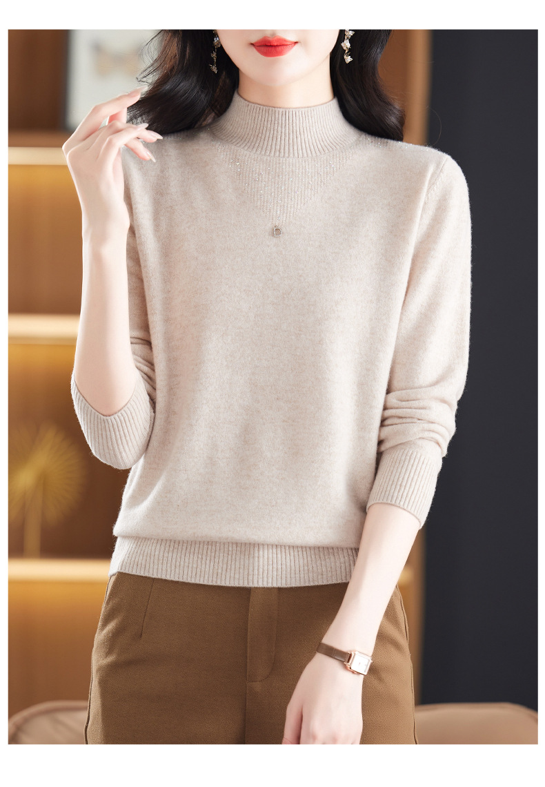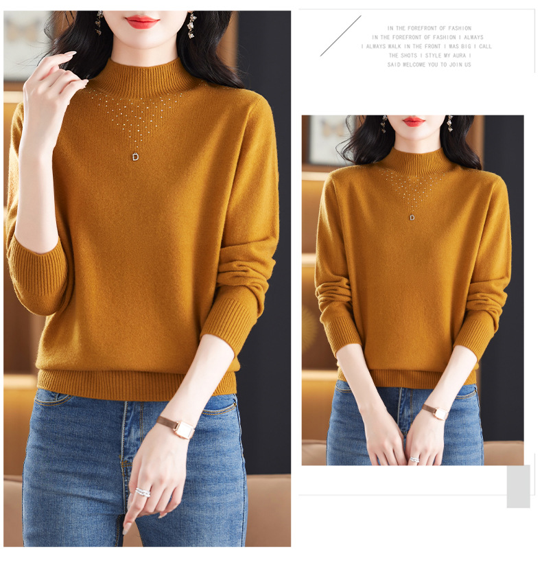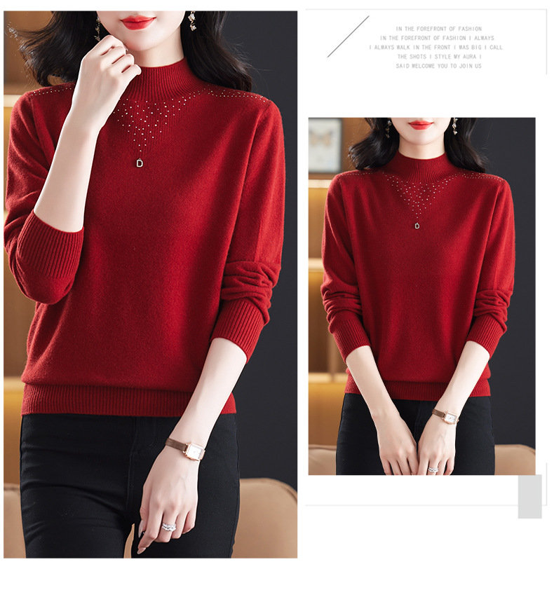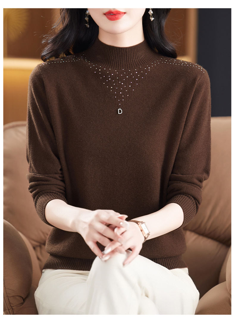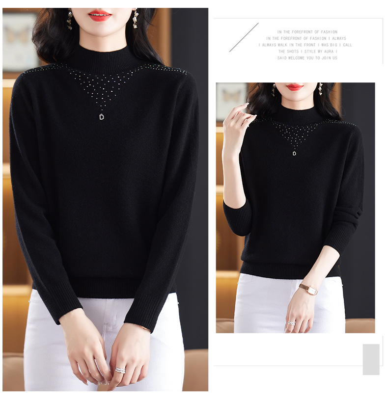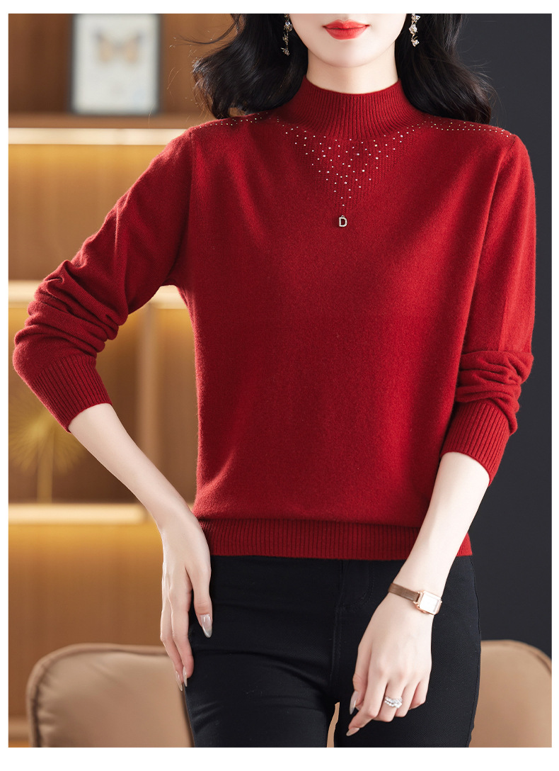 CC-13-6921 2024秋冬半高领100纯羊毛针织衫女内搭打底衫镶钻软糯薄款毛衣女