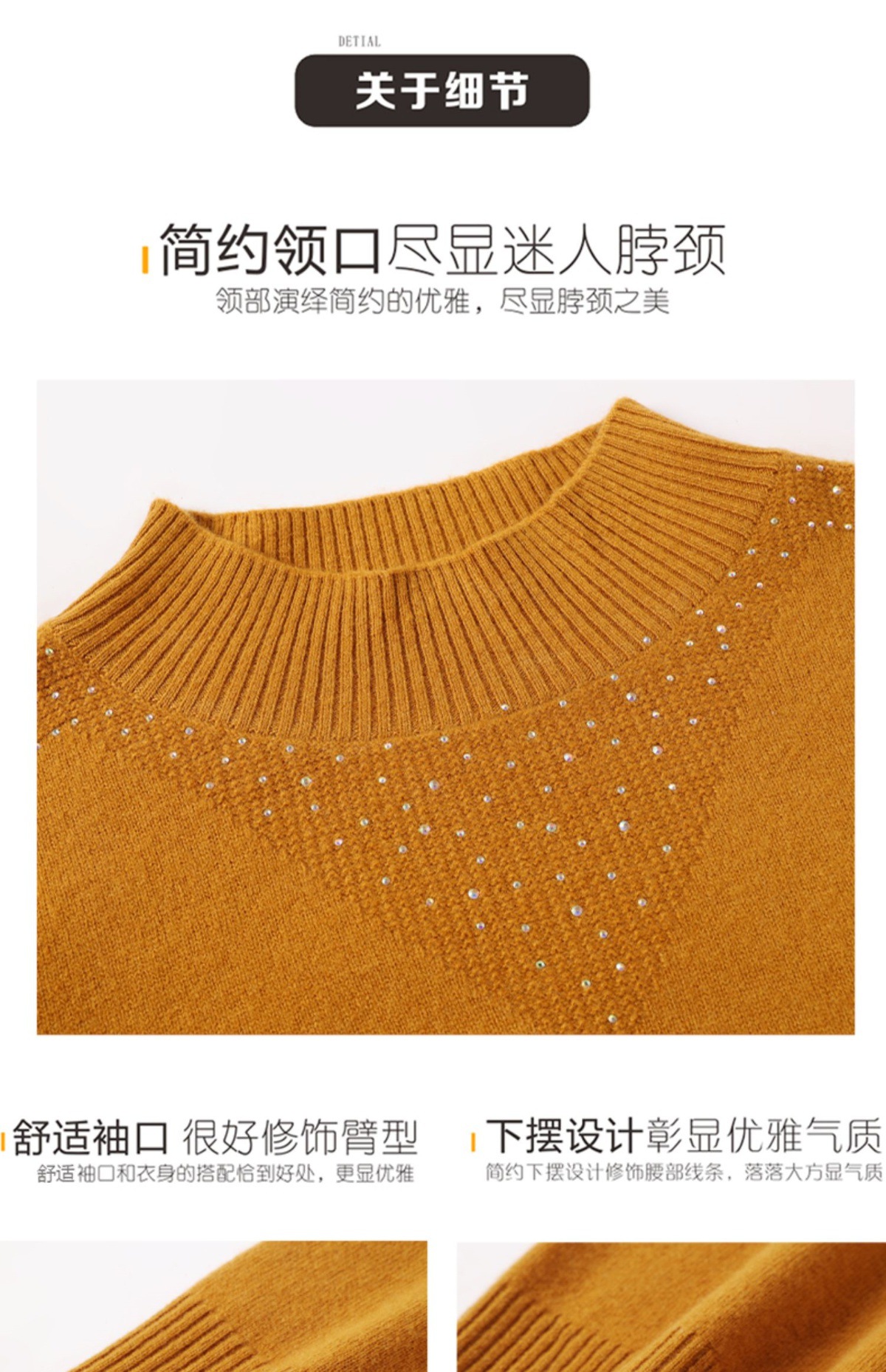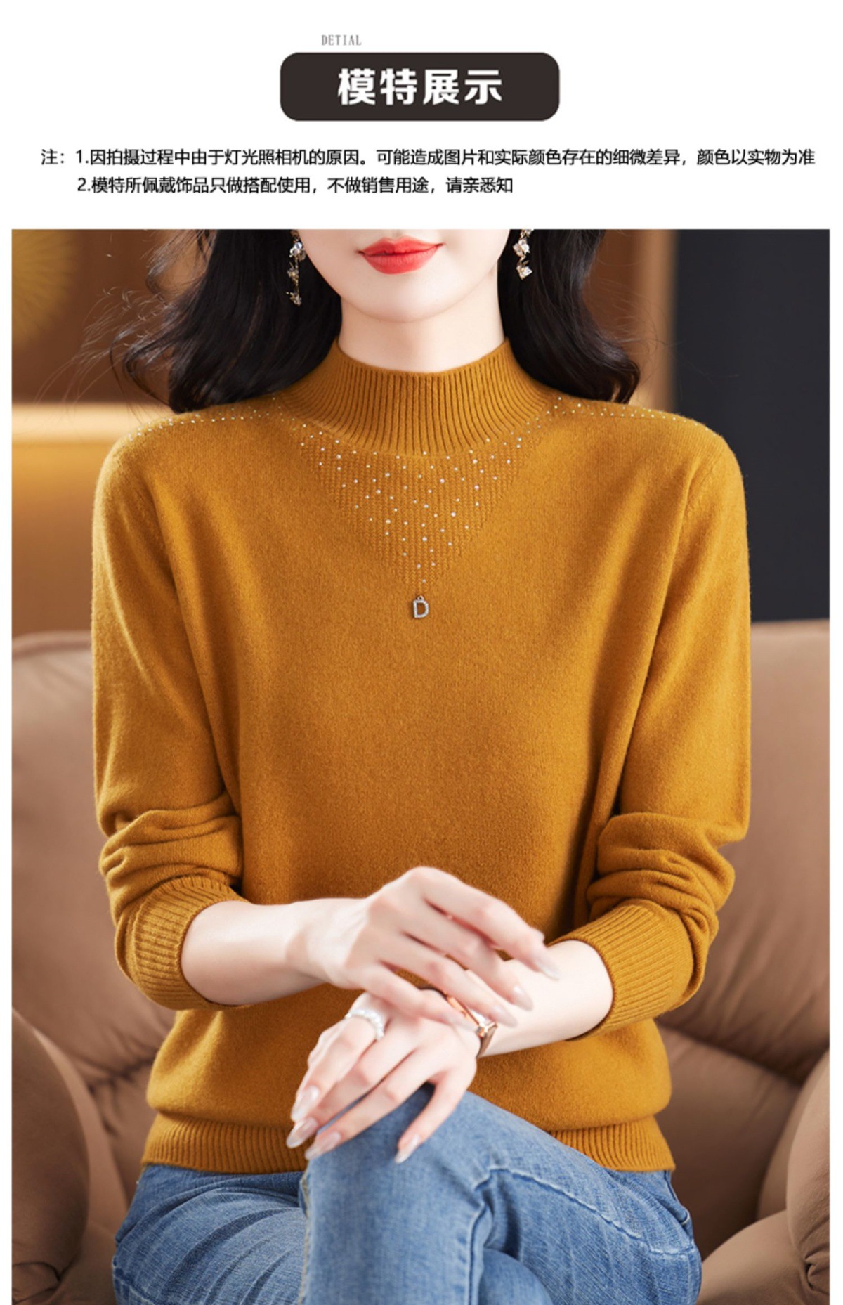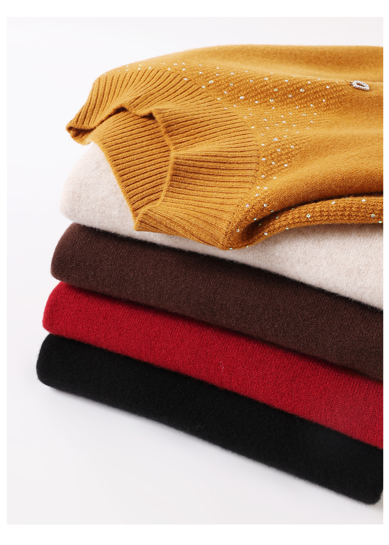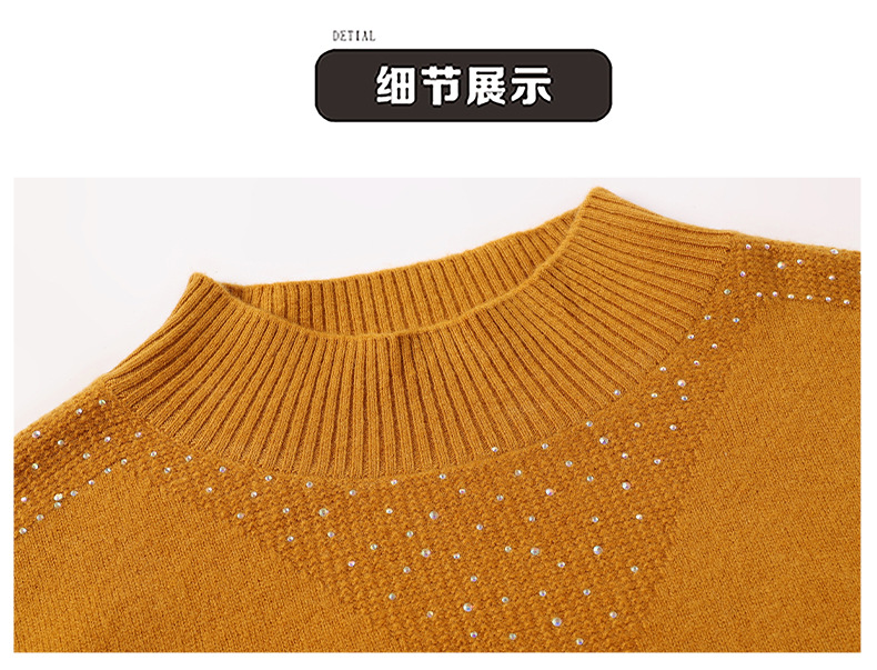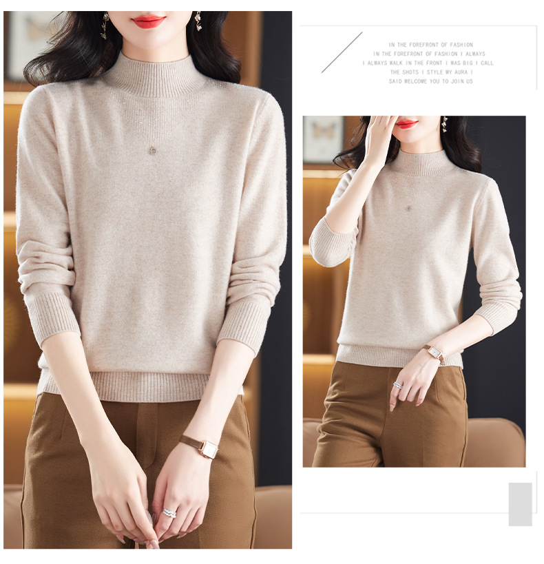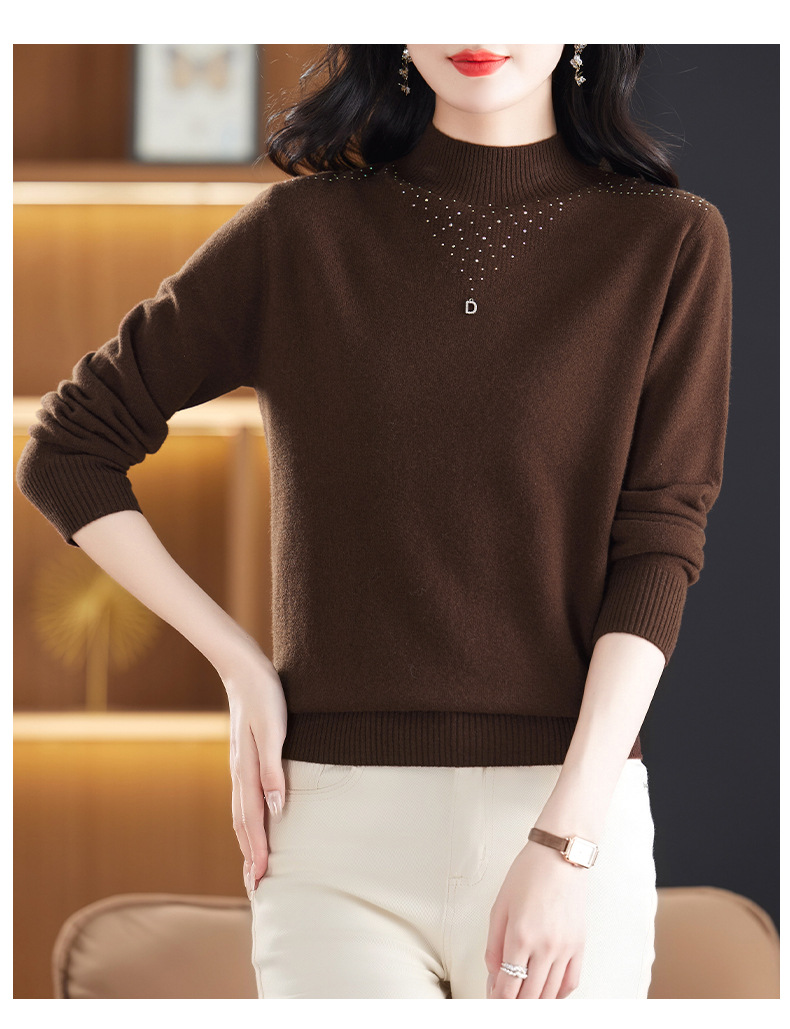 CC-13-6921 2024秋冬半高领100纯羊毛针织衫女内搭打底衫镶钻软糯薄款毛衣女