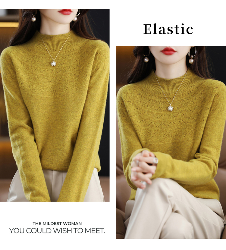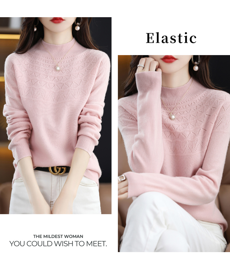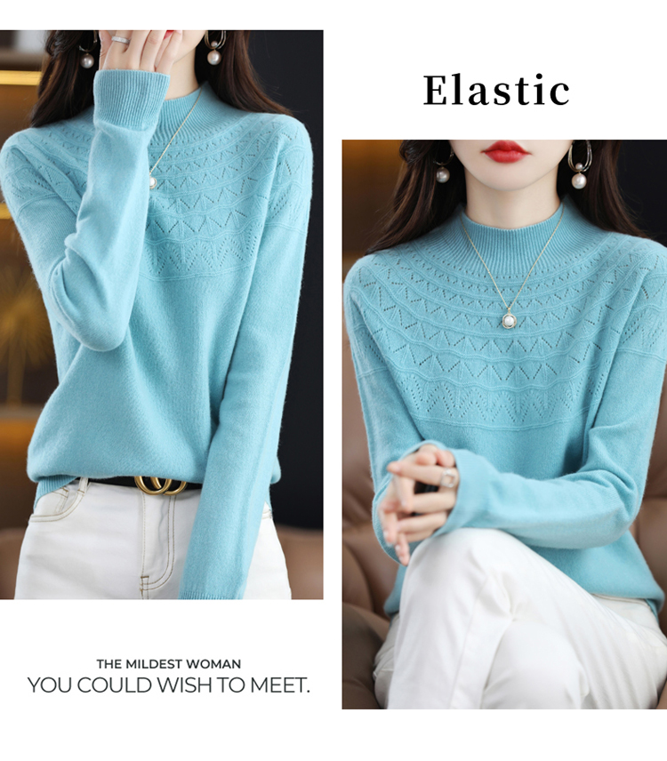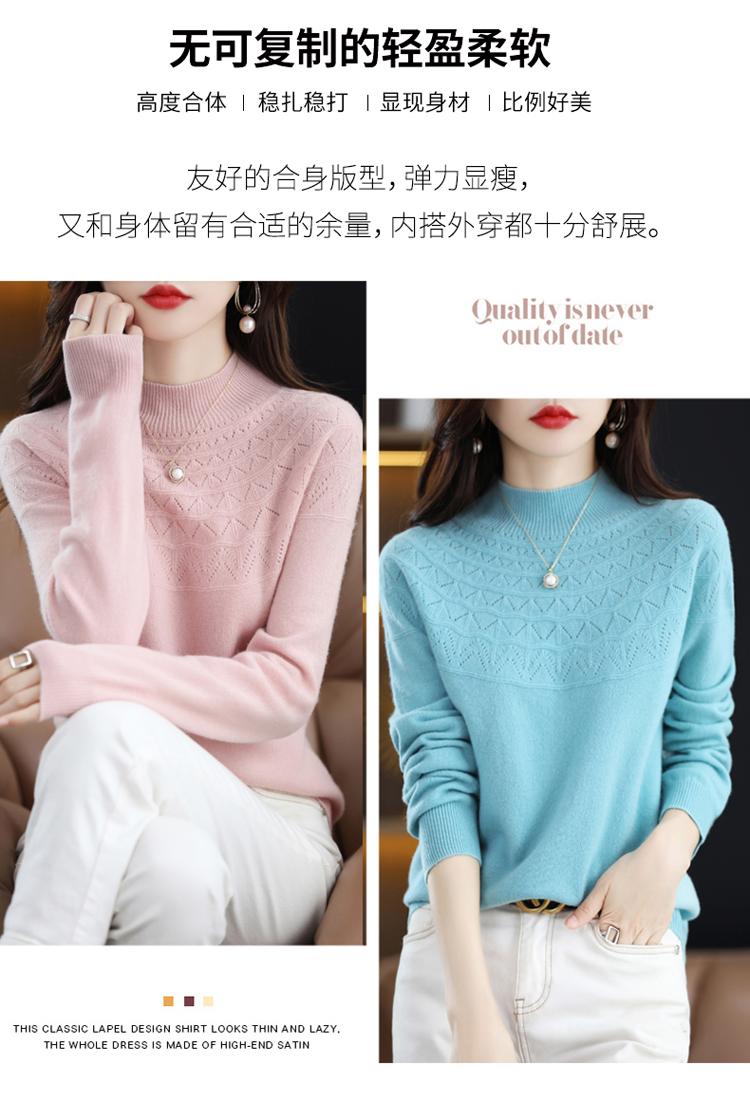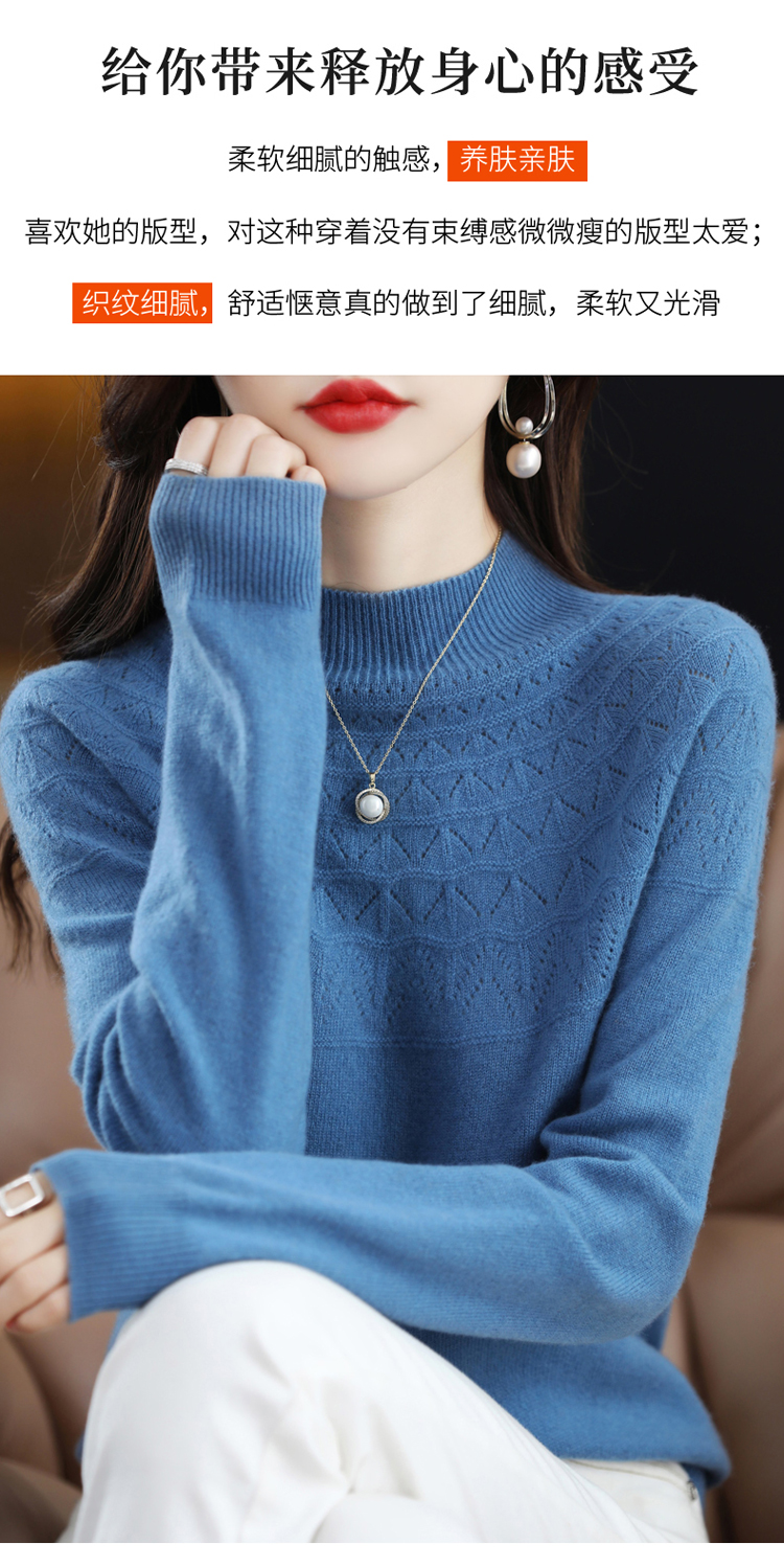 TS-003 100羊毛衫女半高领显瘦毛衣无缝羊绒针织打底衫秋冬镂空宽松上衣
