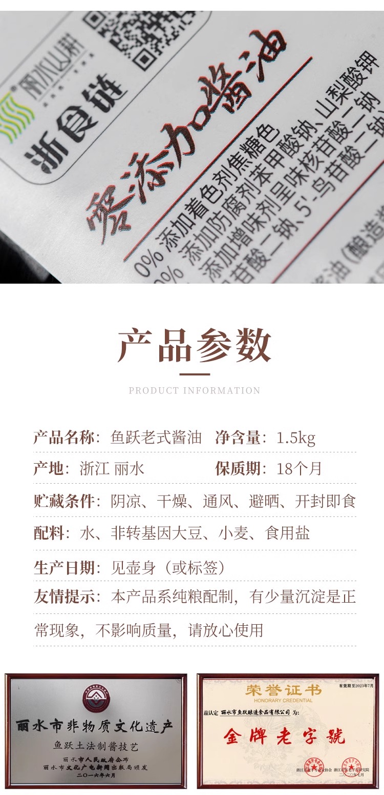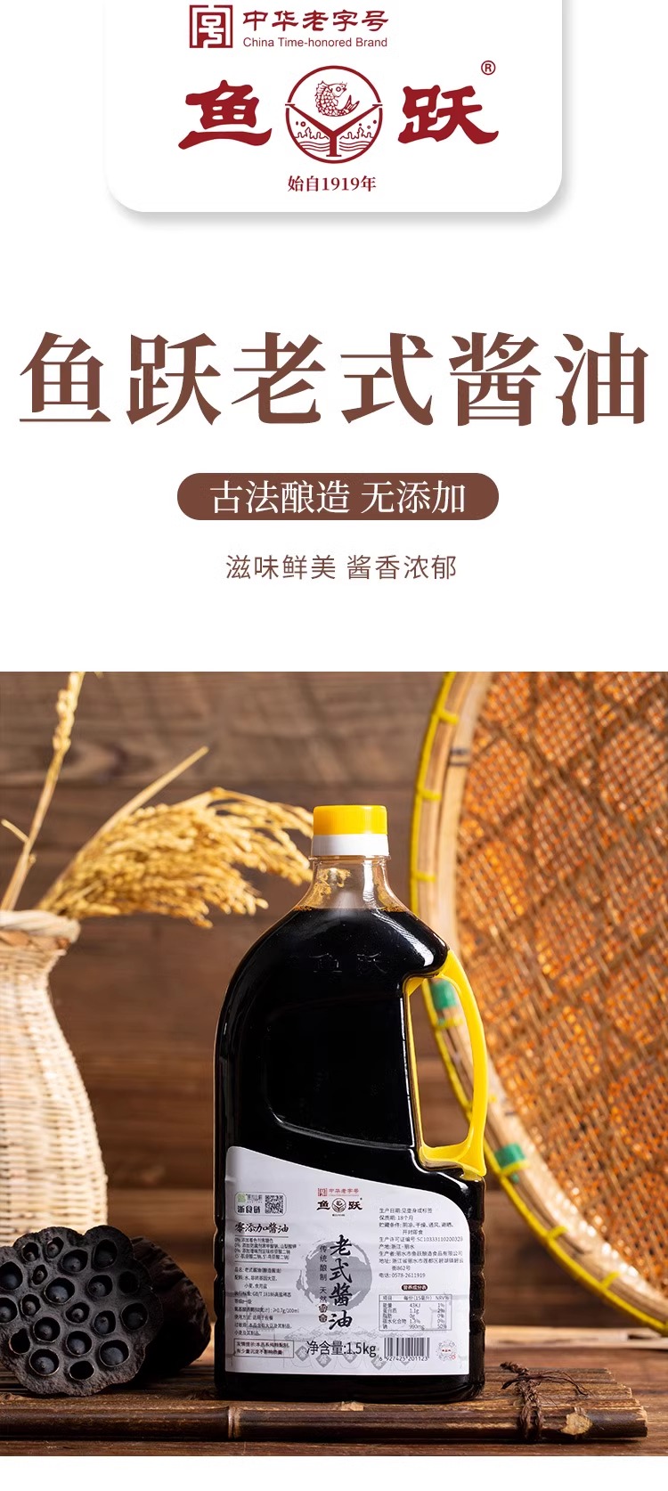 鱼跃酱油1.5kg*2老式酱油零脂肪纯粮黄豆酿造中华老字号酱油