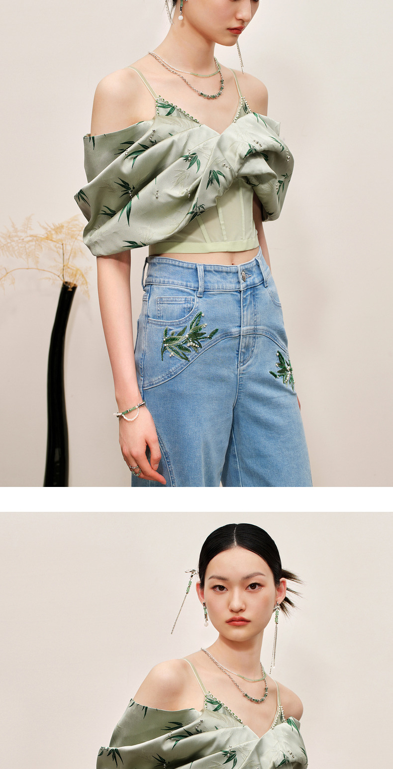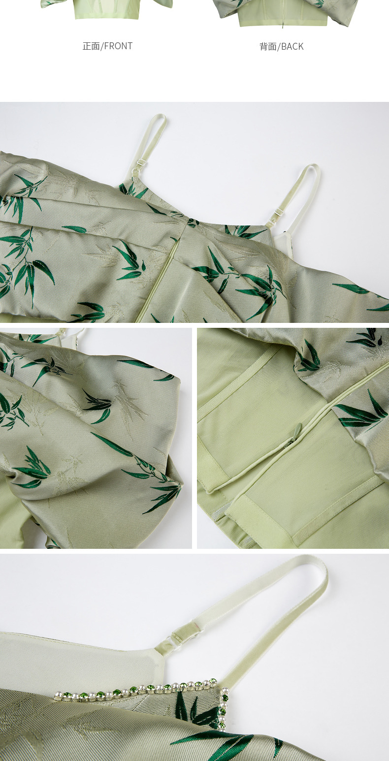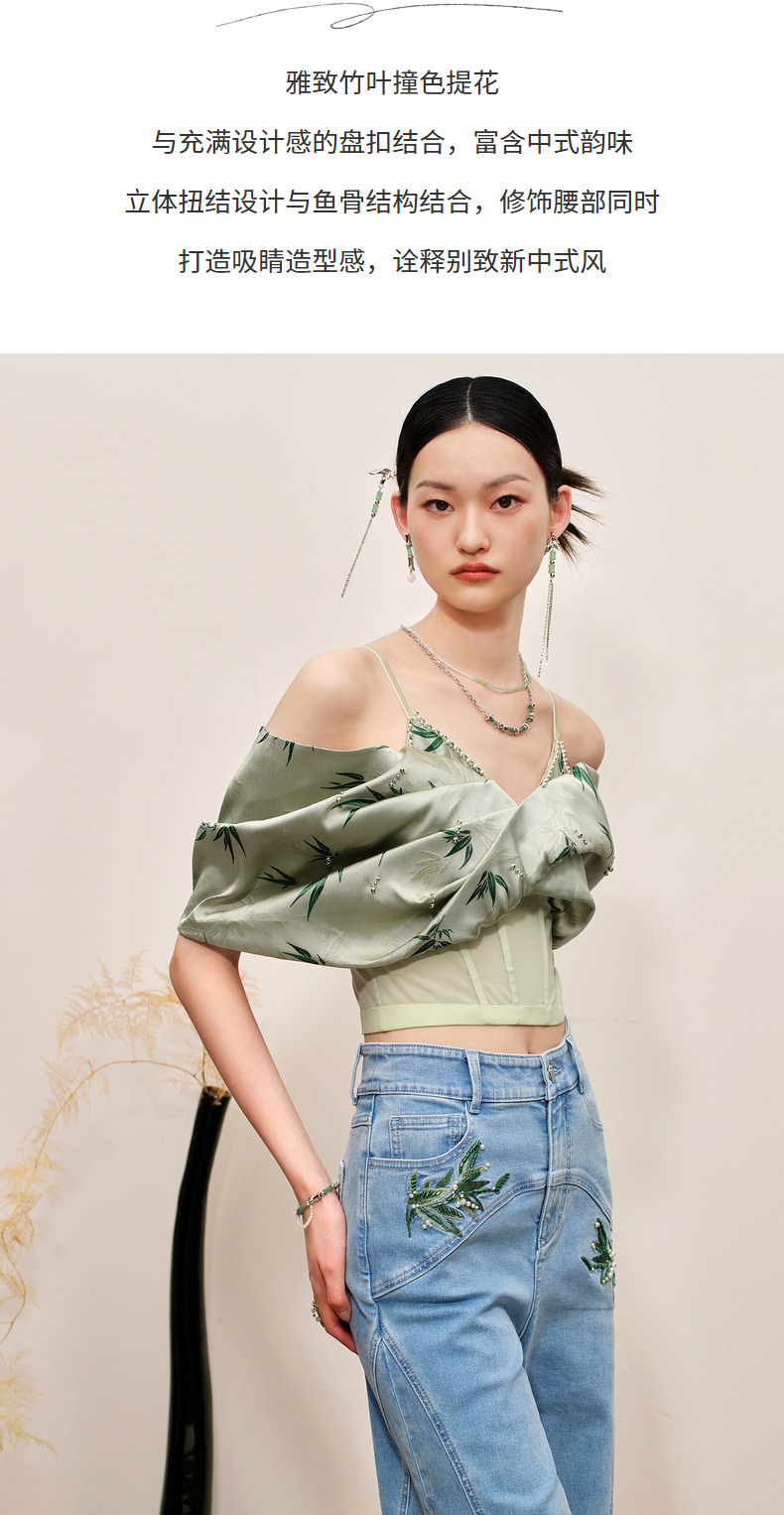MAXRIENY新中式竹叶提花吊带上衣雪纺衫薄荷曼波风(货号:MC88TP504)