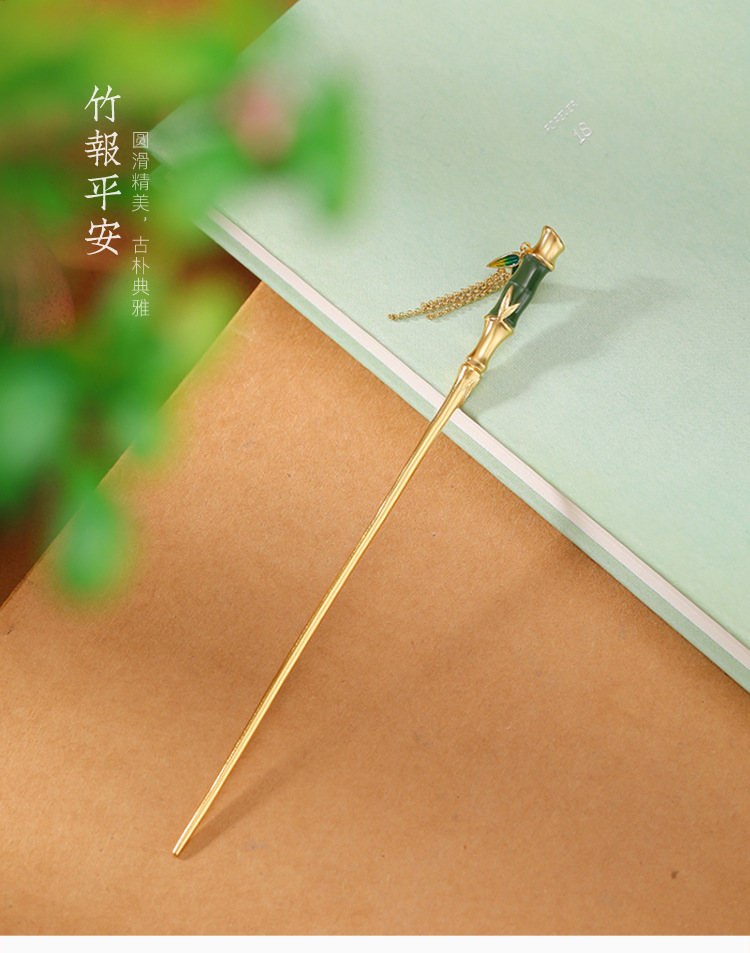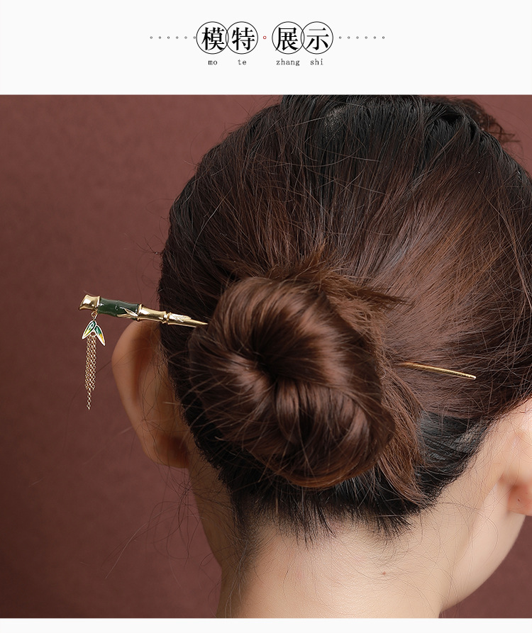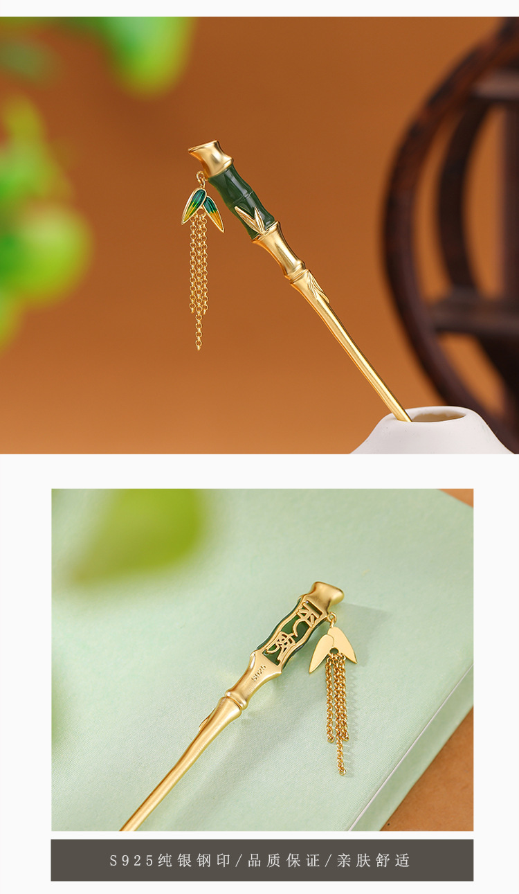 S925纯银镀金和田玉碧玉,复古竹节竹叶流苏发簪气质盘发银簪CW-JP00254