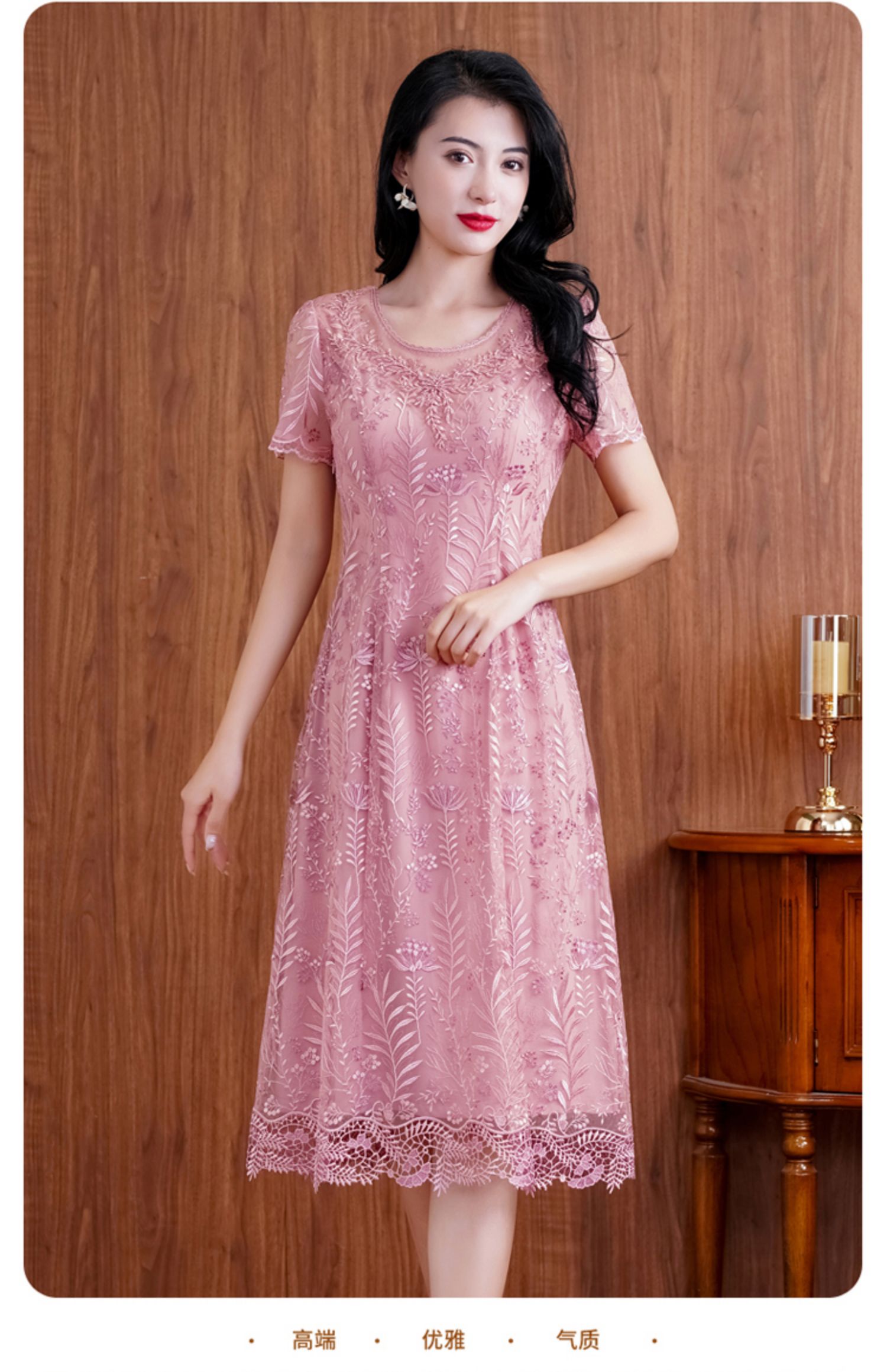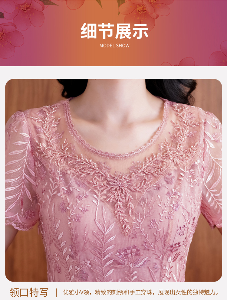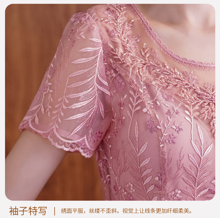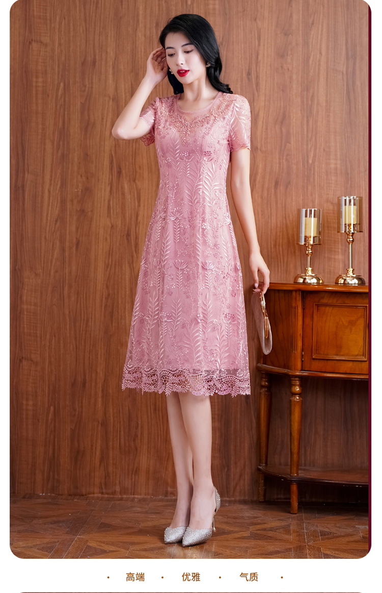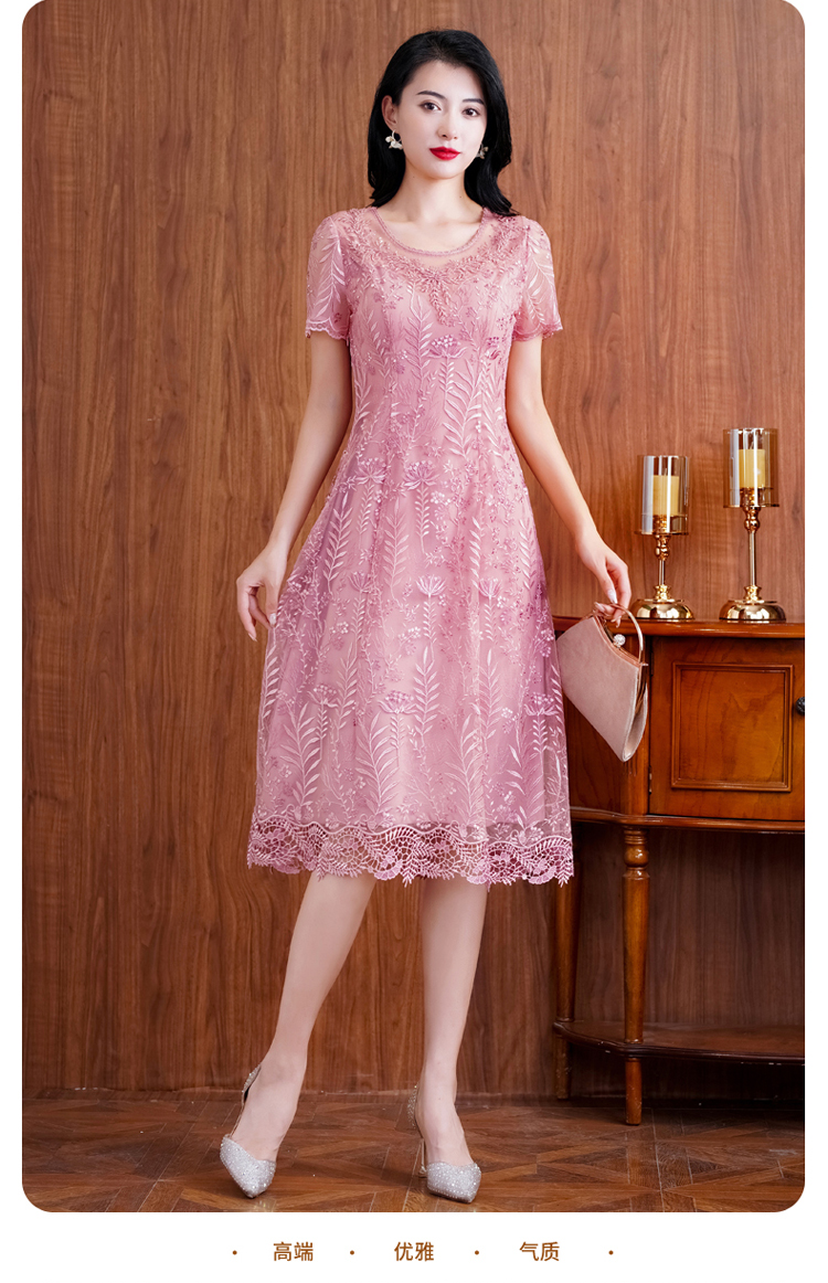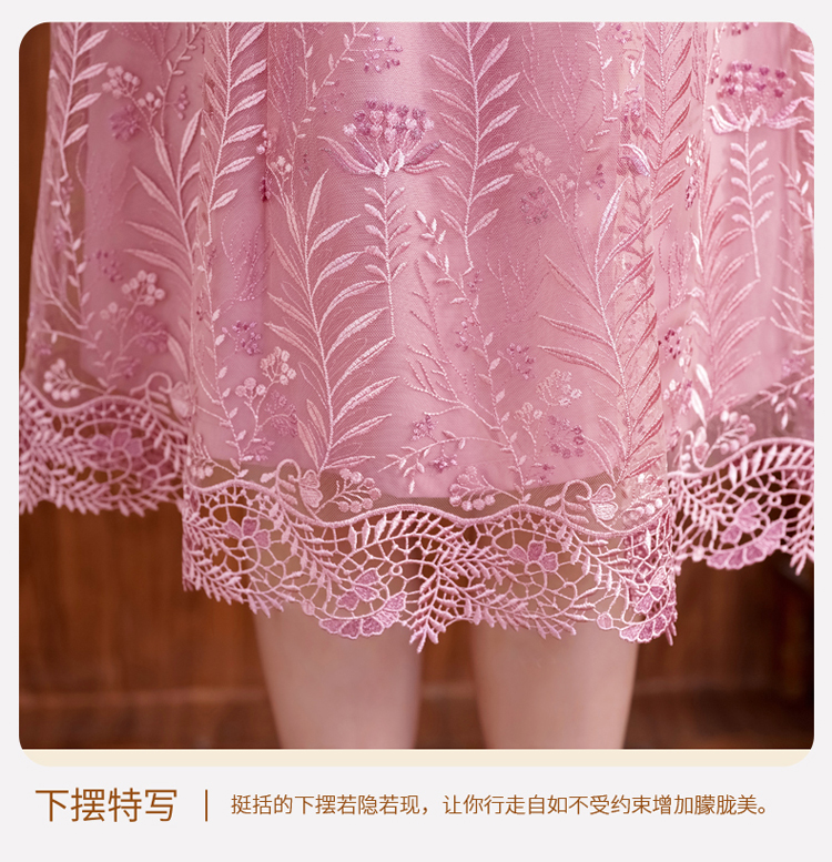 网纱连衣裙新款刺绣年轻时尚高腰大摆粉色蕾丝裙 X-8180