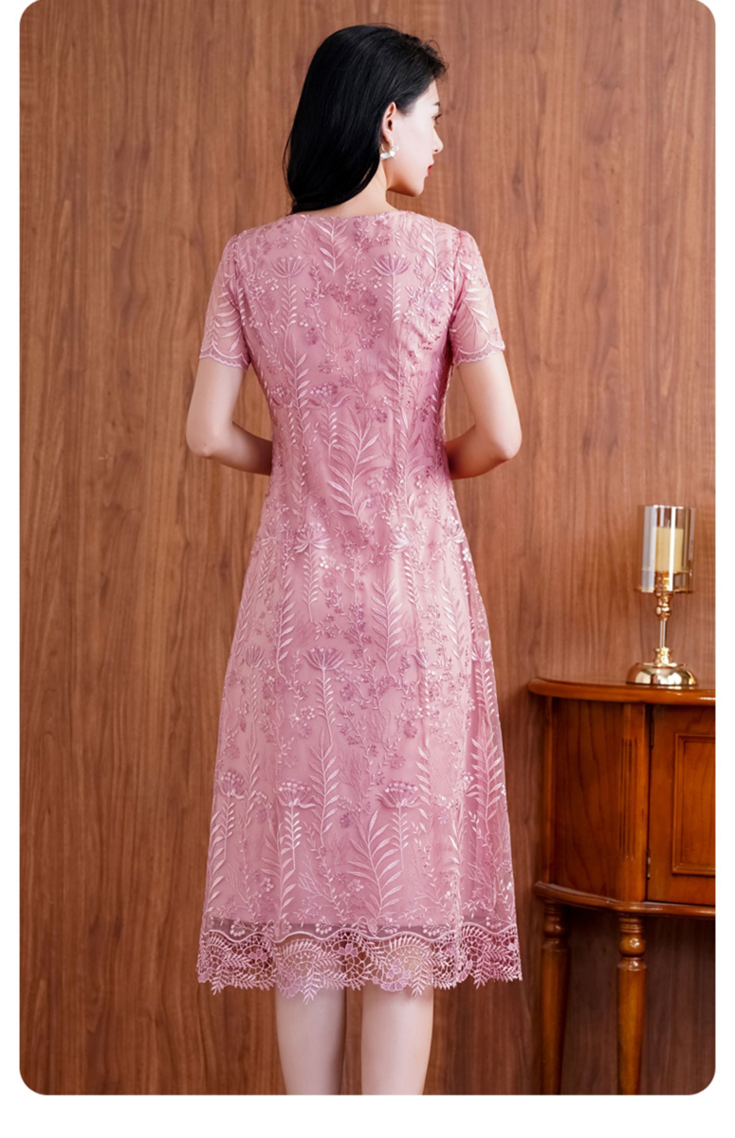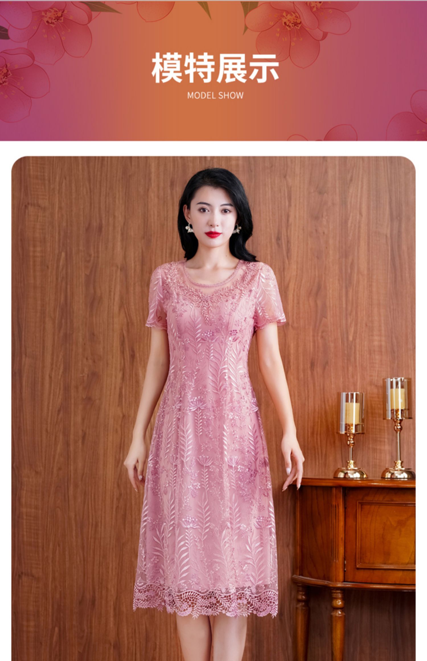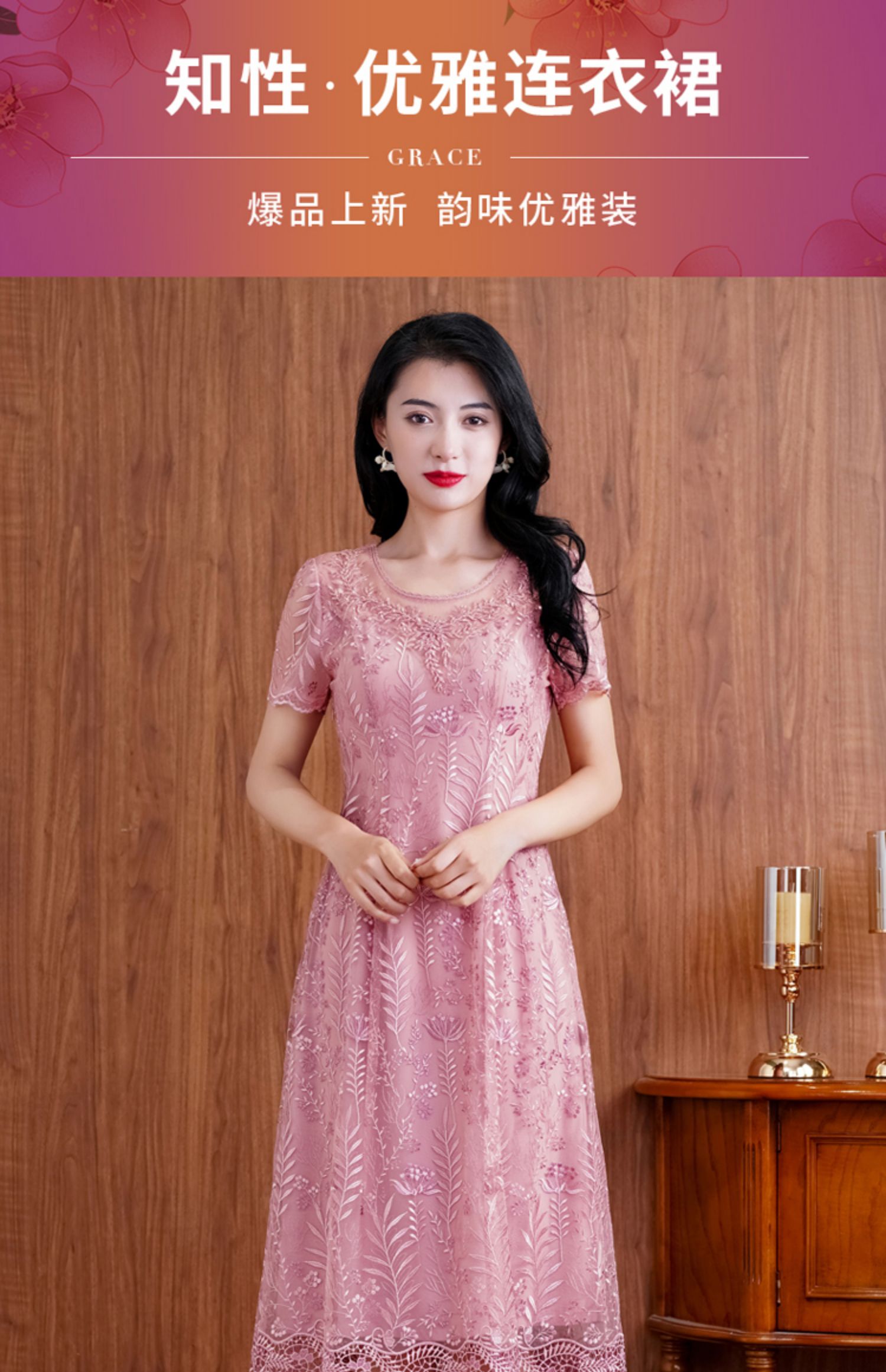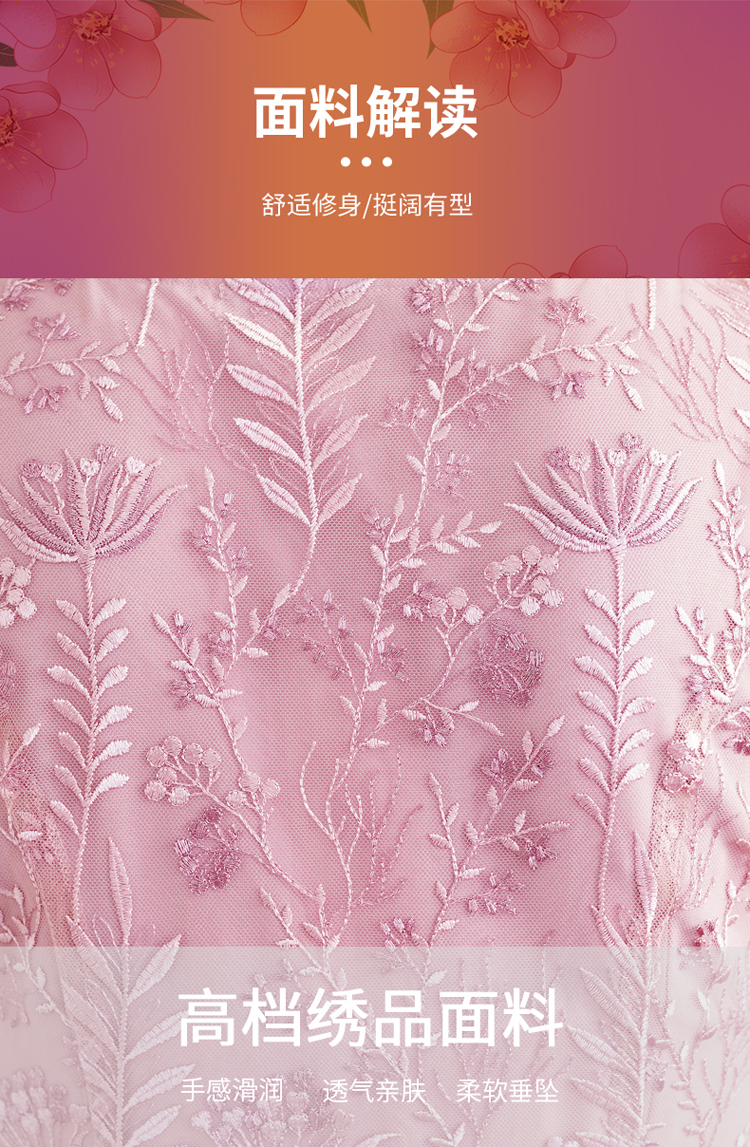 网纱连衣裙新款刺绣年轻时尚高腰大摆粉色蕾丝裙 X-8180