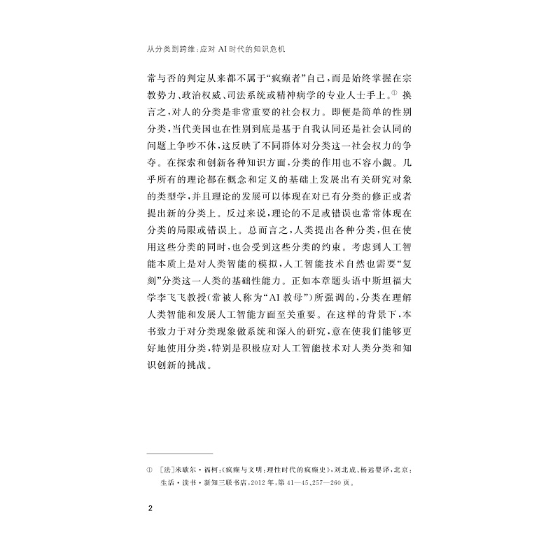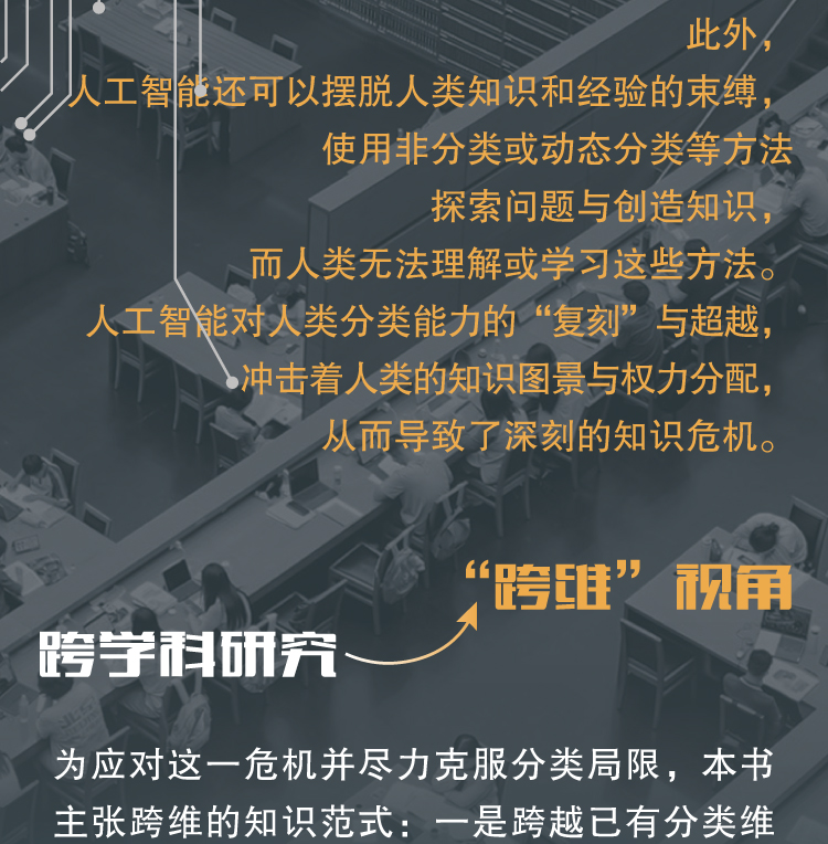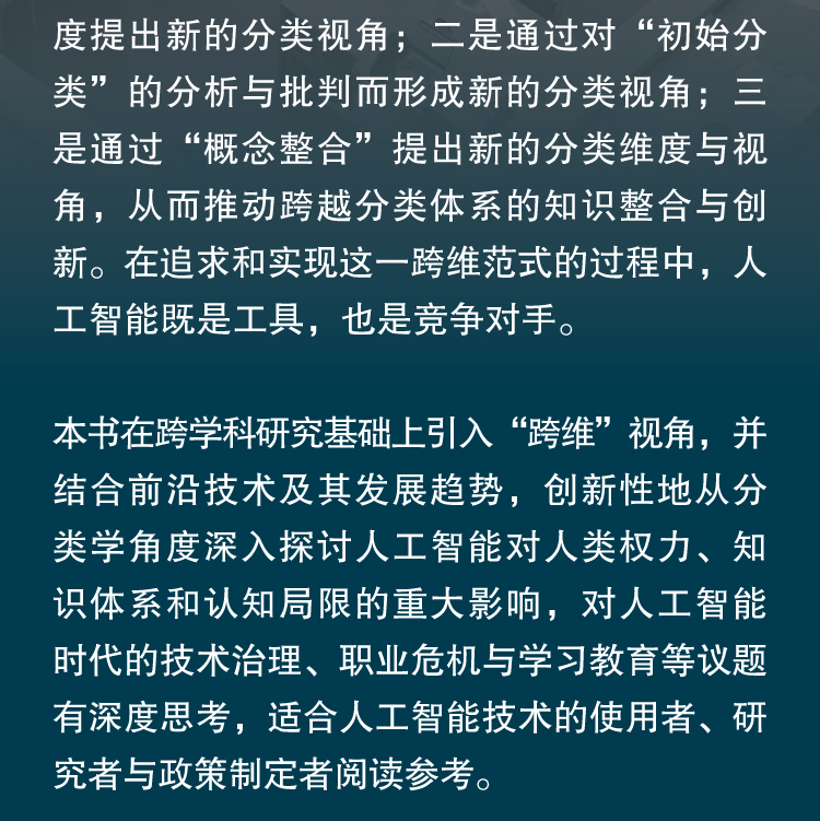 人类所有的知识都以分类为基础。分类为我们认识和改造世界提供基本框架,它不仅是思维的重要基点,而且是处理信息过载的基本方法,本身还带有很强的知识属性和权力特性。但是,分类思维也存在类别固化、边界模糊、视角受限等不足。随着深度强化学习技术的快速发展,当前生成式人工智能在分类能力、知识学习、知识创新等方面正在达到或超过人类的智能水平。此外,人工智能还可以摆脱人类知识和经验的束缚,使用非分类或动态分类等方法探索问题与创造知识,而人类无法理解或学习这些方法。人工智能对人类分类能力的“fuke”与超越,冲击着人类的知识图景与权力分配,从而导致了深刻的知识危机。为应对这一危机并尽力克服分类局限,本书主张跨维的知识范式:一是跨越已有分类维度提出新的分类视角;二是通过对“初始分类”的分析与批判而形成新的分类视角;三是通过“概念整合”提出新的分类维度与视角,从而推动跨越分类体系的知识整合与创新。在追求和实现这一跨维范式的过程中,人工智能既是工具,也是竞争对手。本书在跨学科研究基础上引入“跨维”视角,并结合前沿技术及其发展趋势,创新性地从分类学角度深入探讨人工智能对人类权力、知识体系和认知局限的重大影响,对人工智能时代的技术治理、职业危机与学习教育等议题有深度思考,适合人工智能技术的使用者、研究者与政策制定者阅读参考。