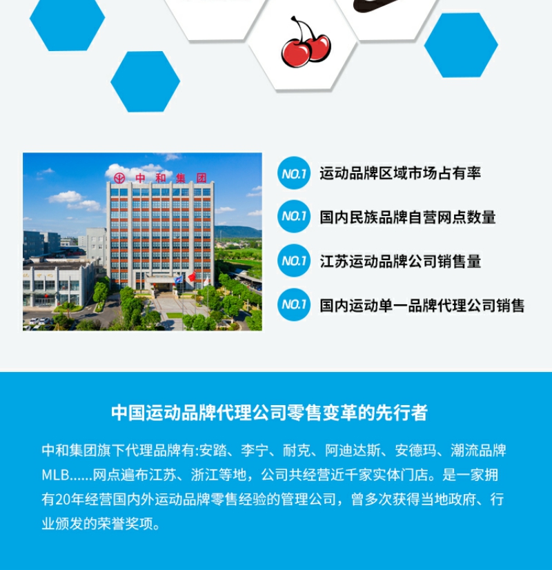 - 中和集团旗下代理安踏、李宁、耐克、安德玛、耐克、中国李宁、MIB等运动时尚品牌,网点遍布江苏、浙江、湖北等身份