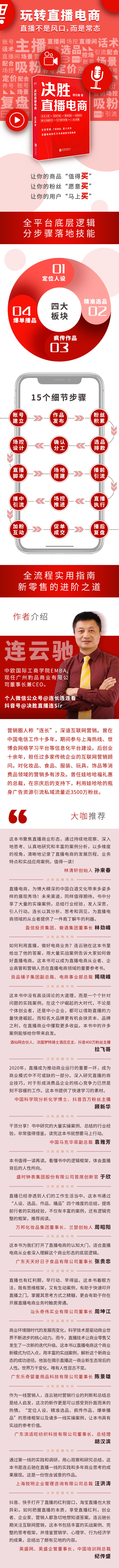 这是一本实用指南,从账号建立开始,经过作品发布、粉丝积累、选品排款、确认分工、场控设计、直播脚本、场地搭建、播前引流、直播执行、场控推进、播中引流、加粉互