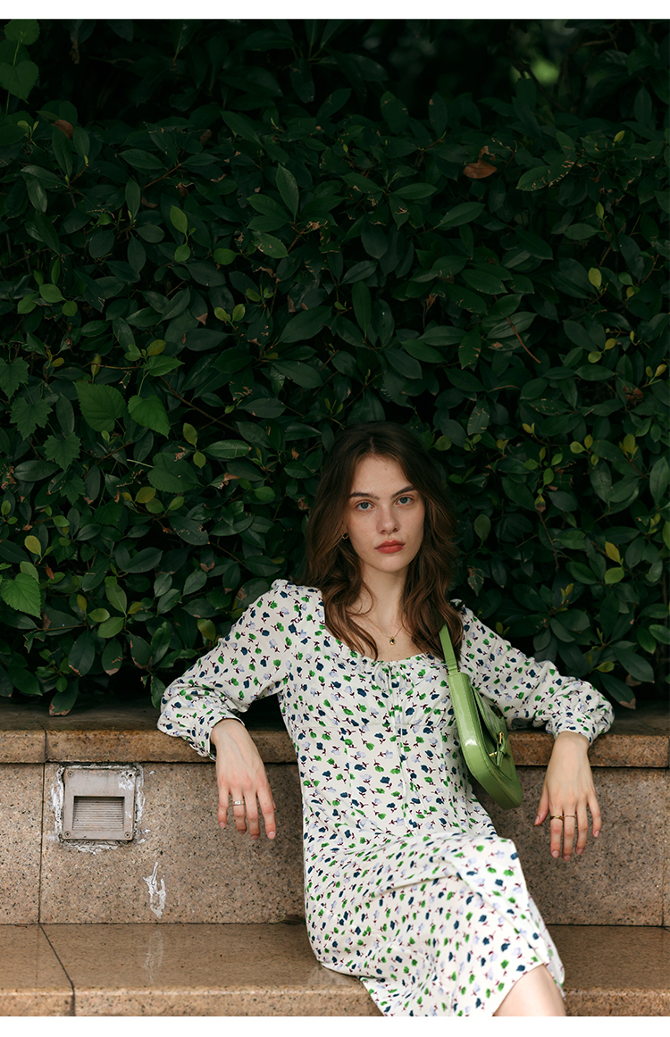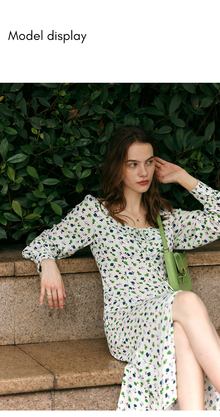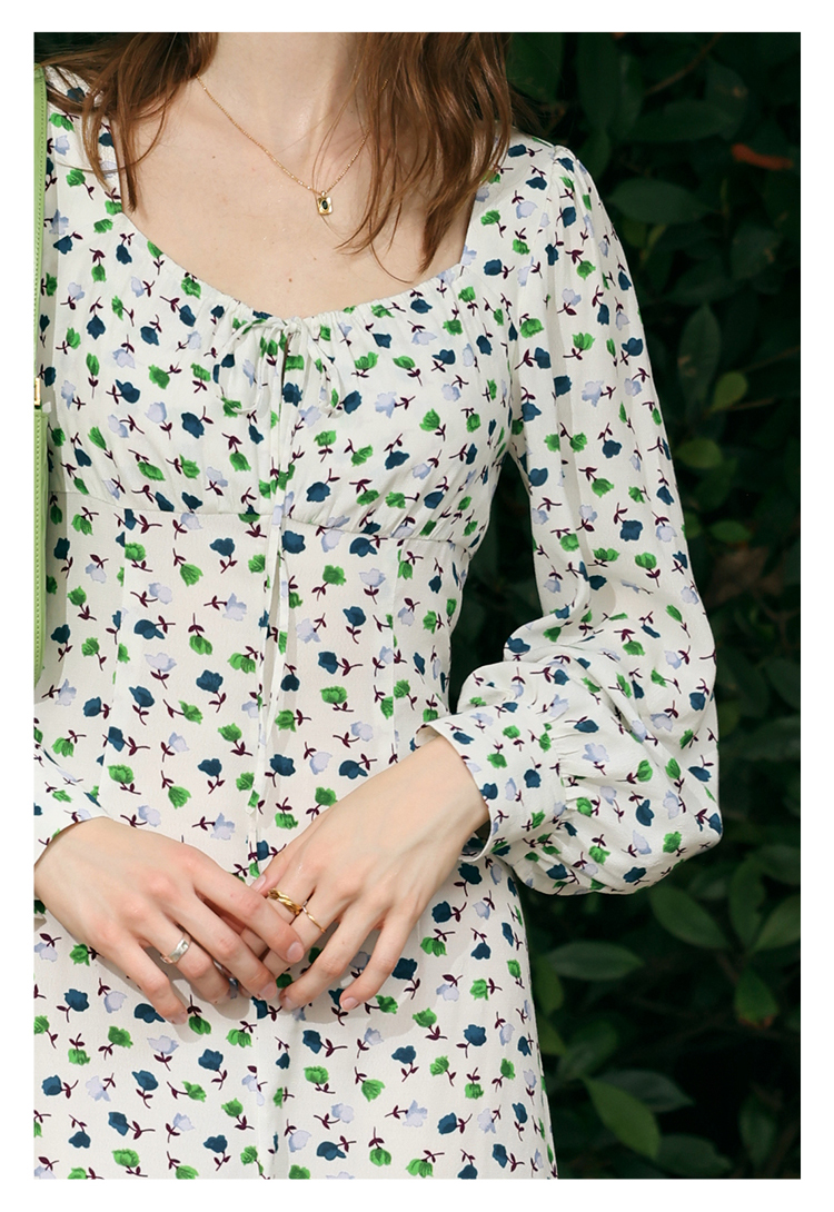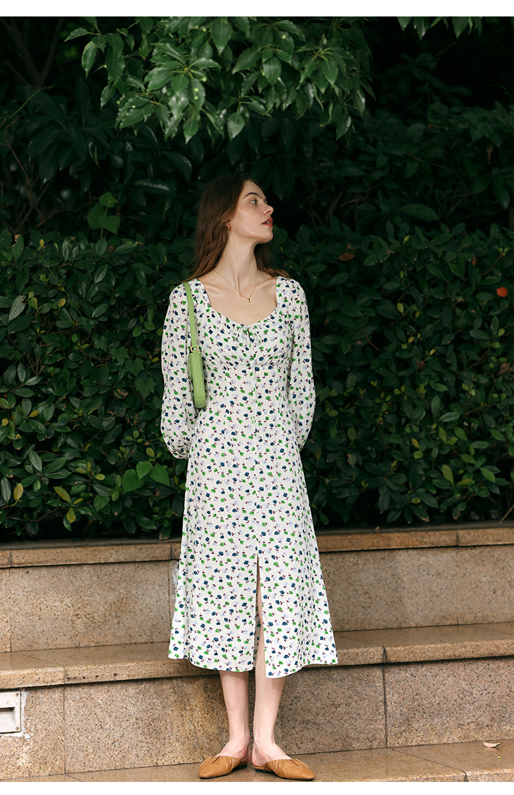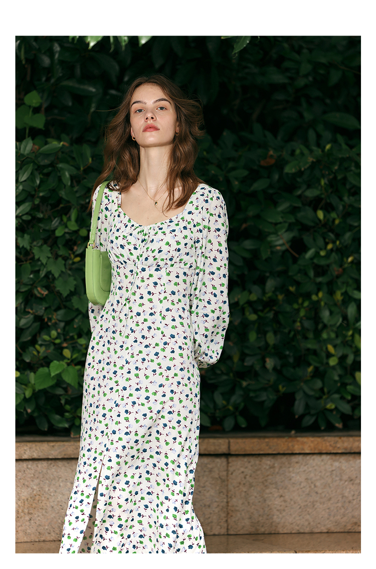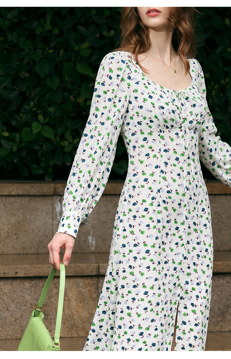 【周四精选福利】HeyDress法式方领连衣裙女复古收腰开叉设计长袖气质碎花裙子