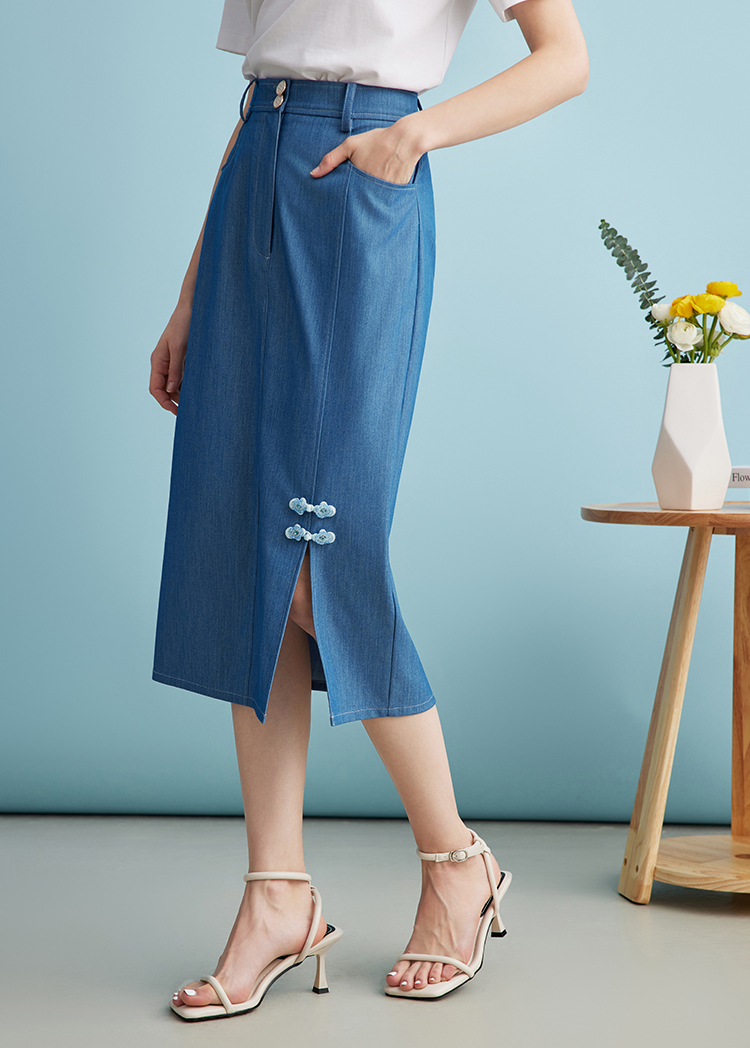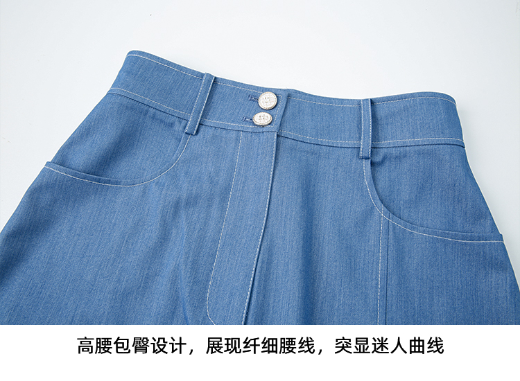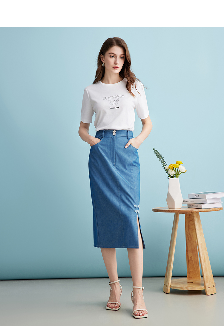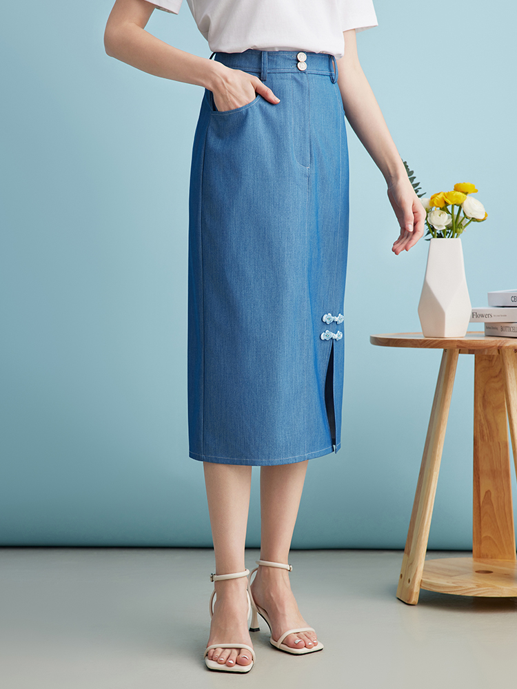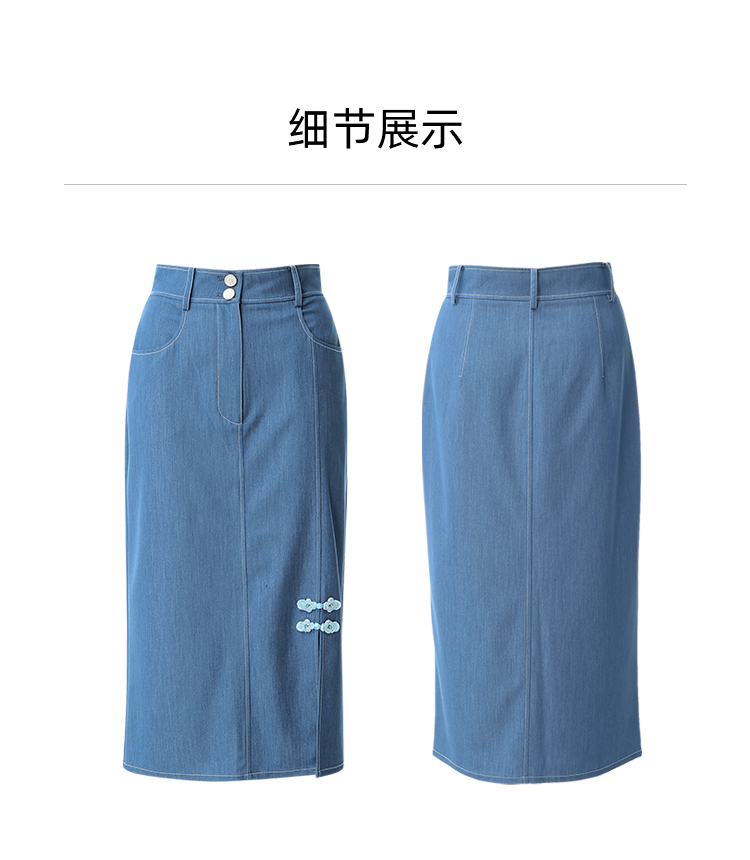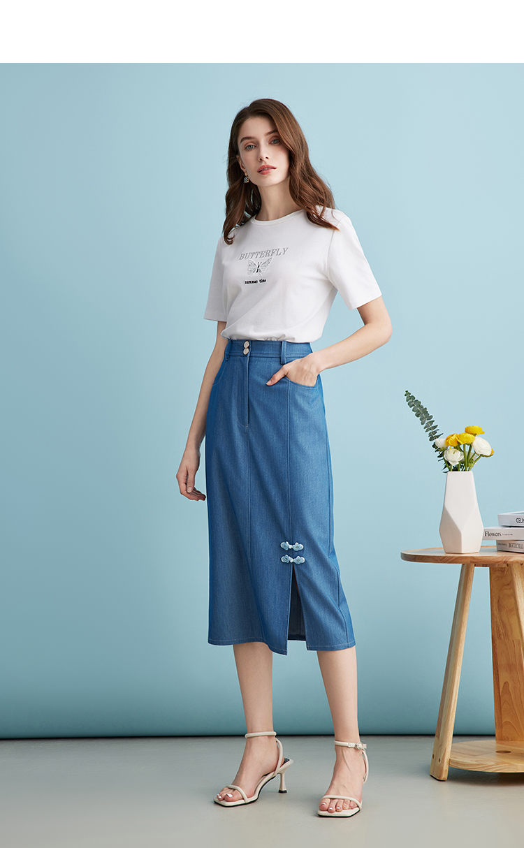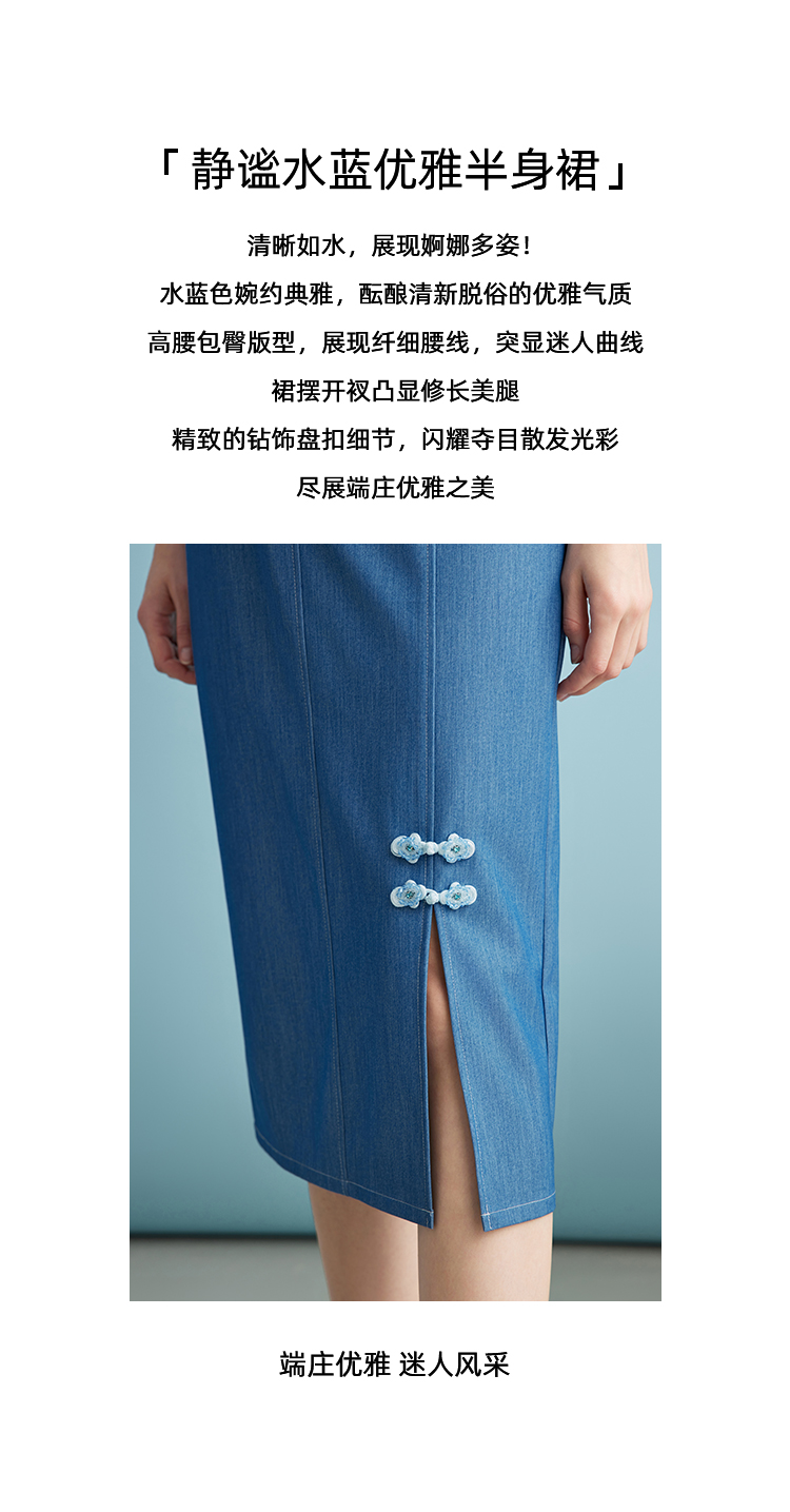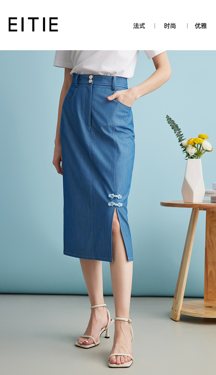 EITIE爱特爱夏季新款时尚复古高腰包臀中式盘扣牛仔蓝半身裙B2406314