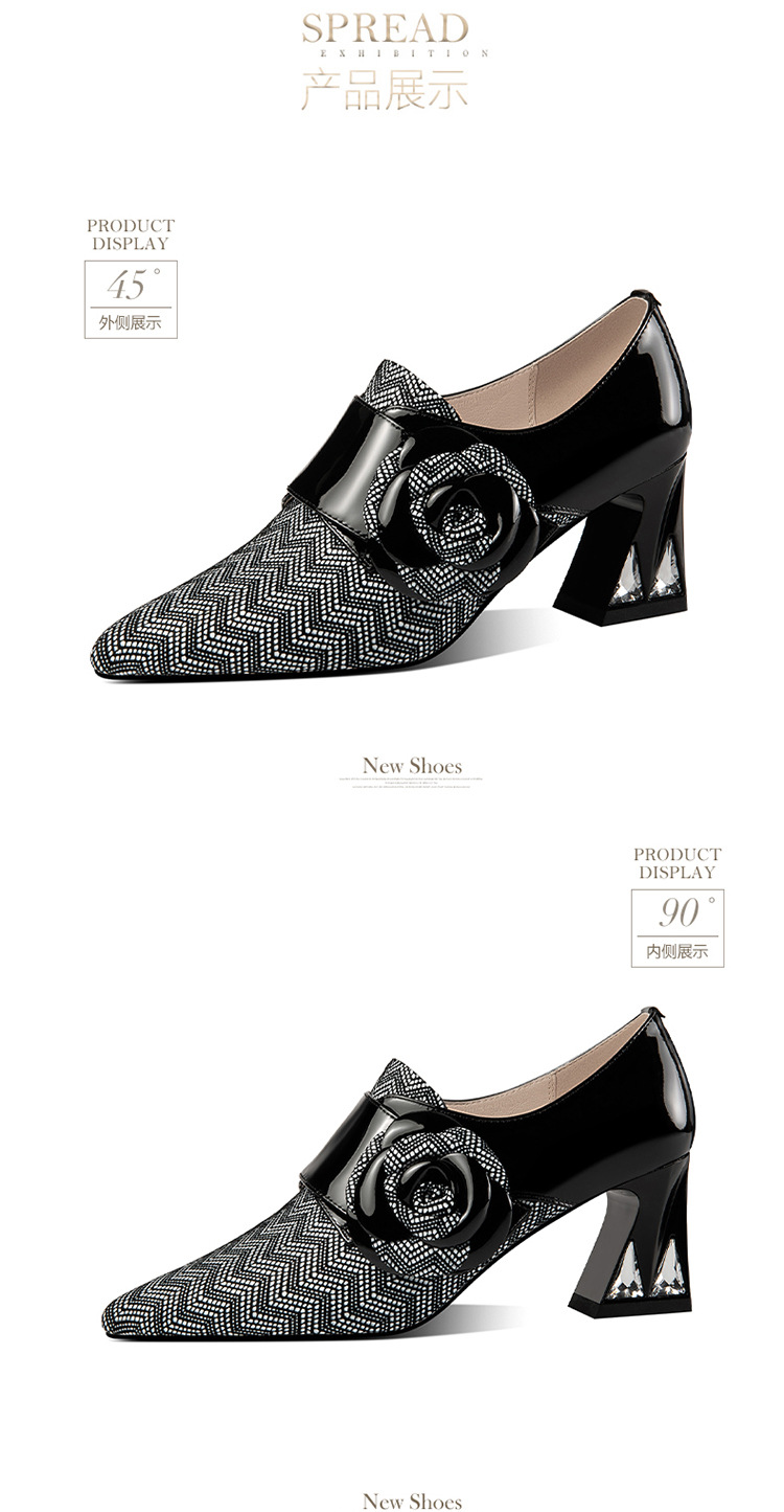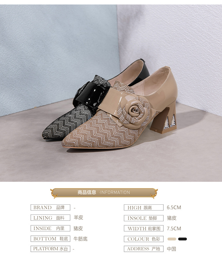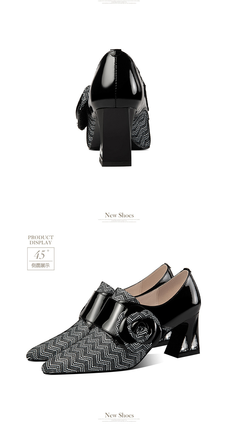 秋冬季新款,深口粗跟气质拼色女鞋尖头高跟鞋花朵单鞋QS-2418