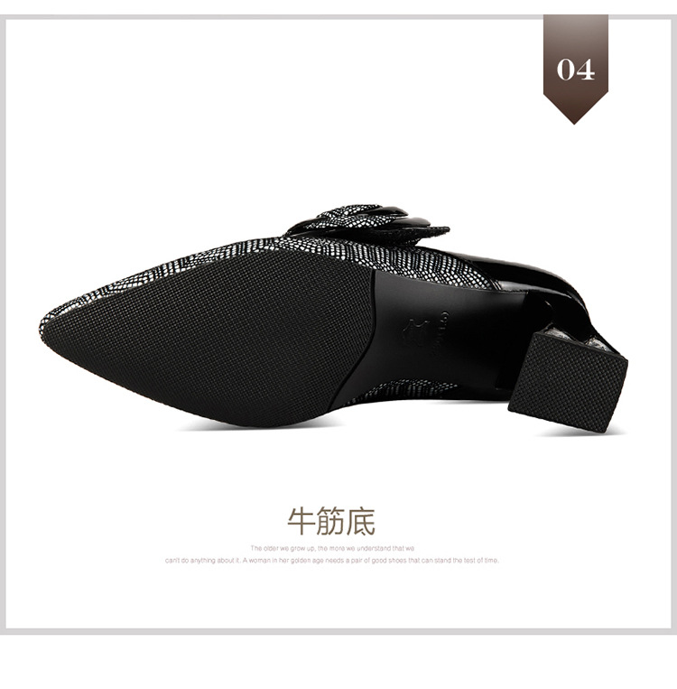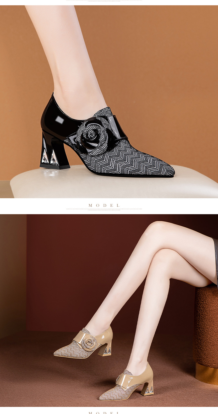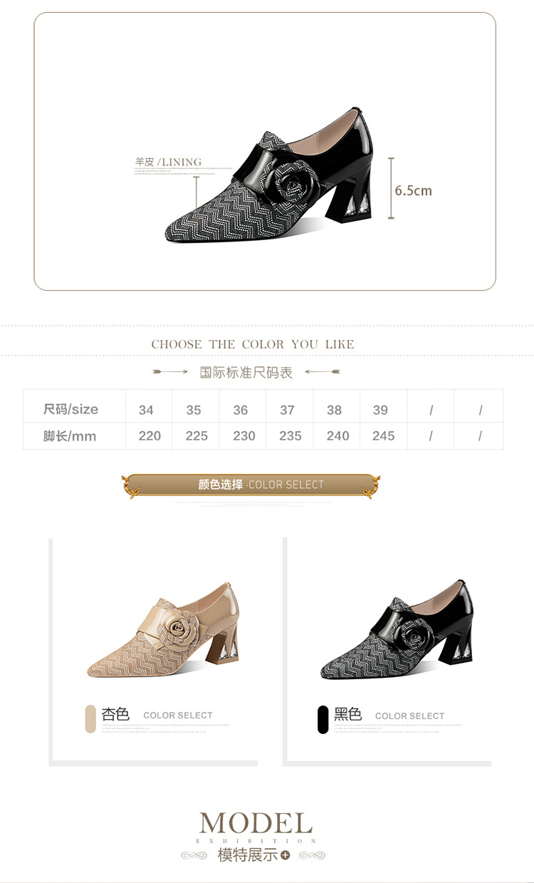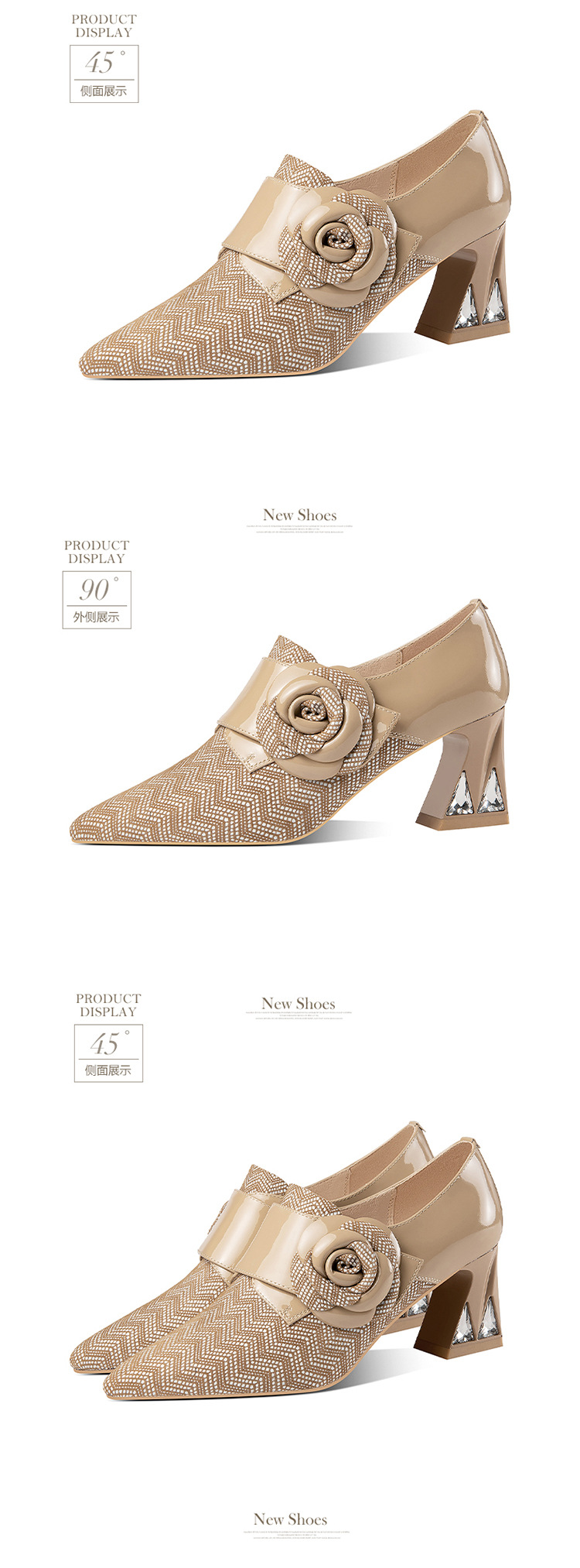 秋冬季新款,深口粗跟气质拼色女鞋尖头高跟鞋花朵单鞋QS-2418