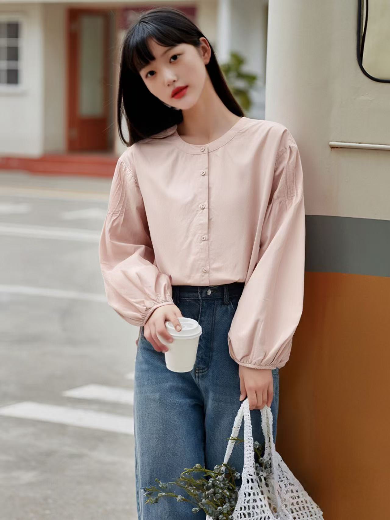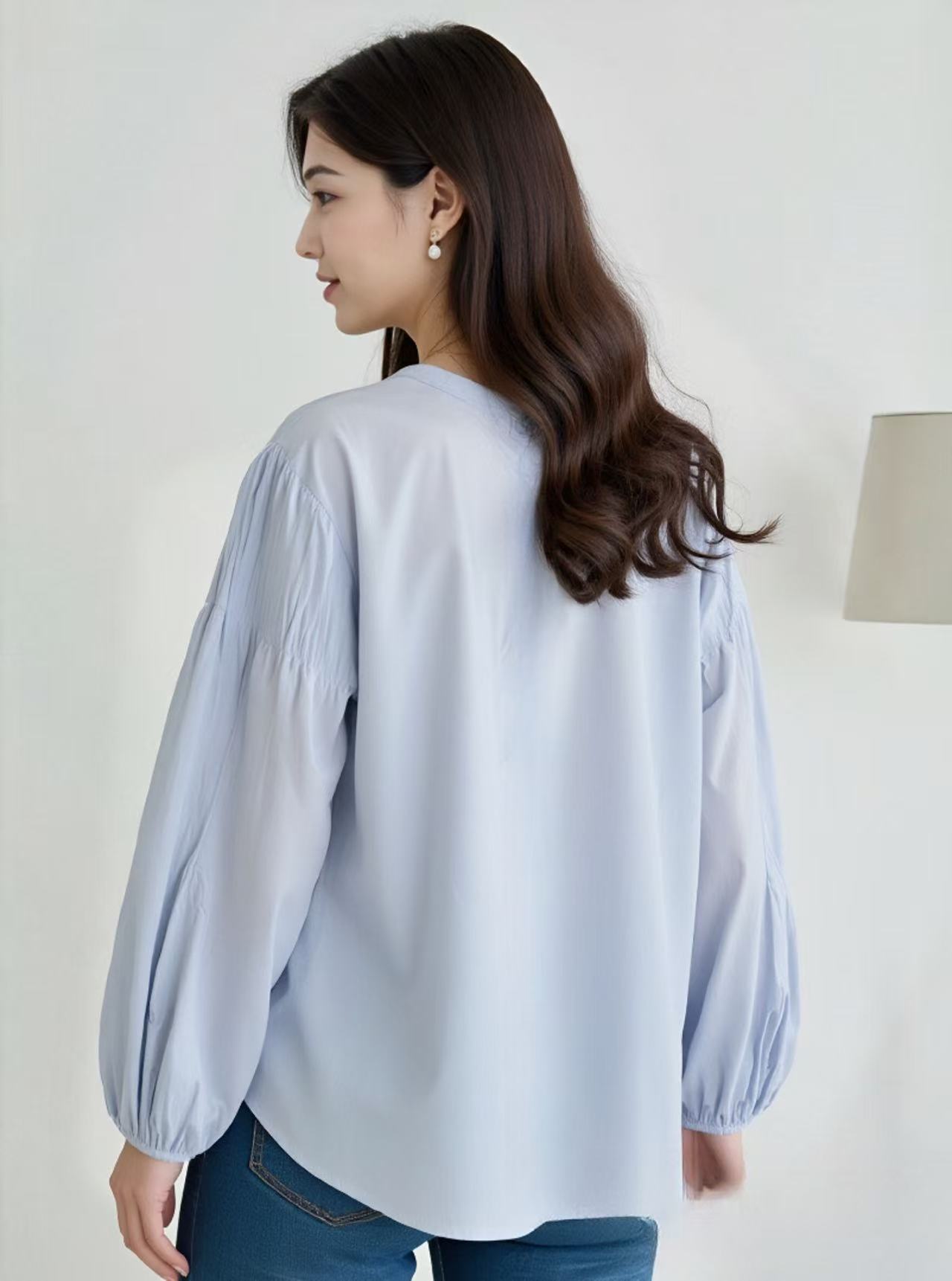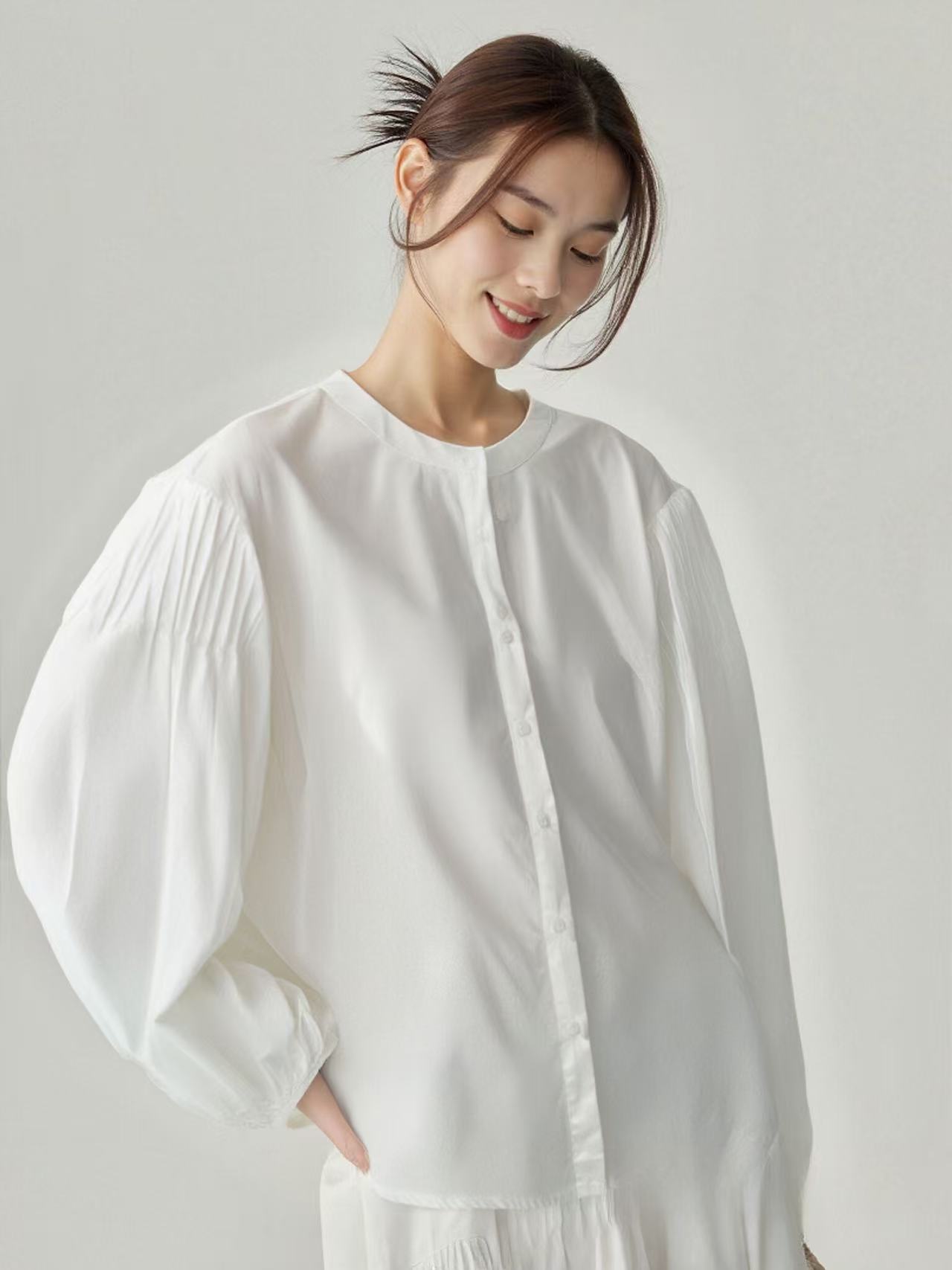 【秋新品)古泥品牌7868 100%棉泡泡袖圆领宽松衬衫-喜出