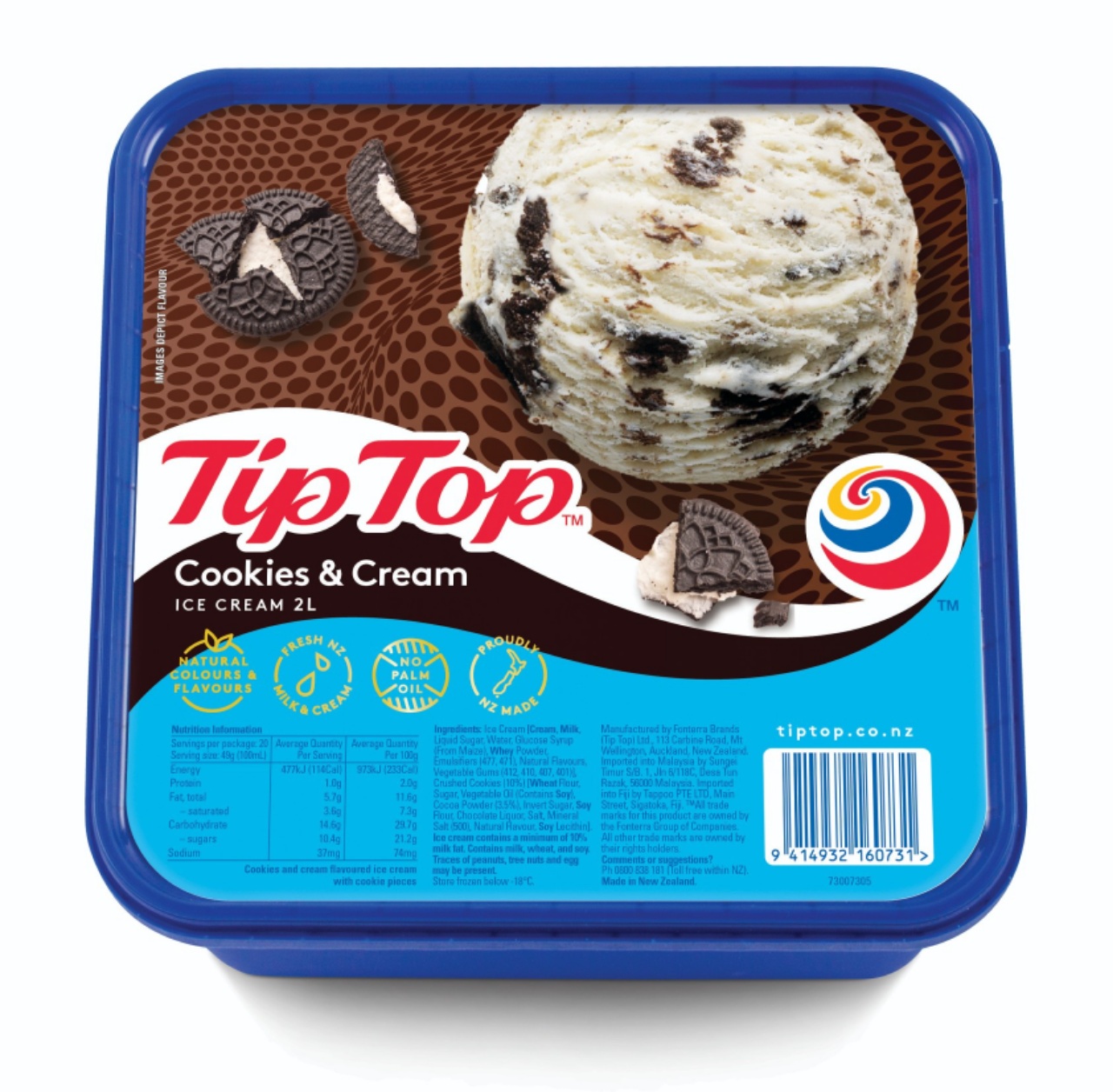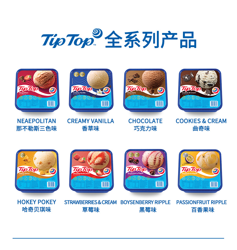 TipTop曲奇味冰淇淋,荣获新西兰冰淇淋金奖,严选新西兰纯净鲜牛奶及鲜奶油制作,轻巧曲奇融入香醇牛奶,口感松滑细腻,稍纵即逝的美味总能让你回味无穷,是风行世界的畅销口味。