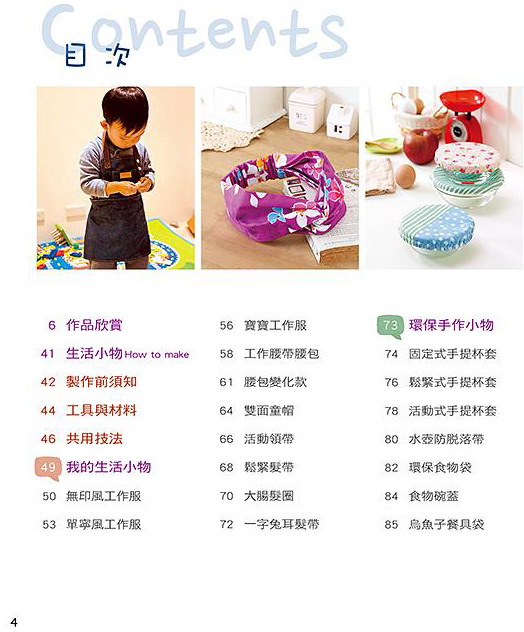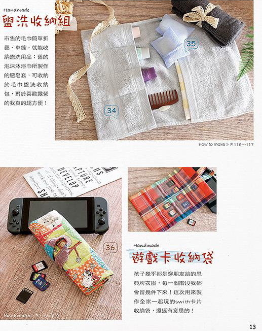 《超實用的機縫生活小物》一書,是以家為中心而創作出的各種布作生活小物,全書三十餘款布作小物都是生活必須的,有呼應環保的各式手提杯套、購物袋、餐具套、食物袋,更甚於個人衛生用品的口罩與布用衛生棉,還有個人穿搭用的髮飾、領帶、帽子、腰包與工作服,也有生活所須需的面紙套、抱枕、豆豆毯、晒衣夾收納袋、安全帶手機護套、米袋托特包、餅乾袋零錢包、盥洗收納組、遊戲卡收納袋等等,每一件品都有詳細的圖解教學與實物原寸紙型,對於一些需要變大、縮小的作品更附加製圖、裁布計算公式,讓你真可以一書在手創意無窮!
