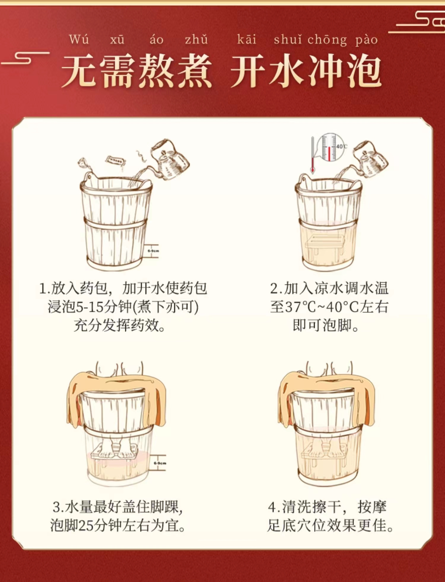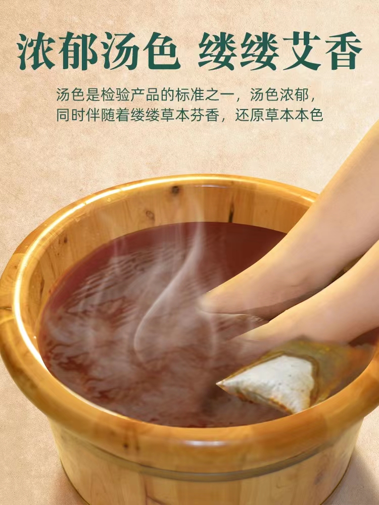 使用方法:每次建议用两袋!热水直接冲烫3分钟左右,水温控制在40℃左右,用手挤压出浓汁药效好。水量建议浸过三阴交,40厘米高度到膝盖最好。