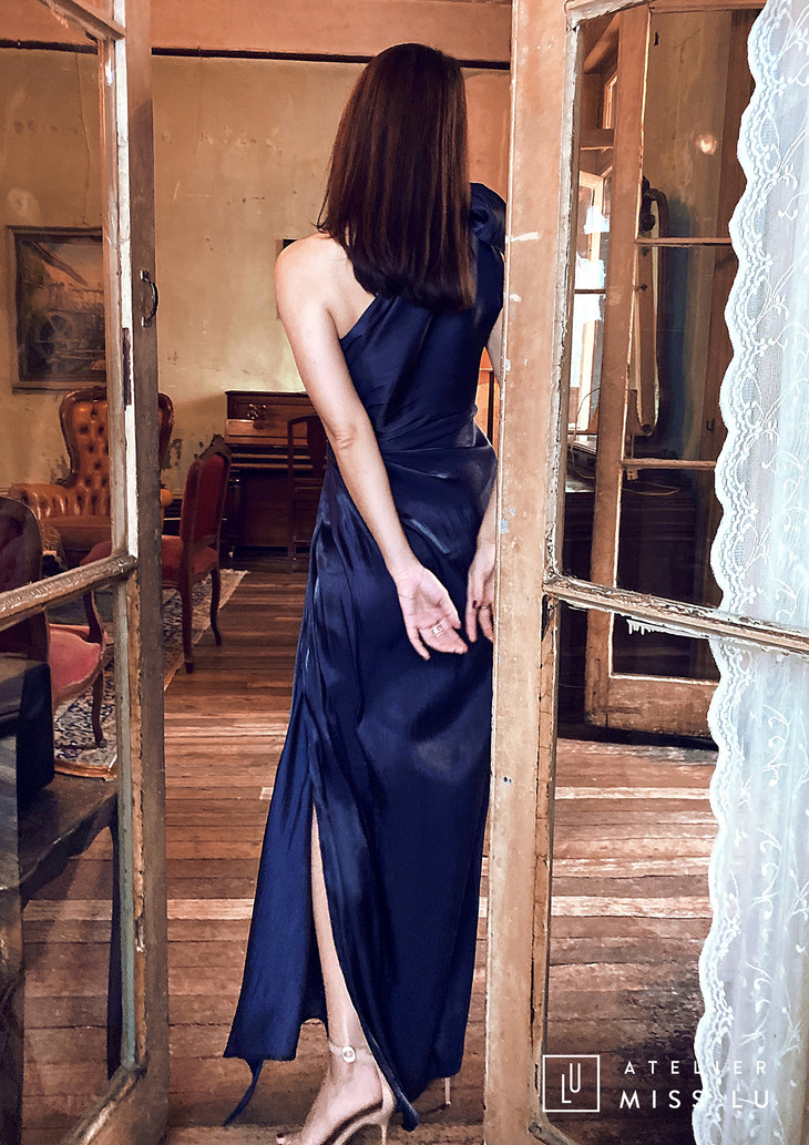 AtelierMissLu / Lucalina-神秘蓝高腰开叉露肩长款连衣裙