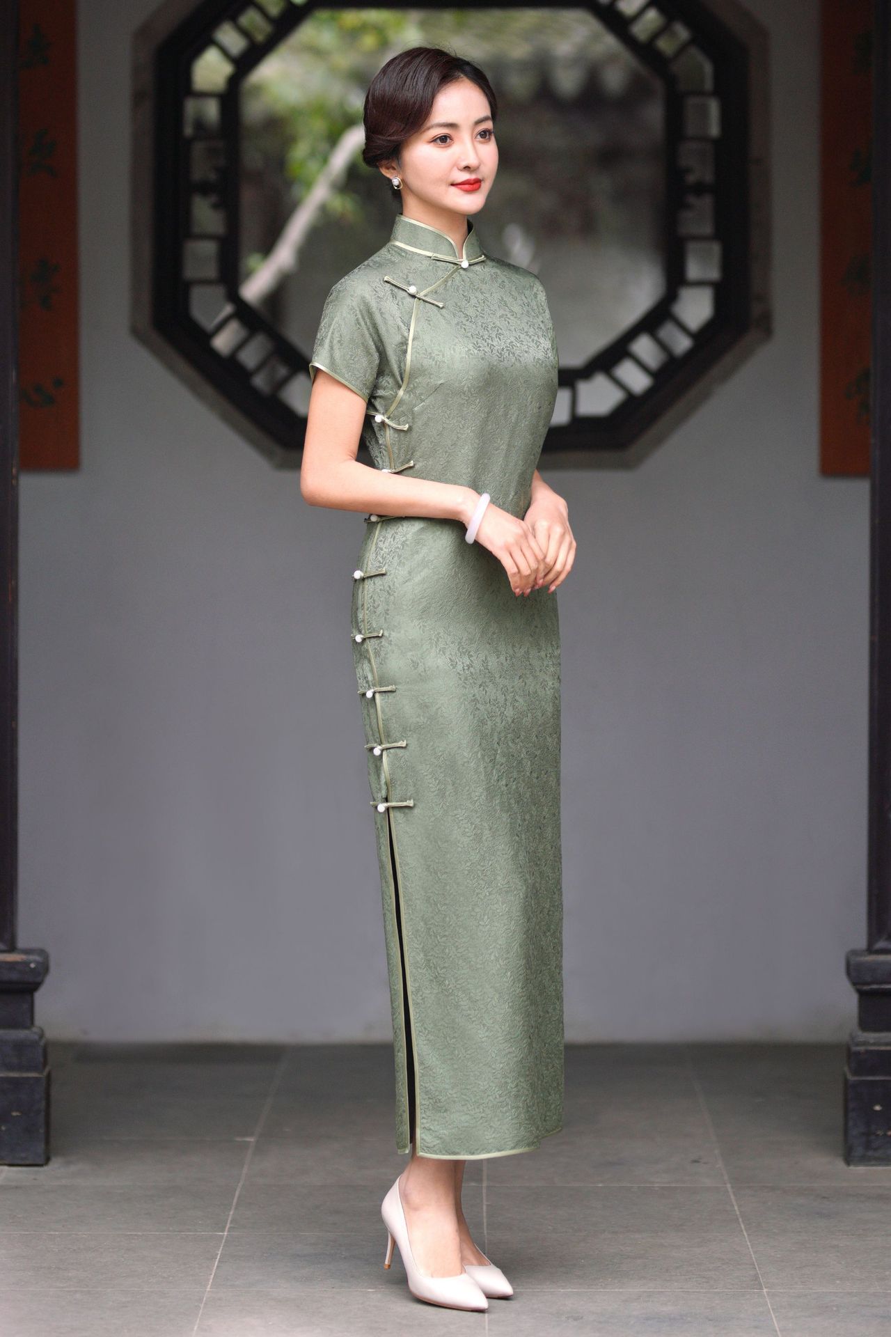 桑蚕丝正娟复古旗袍真襟桑蚕丝提花长旗袍TZRY