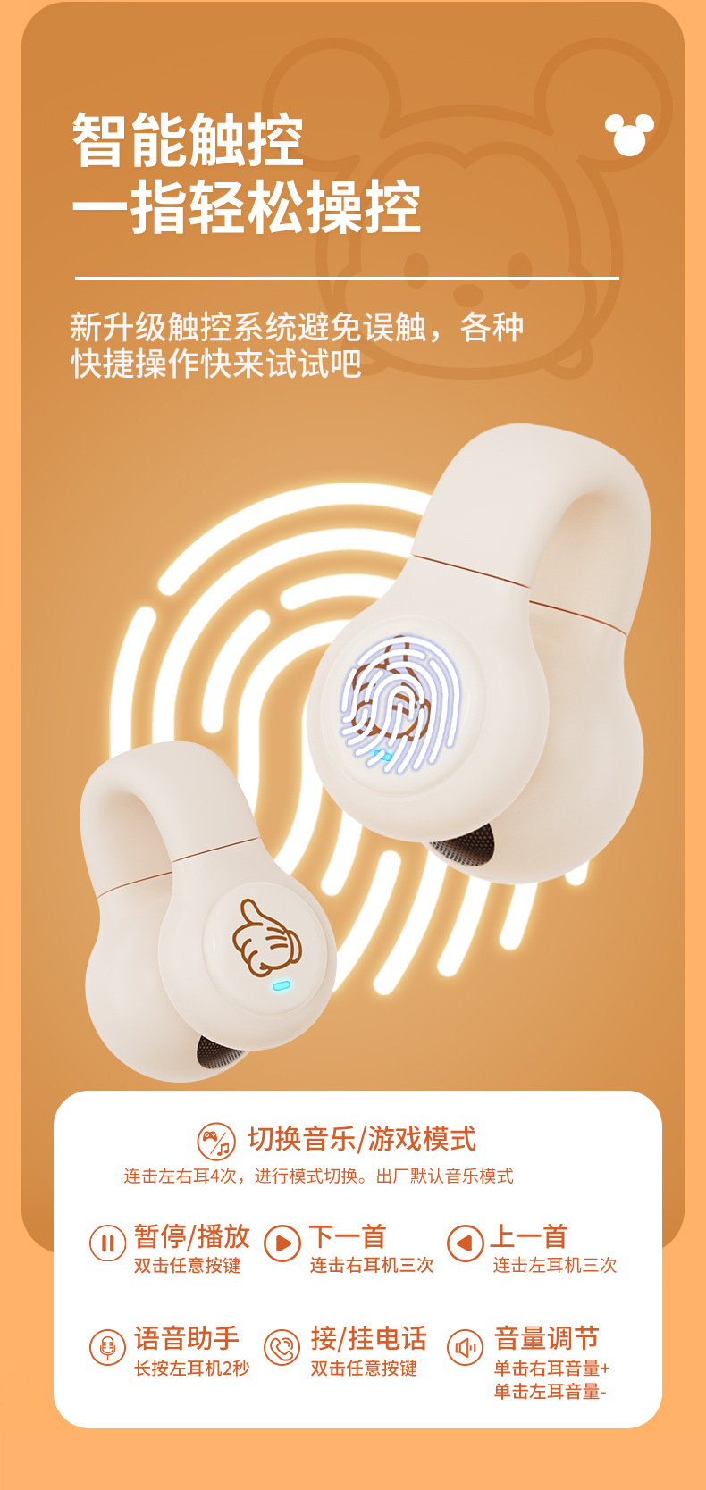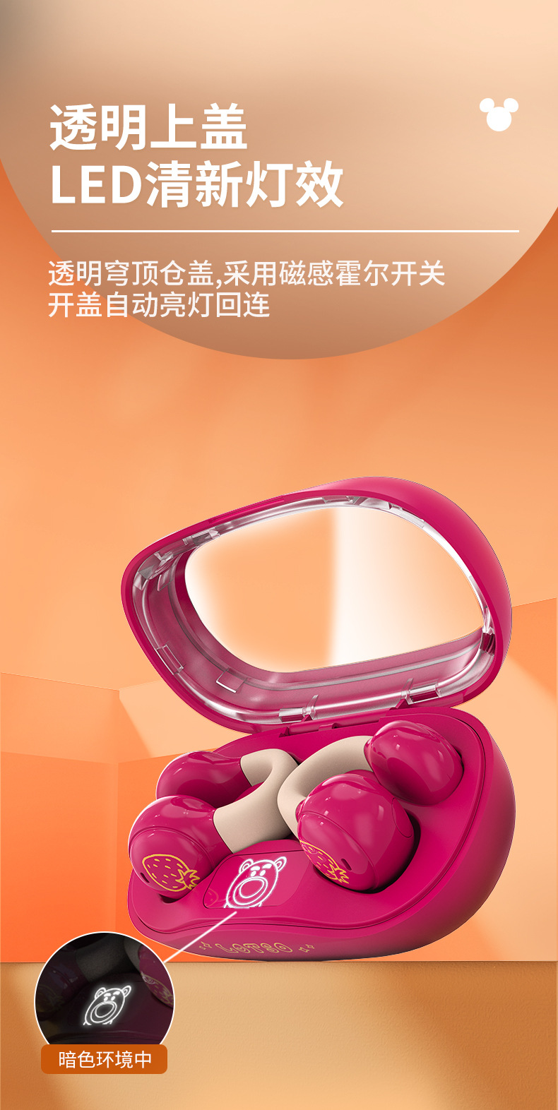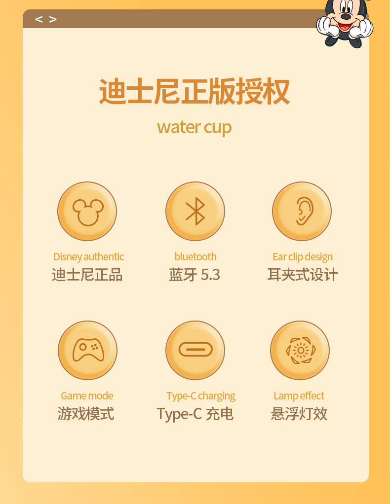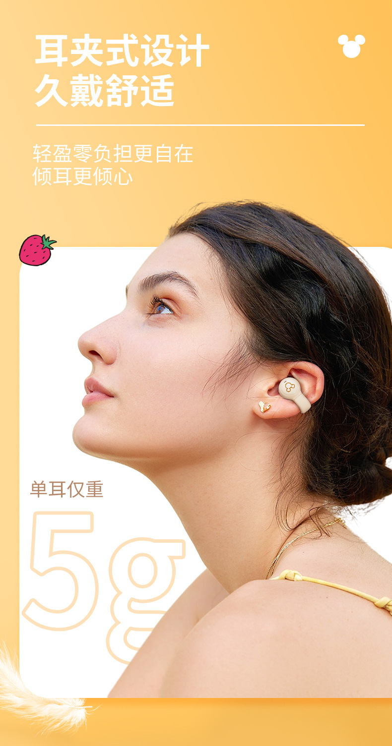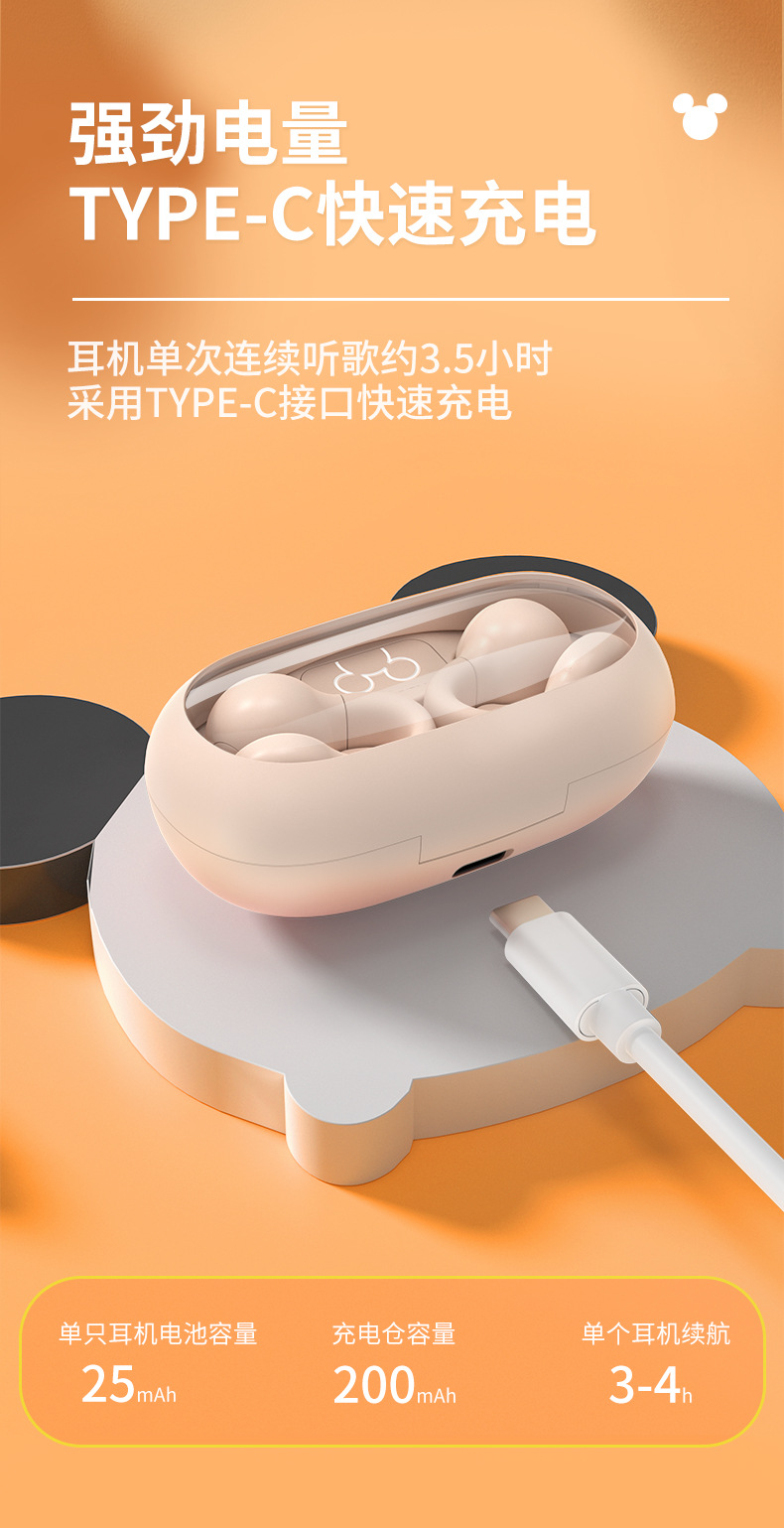 Disny/迪士新款夹耳式蓝牙耳机透明仓开盖即连呼吸灯设计