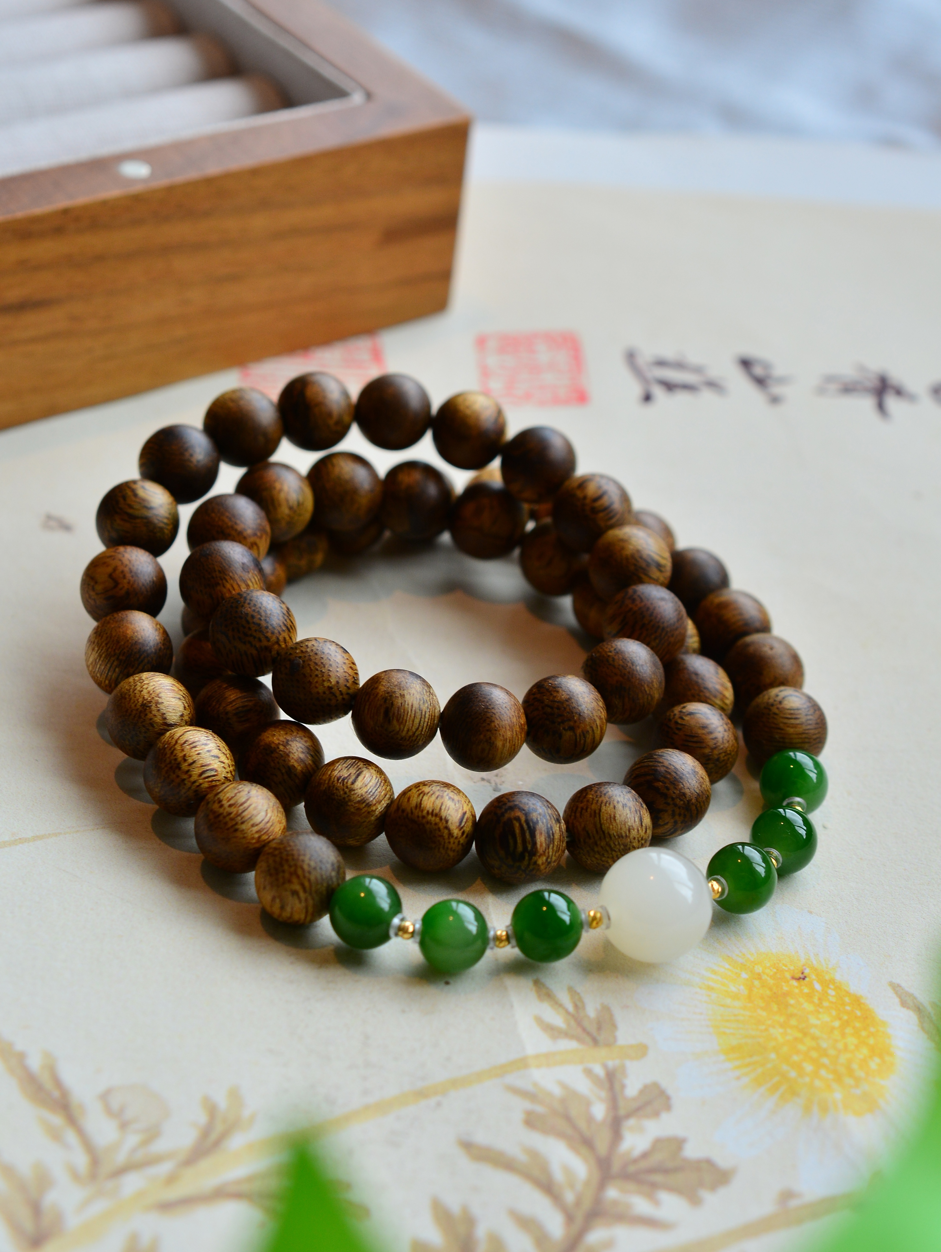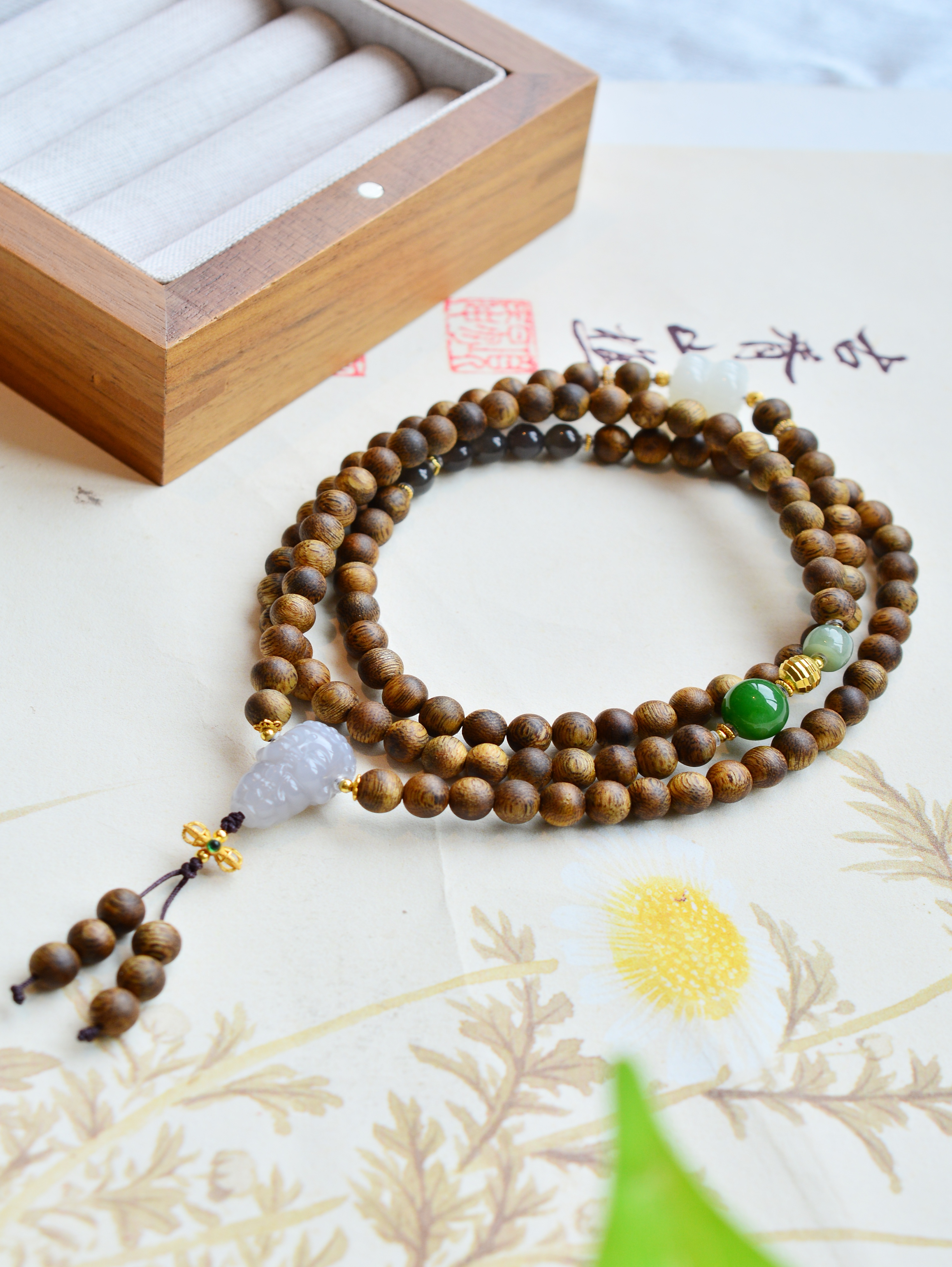 【描述】主珠为沉香圆珠,香韵清新雅致,搭配碧玉、白玉为饰,提升格调与气场,白玉镇场,碧玉旺财,棋楠修心,温润贵气、福慧双全。
