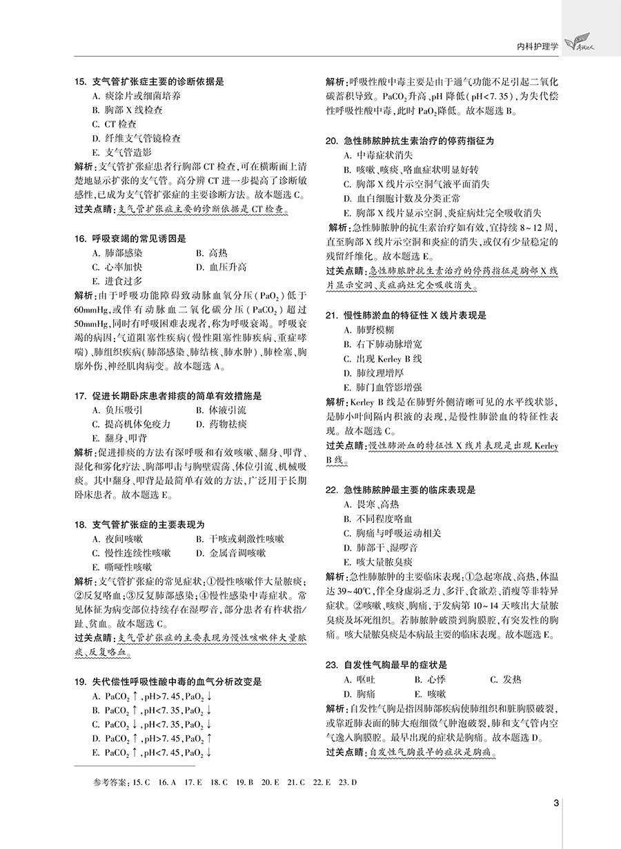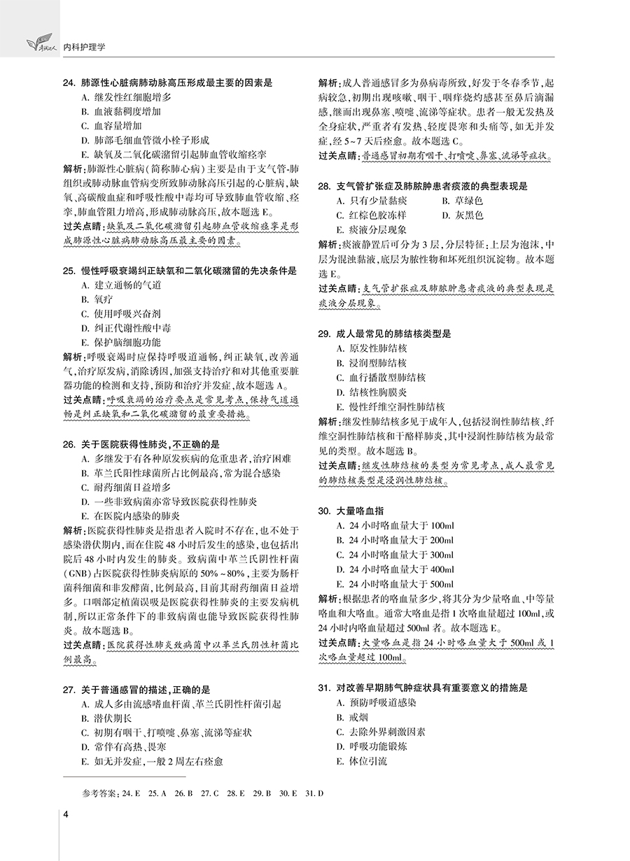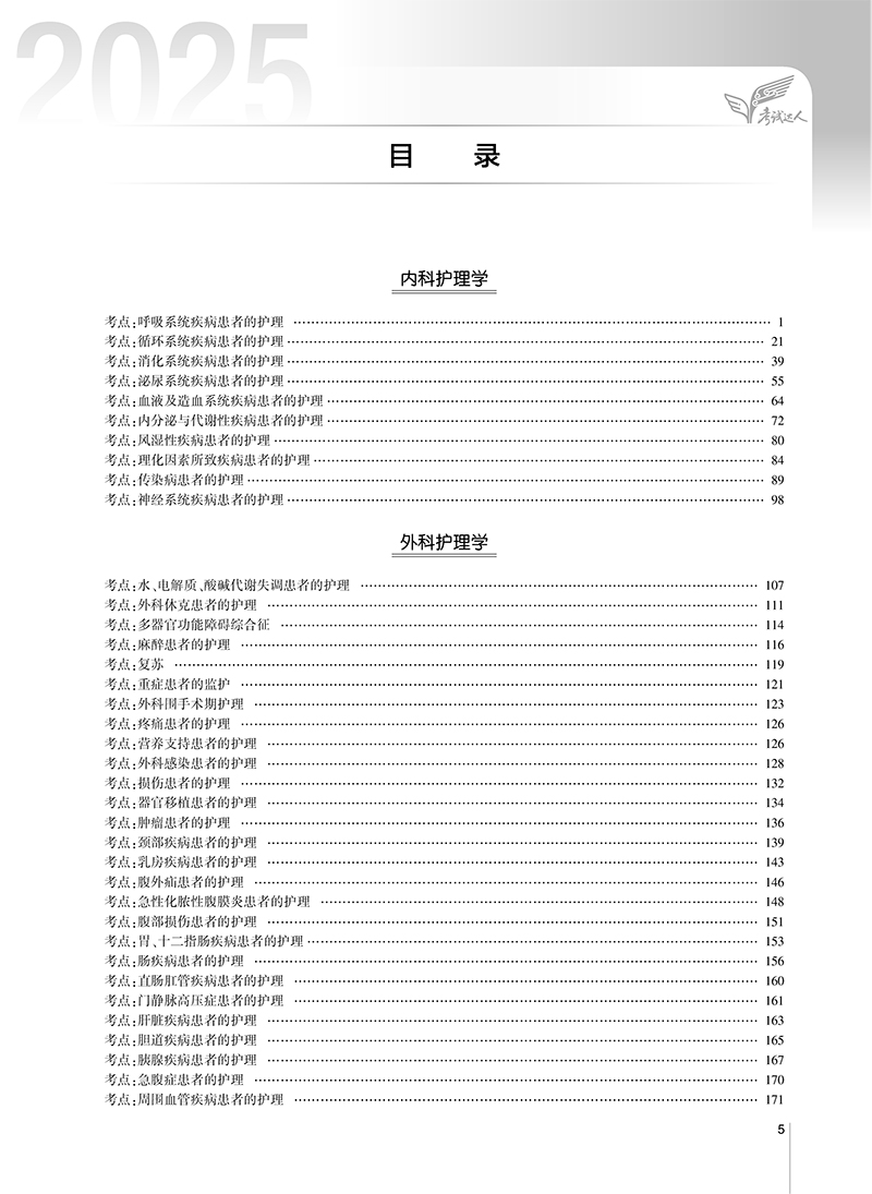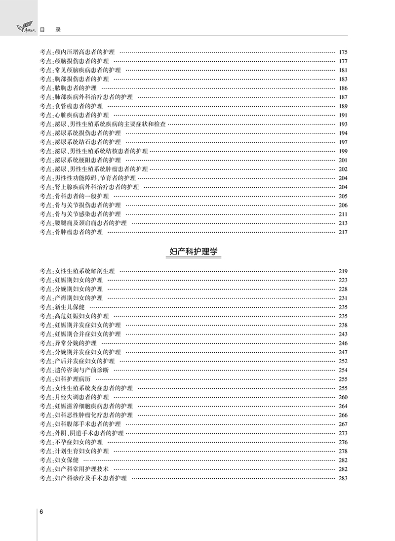 内科护理学 考点:呼吸系统疾病患者的护理 / 1 考点:循环系统疾病患者的护理 / 21 考点:消化系统疾病患者的护理 / 39 考点:泌尿系统疾病患者的护理 / 55 考点:血液及造血系统疾病患者的护理 / 64 考点:内分泌与代谢性疾病患者的护理 / 72 考点:风湿性疾病患者的护理 / 80 考点:理化因素所致疾病患者的护理 / 84 考点:传染病患者的护理 / 89 考点:神经系统疾病患者的护理 / 98 外科护理学 考点:水、电解质、酸碱代谢失调患者的护理 / 107 考点:外科休克患者的护理 / 111 考点:多器官功能障碍综合征 / 114 考点:麻醉患者的护理 / 116 考点:复苏 / 119 考点:重症患者的监护 / 121 考点:外科围手术期护理 / 123 考点:疼痛患者的护理 / 126 考点:营养支持患者的护理 / 126 考点:外科感染患者的护理 / 128 考点:损伤患者的护理 / 132 考点:器官移植患者的护理 / 134 考点:肿瘤患者的护理 / 136 考点:颈部疾病患者的护理 / 139 考点:乳房疾病患者的护理 / 143 考点:腹外疝患者的护理 / 146 考点:急性化脓性腹膜炎患者的护理 / 148 考点:腹部损伤患者的护理 / 151 考点:胃、十二指肠疾病患者的护理 / 153 考点:肠疾病患者的护理 / 156 考点:直肠肛管疾病患者的护理 / 160 考点:门静脉高压症患者的护理 / 161 考点:肝脏疾病患者的护理 / 163 考点:胆道疾病患者的护理 / 165 考点:胰腺疾病患者的护理 / 167 考点:急腹症患者的护理 / 170 考点:周围血管疾病患者的护理 / 171 考点:颅内压增高患者的护理 / 175 考点:颅脑损伤患者的护理 / 177 考点:常见颅脑疾病患者的护理 / 181 考点:胸部损伤患者的护理 / 183 考点:脓胸患者的护理 / 186 考点:肺部疾病外科治疗患者的护理 / 187 考点:食管癌患者的护理 / 189 考点:心脏疾病患者的护理 / 191 考点:泌尿、男性生殖系统疾病的主要症状和检查 / 193 考点:泌尿系统损伤患者的护理 / 194 考点:泌尿系统结石患者的护理 / 197 考点:泌尿、男性生殖系统结核患者的护理 / 199 考点:泌尿系统梗阻患者的护理 / 201 考点:泌尿、男性生殖系统肿瘤患者的护理 / 202 考点:男性性功能障碍、节育者的护理 / 204 考点:肾上腺疾病外科治疗患者的护理 / 204 考点:骨科患者的一般护理 / 205 考点:骨与关节损伤患者的护理 / 206 考点:骨与关节感染患者的护理 / 211 考点:腰腿痛及颈肩痛患者的护理 / 213 考点:骨肿瘤患者的护理 / 217 妇产科护理学 考点:女性生殖系统解剖生理 / 219 考点:妊娠期妇女的护理 / 223 考点:分娩期妇女的护理 / 228 考点:产褥期妇女的护理 / 231 考点:新生儿保健 / 235 考点:高危妊娠妇女的护理 / 235 考点:妊娠期并发症妇女的护理 / 238 考点:妊娠期合并症妇女的护理 / 243 考点:异常分娩的护理 / 246 考点:分娩期并发症妇女的护理 / 247 考点:产后并发症妇女的护理 / 252 考点:遗传咨询与产前诊断 / 254 考点:妇科护理病历 / 255 考点:女性生殖系统炎症患者的护理 / 255 考点:月经失调患者的护理 / 260 考点:妊娠滋养细胞疾病患者的护理 / 264 考点:妇科恶性肿瘤化疗患者的护理 / 266 考点:妇科腹部手术患者的护理 / 267 考点:外阴、阴道手术患者的护理 / 273 考点:不孕症妇女的护理 / 276 考点:计划生育妇女的护理 / 278 考点:妇女保健 / 282 考点:妇产科常用护理技术 / 282 考点:妇产科诊疗及手术患者护理 / 283 儿科护理学 考点:绪论 / 287 考点:生长发育 / 287 考点:小儿保健 / 291 考点:小儿营养与喂养 / 293 考点:小儿心理、用药护理及护理技术 / 295 考点:新生儿及新生儿疾病患儿的护理 / 297 考点:营养性疾病患儿的护理 / 303 考点:消化系统疾病患儿的护理 / 306 考点:呼吸系统疾病患儿的护理 / 311 考点:循环系统疾病患儿的护理 / 314 考点:血液系统疾病患儿的护理 / 318 考点:泌尿系统疾病患儿的护理 / 322 考点:内分泌系统疾病患儿的护理 / 326 考点:神经系统疾病患儿的护理 / 327 考点:免疫缺陷病和结缔组织病患儿的护理 / 330 考点:遗传性疾病患儿的护理 / 333 考点:常见传染病患儿的护理 / 335 考点:结核病患儿的护理 / 340 考点:寄生虫病患儿的护理 / 343 考点:急性中毒和常见急症患儿的护理 / 344 社区护理学 考点:社区护理概论 / 348 考点:社区护理基本工作方法 / 349 考点:社区家庭护理 / 353 考点:社区重点人群保健 / 357 考点:社区常见慢性疾病患者的护理与管理 / 359 考点:社区常见精神障碍患者的护理与管理 / 363 考点:社区常见传染病患者的护理与管理 / 367 考点:社区急重症患者的现场急救和转诊 / 370 考点:社区康复护理 / 372 考点:社区临终患者关怀与护理 / 374 护理健康教育学 考点:健康教育与健康促进 / 377 考点:人类行为与健康相关行为 / 378 考点:健康传播的方法与技巧 / 383 考点:健康教育的步骤 / 388 考点:医院健康教育 / 391 医院感染护理学 考点:医院感染护理学绪论 / 395 考点:医院感染的微生物学原理 / 396 考点:医院感染监测 / 398 考点:消毒与灭菌 / 399 考点:手、皮肤的清洁和消毒 / 404 考点:医院环境的消毒 / 405 考点:隔离与防护 / 407 考点:合理使用抗感染药物 / 409 考点:医院感染与护理管理 / 411 考点:特殊病原菌的感染途径及消毒 / 414 护理管理学 考点:绪论 / 418 考点:管理理论在护理管理中的应用 / 419 考点:计划 / 420 考点:组织 / 424 考点:护理人力资源管理 / 427 考点:领导 / 430 考点:组织沟通 / 432 考点:冲突与协调 / 435 考点:控制工作 / 437 考点:护理质量管理 / 438 中医护理学 考点:阴