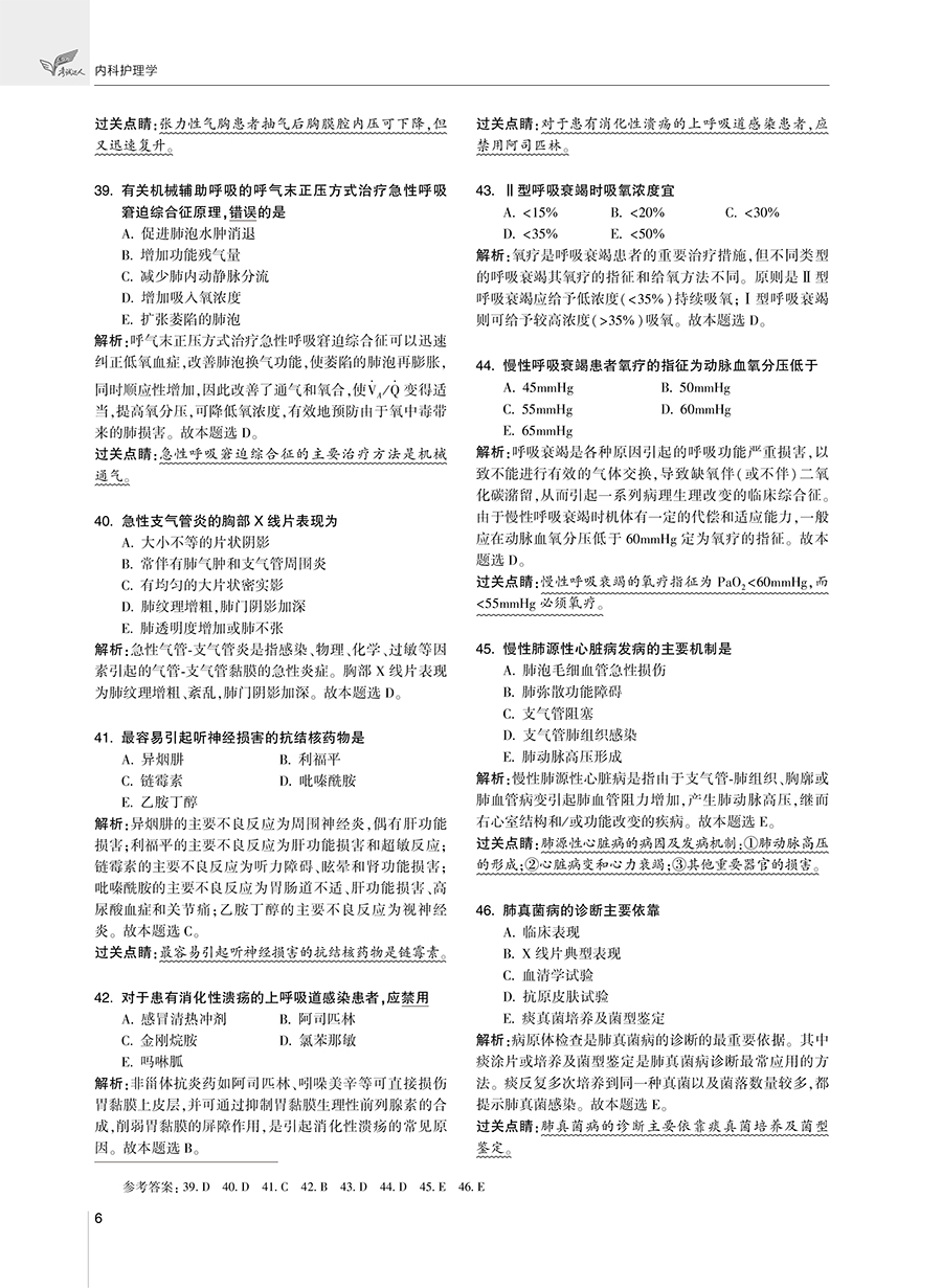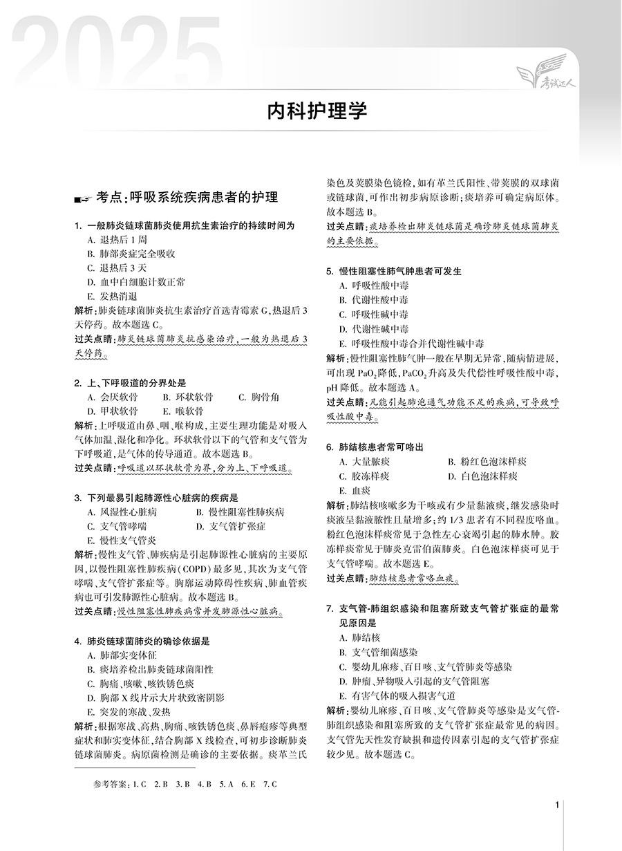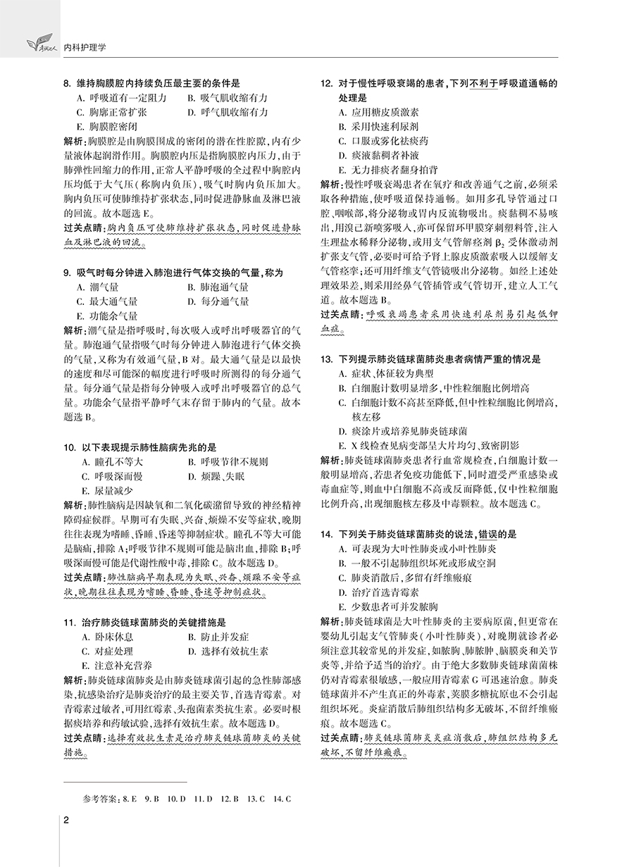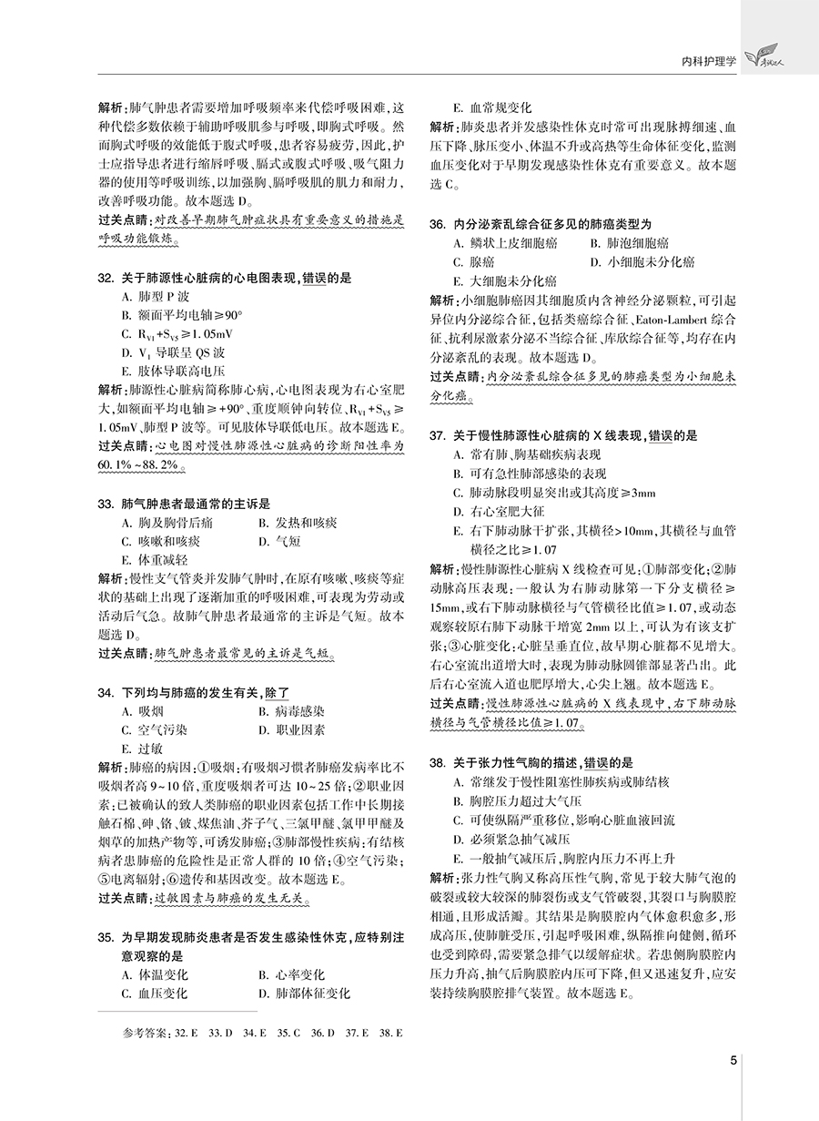 内科护理学 考点:呼吸系统疾病患者的护理 / 1 考点:循环系统疾病患者的护理 / 21 考点:消化系统疾病患者的护理 / 39 考点:泌尿系统疾病患者的护理 / 55 考点:血液及造血系统疾病患者的护理 / 64 考点:内分泌与代谢性疾病患者的护理 / 72 考点:风湿性疾病患者的护理 / 80 考点:理化因素所致疾病患者的护理 / 84 考点:传染病患者的护理 / 89 考点:神经系统疾病患者的护理 / 98 外科护理学 考点:水、电解质、酸碱代谢失调患者的护理 / 107 考点:外科休克患者的护理 / 111 考点:多器官功能障碍综合征 / 114 考点:麻醉患者的护理 / 116 考点:复苏 / 119 考点:重症患者的监护 / 121 考点:外科围手术期护理 / 123 考点:疼痛患者的护理 / 126 考点:营养支持患者的护理 / 126 考点:外科感染患者的护理 / 128 考点:损伤患者的护理 / 132 考点:器官移植患者的护理 / 134 考点:肿瘤患者的护理 / 136 考点:颈部疾病患者的护理 / 139 考点:乳房疾病患者的护理 / 143 考点:腹外疝患者的护理 / 146 考点:急性化脓性腹膜炎患者的护理 / 148 考点:腹部损伤患者的护理 / 151 考点:胃、十二指肠疾病患者的护理 / 153 考点:肠疾病患者的护理 / 156 考点:直肠肛管疾病患者的护理 / 160 考点:门静脉高压症患者的护理 / 161 考点:肝脏疾病患者的护理 / 163 考点:胆道疾病患者的护理 / 165 考点:胰腺疾病患者的护理 / 167 考点:急腹症患者的护理 / 170 考点:周围血管疾病患者的护理 / 171 考点:颅内压增高患者的护理 / 175 考点:颅脑损伤患者的护理 / 177 考点:常见颅脑疾病患者的护理 / 181 考点:胸部损伤患者的护理 / 183 考点:脓胸患者的护理 / 186 考点:肺部疾病外科治疗患者的护理 / 187 考点:食管癌患者的护理 / 189 考点:心脏疾病患者的护理 / 191 考点:泌尿、男性生殖系统疾病的主要症状和检查 / 193 考点:泌尿系统损伤患者的护理 / 194 考点:泌尿系统结石患者的护理 / 197 考点:泌尿、男性生殖系统结核患者的护理 / 199 考点:泌尿系统梗阻患者的护理 / 201 考点:泌尿、男性生殖系统肿瘤患者的护理 / 202 考点:男性性功能障碍、节育者的护理 / 204 考点:肾上腺疾病外科治疗患者的护理 / 204 考点:骨科患者的一般护理 / 205 考点:骨与关节损伤患者的护理 / 206 考点:骨与关节感染患者的护理 / 211 考点:腰腿痛及颈肩痛患者的护理 / 213 考点:骨肿瘤患者的护理 / 217 妇产科护理学 考点:女性生殖系统解剖生理 / 219 考点:妊娠期妇女的护理 / 223 考点:分娩期妇女的护理 / 228 考点:产褥期妇女的护理 / 231 考点:新生儿保健 / 235 考点:高危妊娠妇女的护理 / 235 考点:妊娠期并发症妇女的护理 / 238 考点:妊娠期合并症妇女的护理 / 243 考点:异常分娩的护理 / 246 考点:分娩期并发症妇女的护理 / 247 考点:产后并发症妇女的护理 / 252 考点:遗传咨询与产前诊断 / 254 考点:妇科护理病历 / 255 考点:女性生殖系统炎症患者的护理 / 255 考点:月经失调患者的护理 / 260 考点:妊娠滋养细胞疾病患者的护理 / 264 考点:妇科恶性肿瘤化疗患者的护理 / 266 考点:妇科腹部手术患者的护理 / 267 考点:外阴、阴道手术患者的护理 / 273 考点:不孕症妇女的护理 / 276 考点:计划生育妇女的护理 / 278 考点:妇女保健 / 282 考点:妇产科常用护理技术 / 282 考点:妇产科诊疗及手术患者护理 / 283 儿科护理学 考点:绪论 / 287 考点:生长发育 / 287 考点:小儿保健 / 291 考点:小儿营养与喂养 / 293 考点:小儿心理、用药护理及护理技术 / 295 考点:新生儿及新生儿疾病患儿的护理 / 297 考点:营养性疾病患儿的护理 / 303 考点:消化系统疾病患儿的护理 / 306 考点:呼吸系统疾病患儿的护理 / 311 考点:循环系统疾病患儿的护理 / 314 考点:血液系统疾病患儿的护理 / 318 考点:泌尿系统疾病患儿的护理 / 322 考点:内分泌系统疾病患儿的护理 / 326 考点:神经系统疾病患儿的护理 / 327 考点:免疫缺陷病和结缔组织病患儿的护理 / 330 考点:遗传性疾病患儿的护理 / 333 考点:常见传染病患儿的护理 / 335 考点:结核病患儿的护理 / 340 考点:寄生虫病患儿的护理 / 343 考点:急性中毒和常见急症患儿的护理 / 344 社区护理学 考点:社区护理概论 / 348 考点:社区护理基本工作方法 / 349 考点:社区家庭护理 / 353 考点:社区重点人群保健 / 357 考点:社区常见慢性疾病患者的护理与管理 / 359 考点:社区常见精神障碍患者的护理与管理 / 363 考点:社区常见传染病患者的护理与管理 / 367 考点:社区急重症患者的现场急救和转诊 / 370 考点:社区康复护理 / 372 考点:社区临终患者关怀与护理 / 374 护理健康教育学 考点:健康教育与健康促进 / 377 考点:人类行为与健康相关行为 / 378 考点:健康传播的方法与技巧 / 383 考点:健康教育的步骤 / 388 考点:医院健康教育 / 391 医院感染护理学 考点:医院感染护理学绪论 / 395 考点:医院感染的微生物学原理 / 396 考点:医院感染监测 / 398 考点:消毒与灭菌 / 399 考点:手、皮肤的清洁和消毒 / 404 考点:医院环境的消毒 / 405 考点:隔离与防护 / 407 考点:合理使用抗感染药物 / 409 考点:医院感染与护理管理 / 411 考点:特殊病原菌的感染途径及消毒 / 414 护理管理学 考点:绪论 / 418 考点:管理理论在护理管理中的应用 / 419 考点:计划 / 420 考点:组织 / 424 考点:护理人力资源管理 / 427 考点:领导 / 430 考点:组织沟通 / 432 考点:冲突与协调 / 435 考点:控制工作 / 437 考点:护理质量管理 / 438 中医护理学 考点:阴