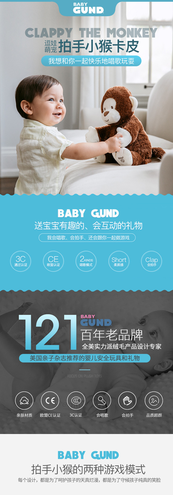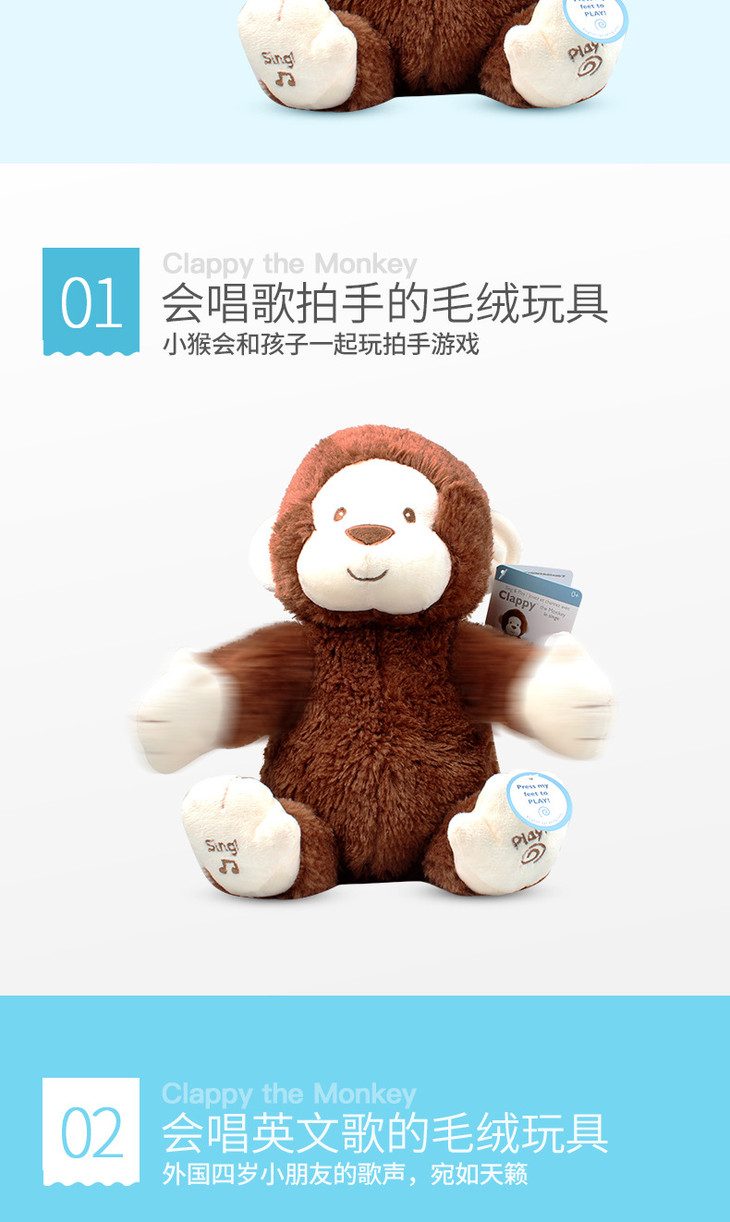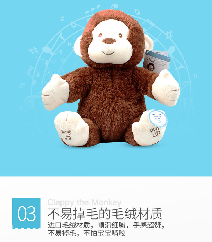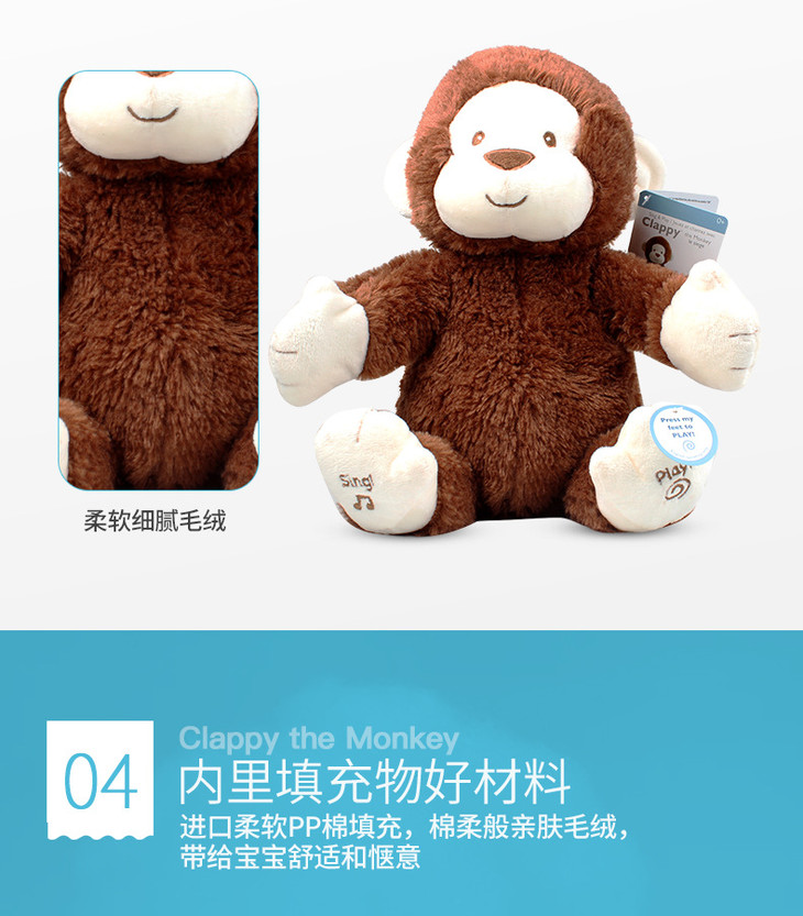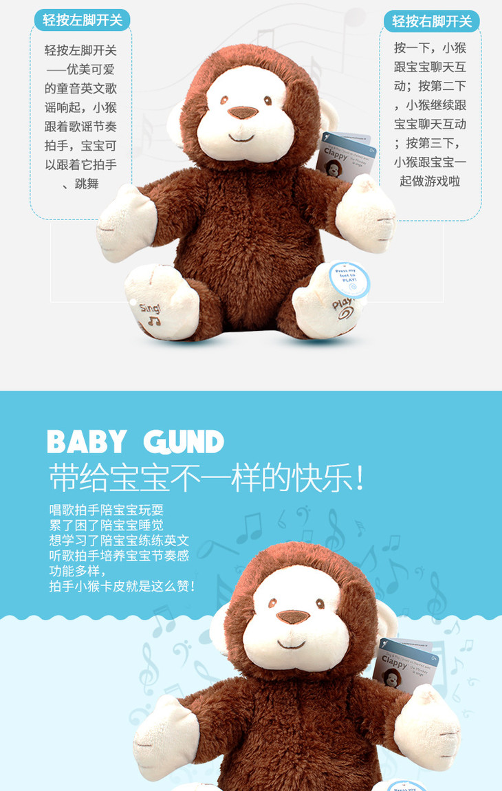 (超值)美国BABY GUND 拍手小猴子安抚玩具会唱歌毛绒玩偶公仔