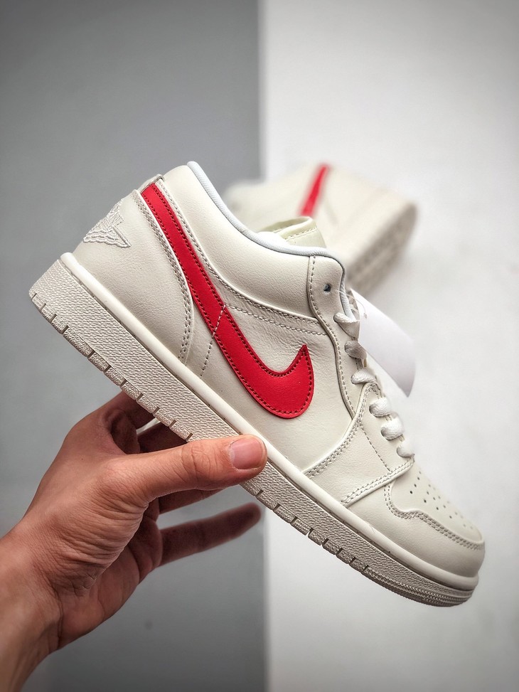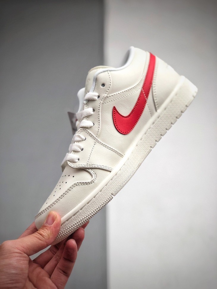 aj1低 Jordan 1 Low“University Red”权志龙 奶白红 大学红 我们先来看一下鞋款的设计,整体的话以奶白色为主,swoosh的部位大学红色点缀,