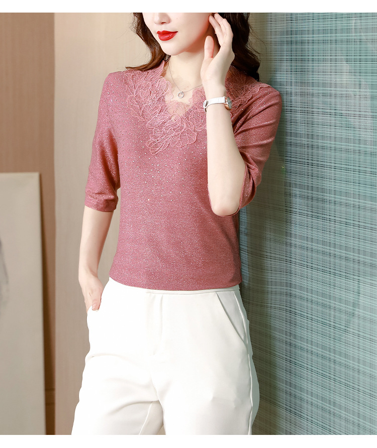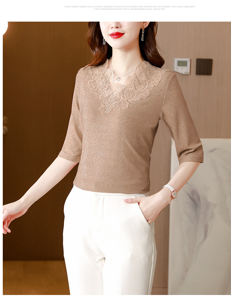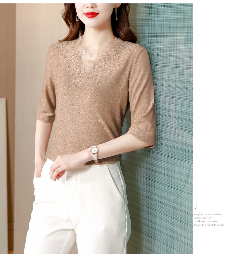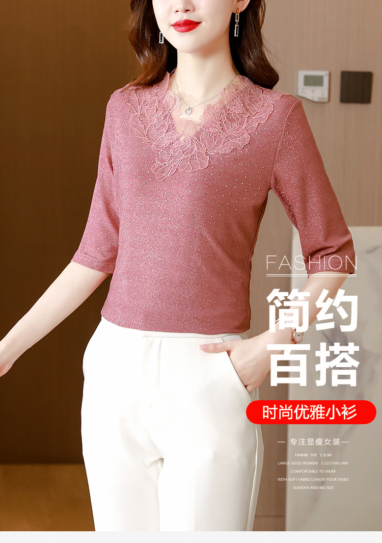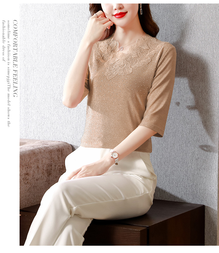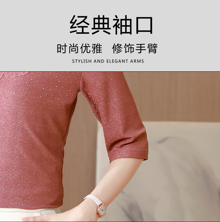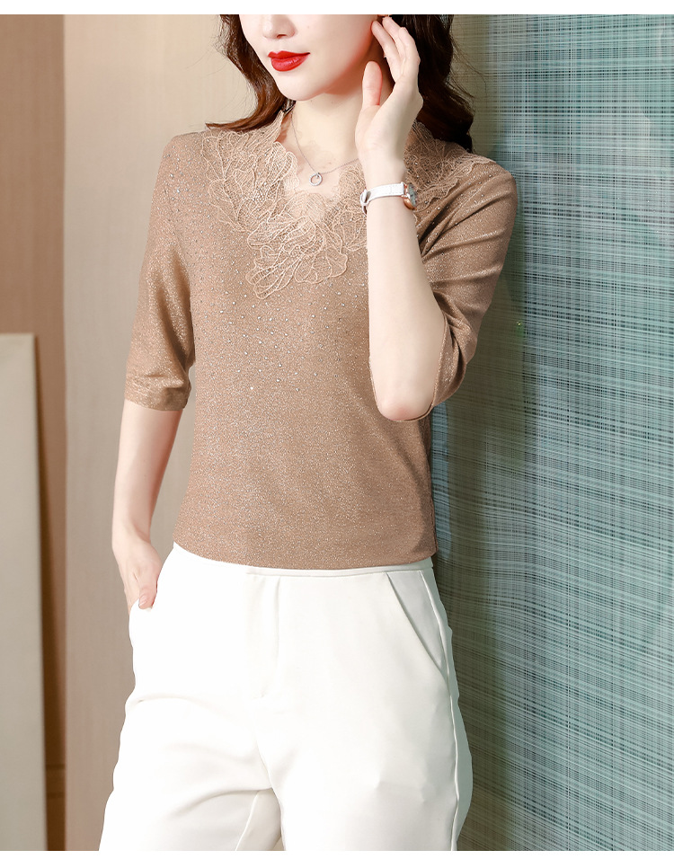 短袖T恤,洋气薄款镂空烫钻蕾丝网纱打底衫KQL-8579