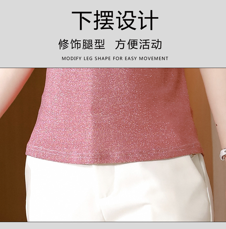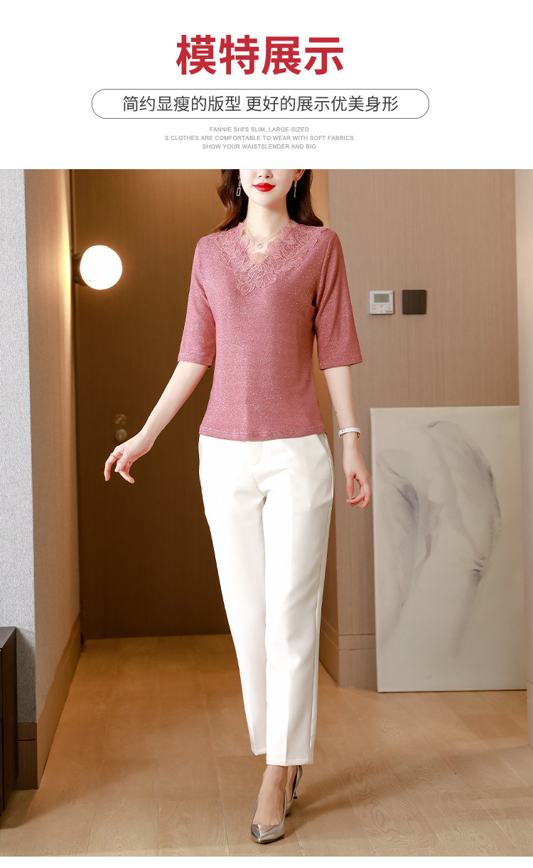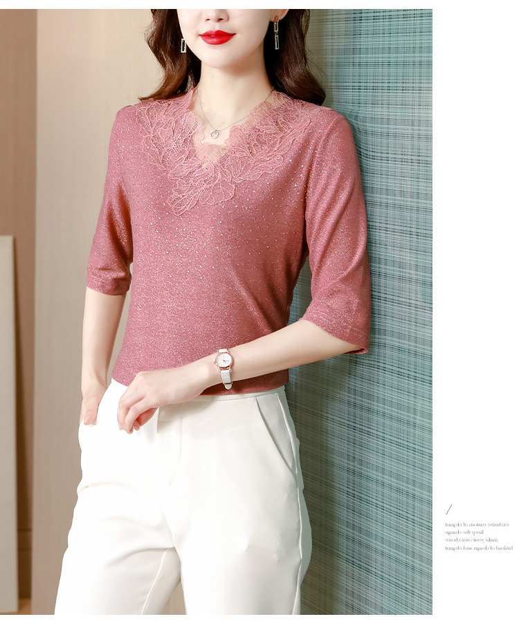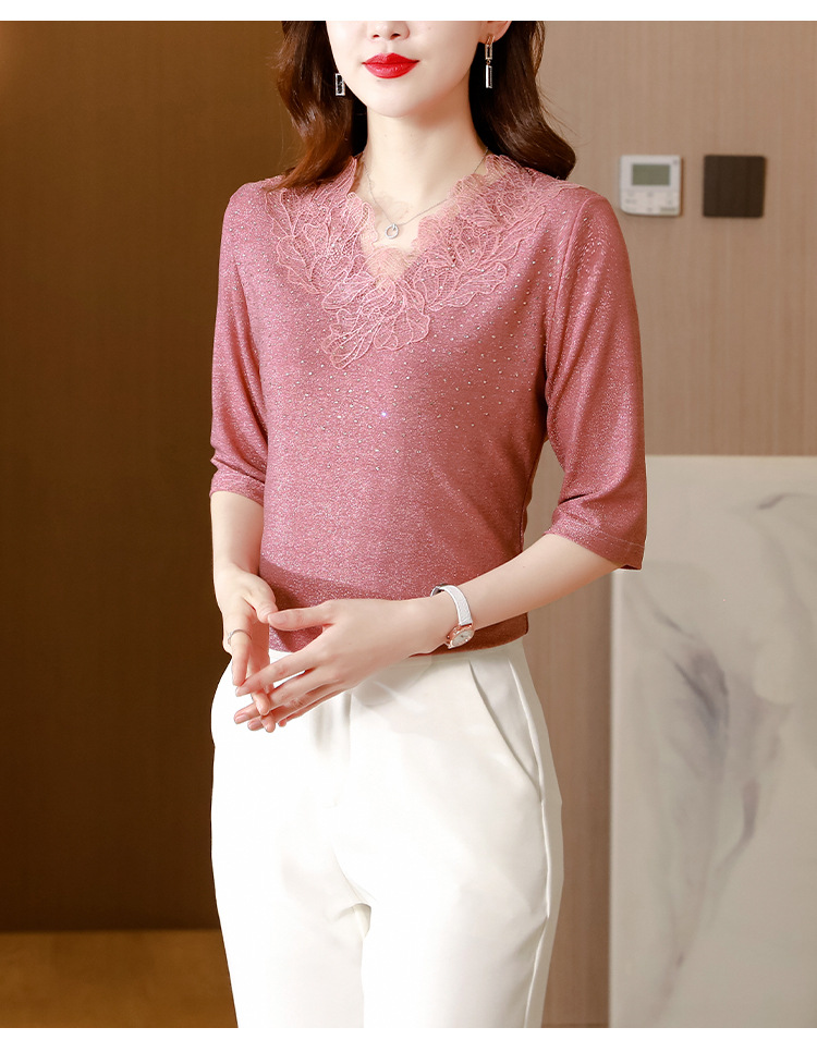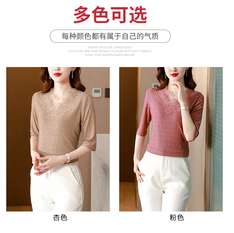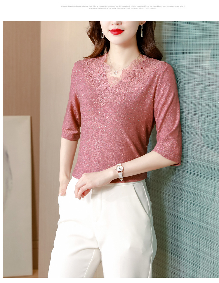 短袖T恤,洋气薄款镂空烫钻蕾丝网纱打底衫KQL-8579