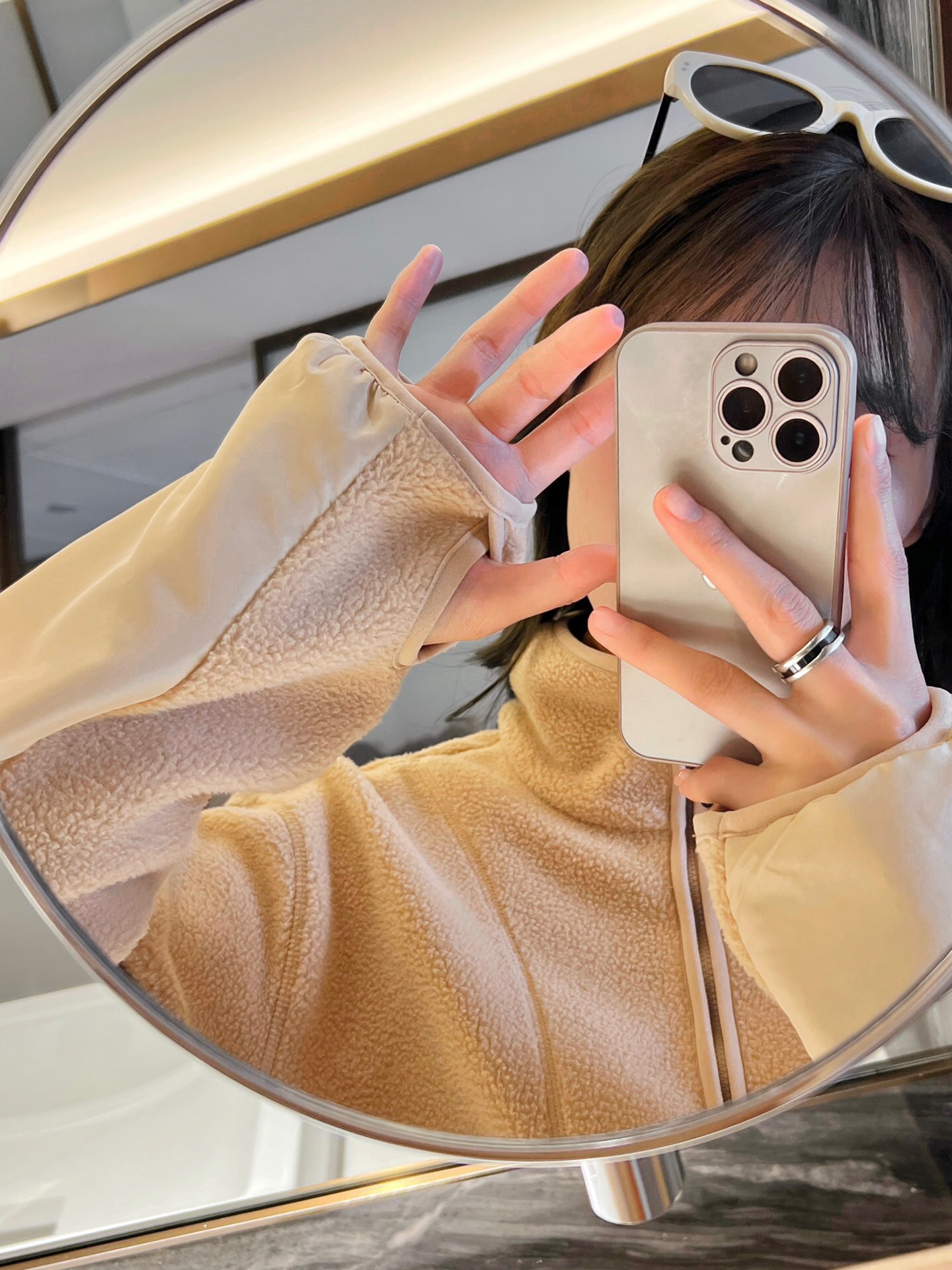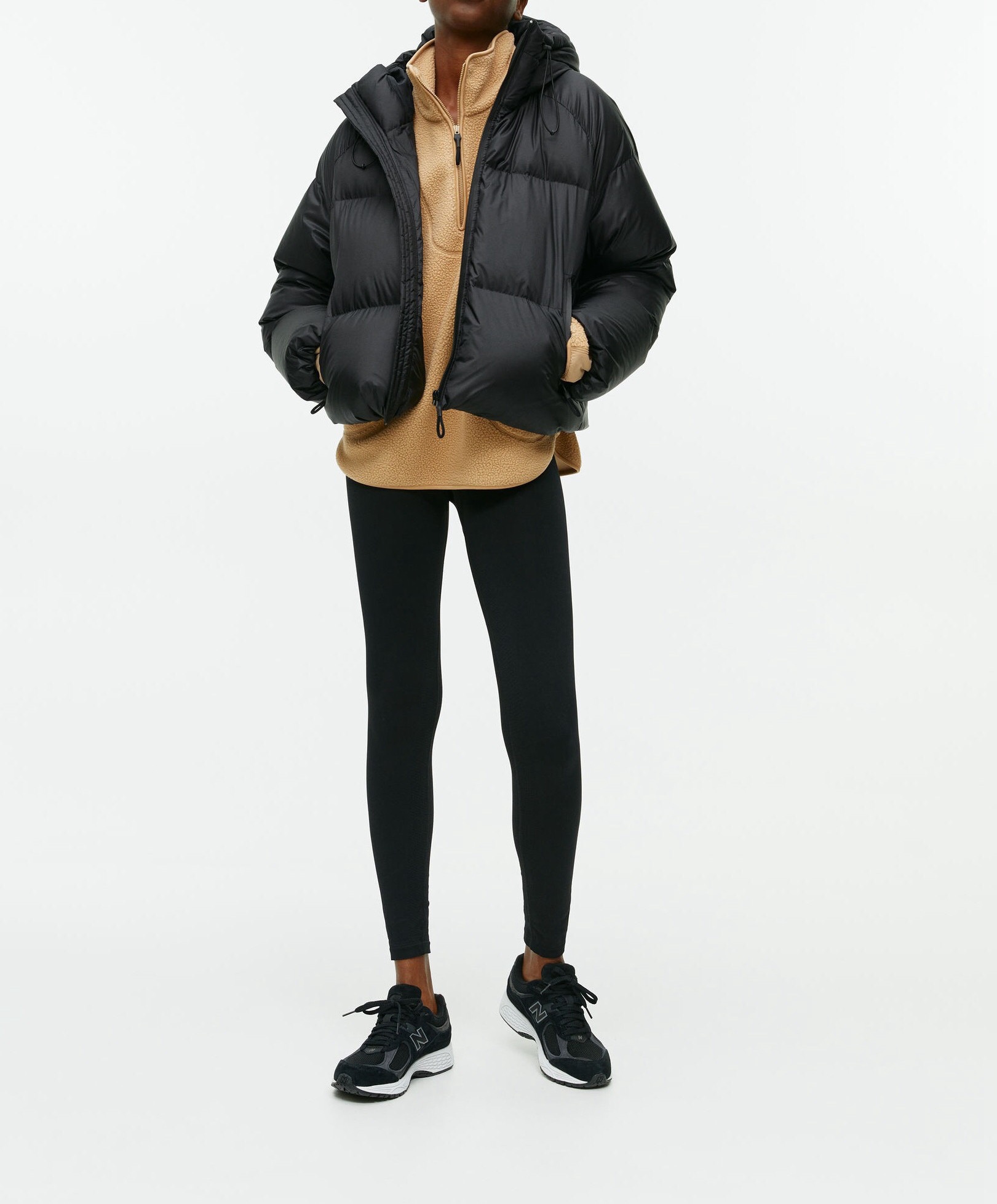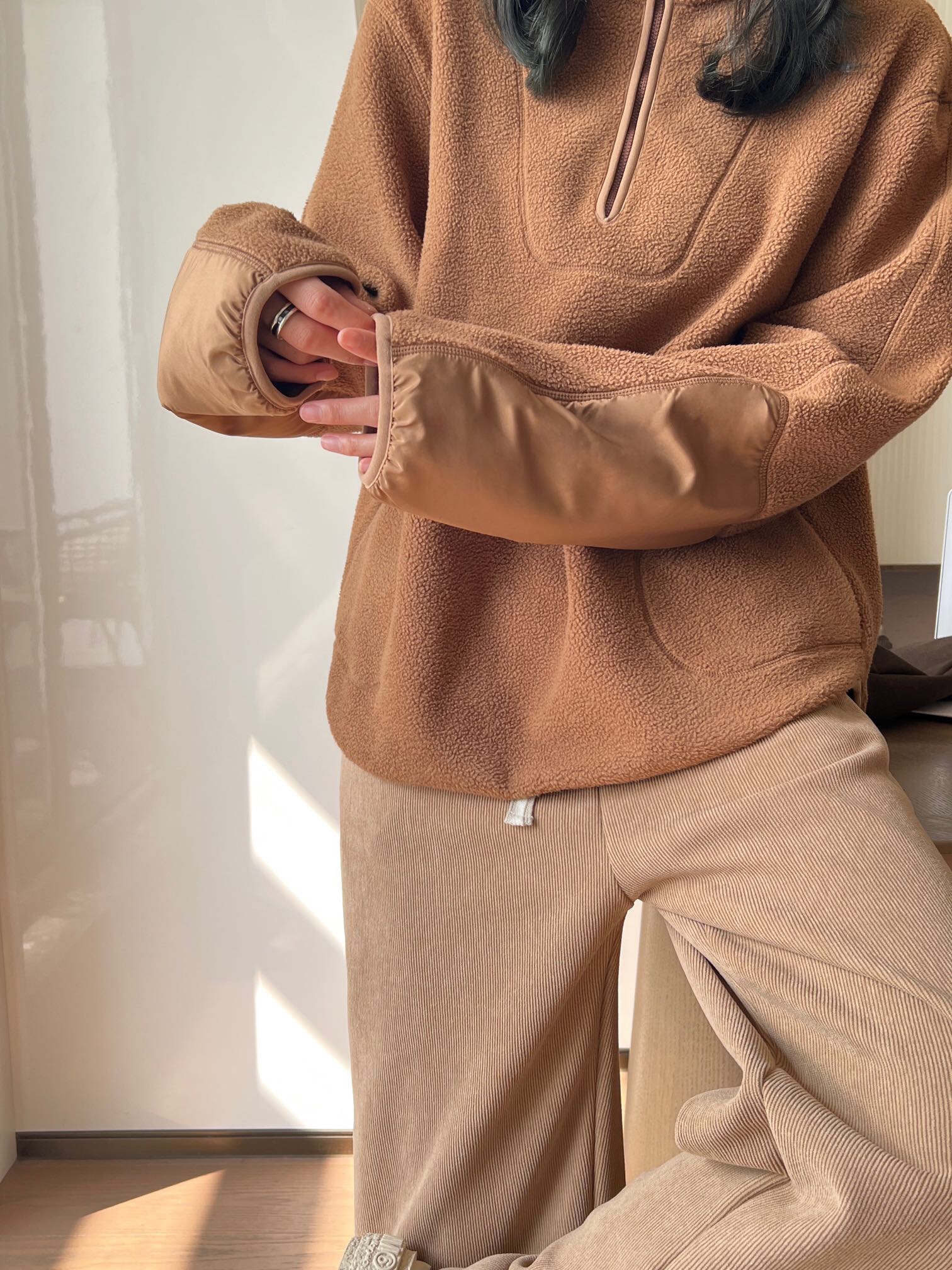 带拇指孔的长袖,再次拉长整体的曲线,防风又保暖