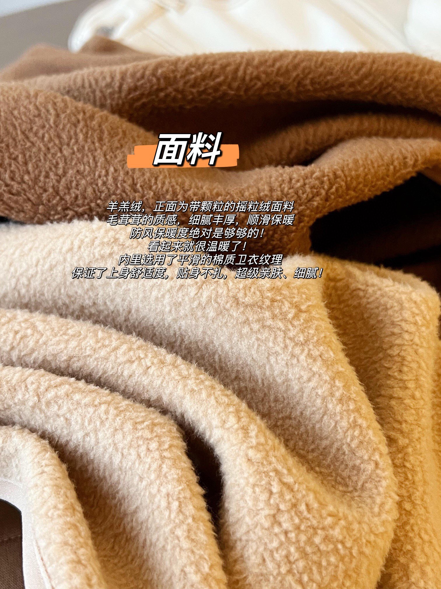 就像是一个个小颗粒填充的,不掉毛,这点毋庸置疑内里手感摸起来光滑柔软,可外穿可内搭👍