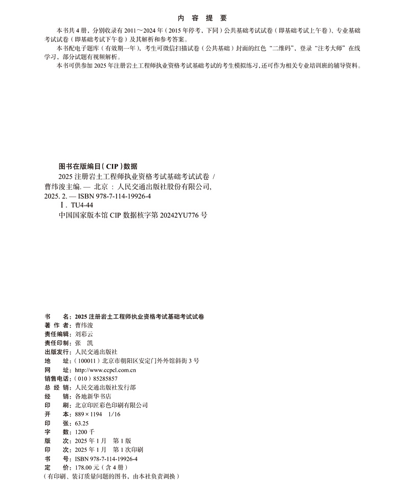 书名:2025注册岩土工程师执业资格考试基础考试试卷