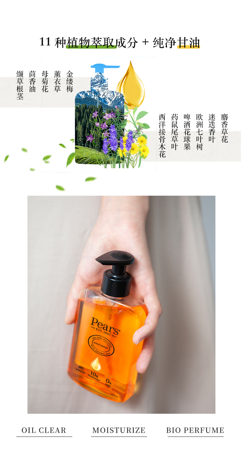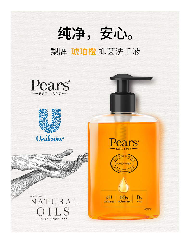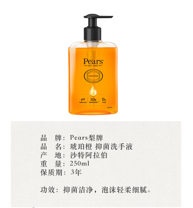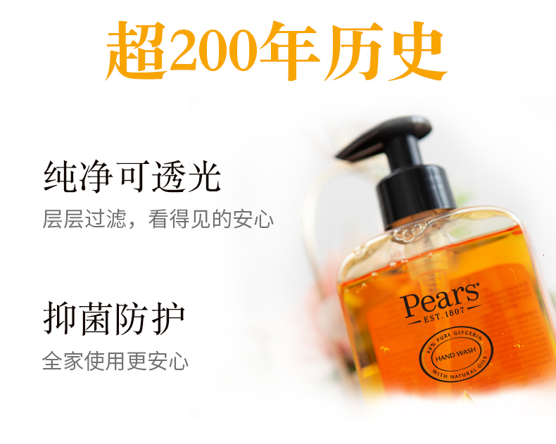 联合利华Pears梨牌洁净保湿香氛洗手精华抑菌洗手液250ml 抑菌率>99.98% 0皂基温和清洁 锁住肌肤水分
