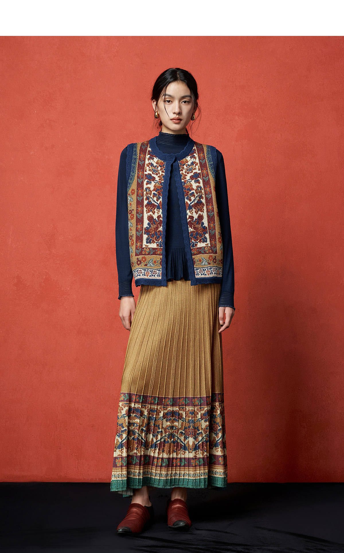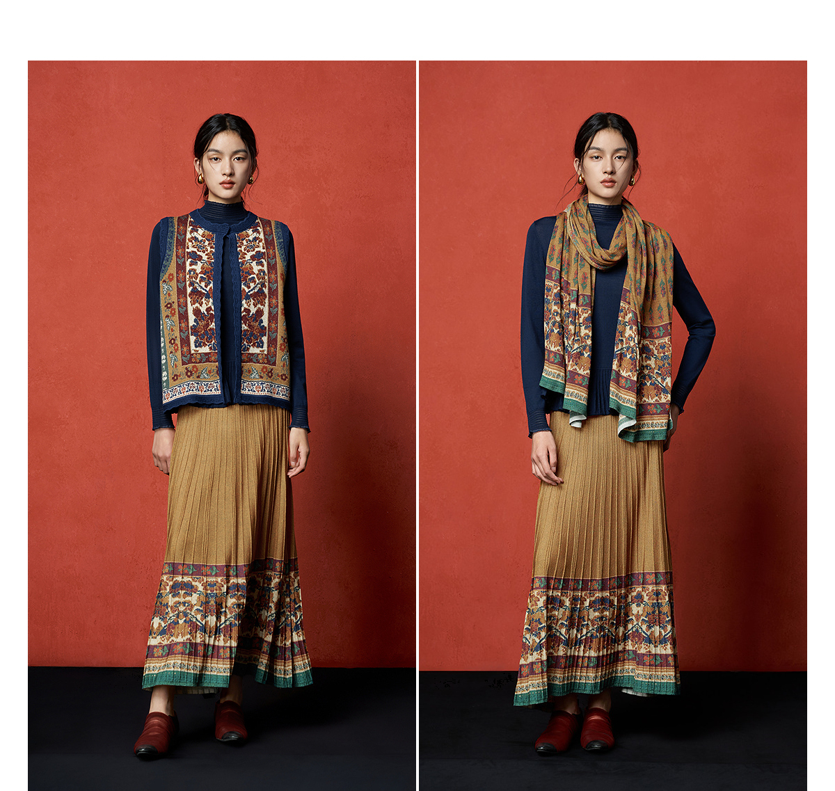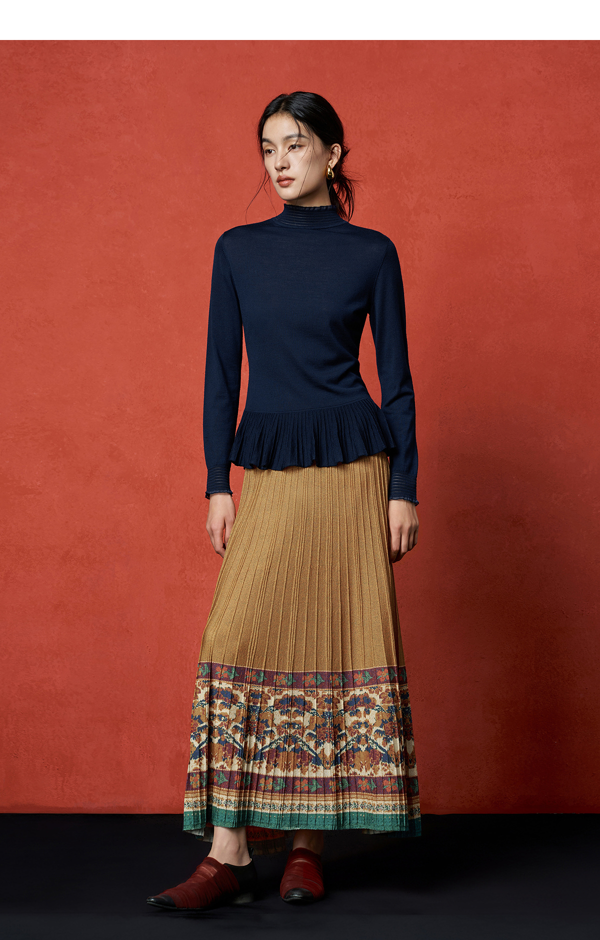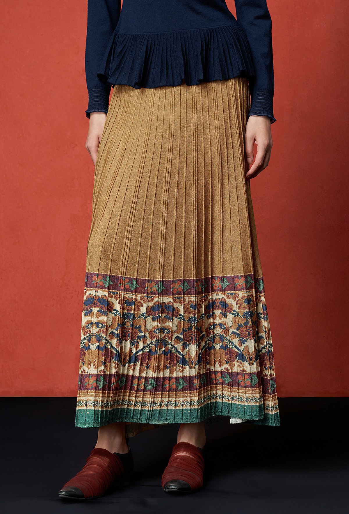 【林栖设计小店】秋色绵羊毛鸳鸯印花毛织半身裙褶皱复古百搭2025秋冬新款长裙子女T1954285