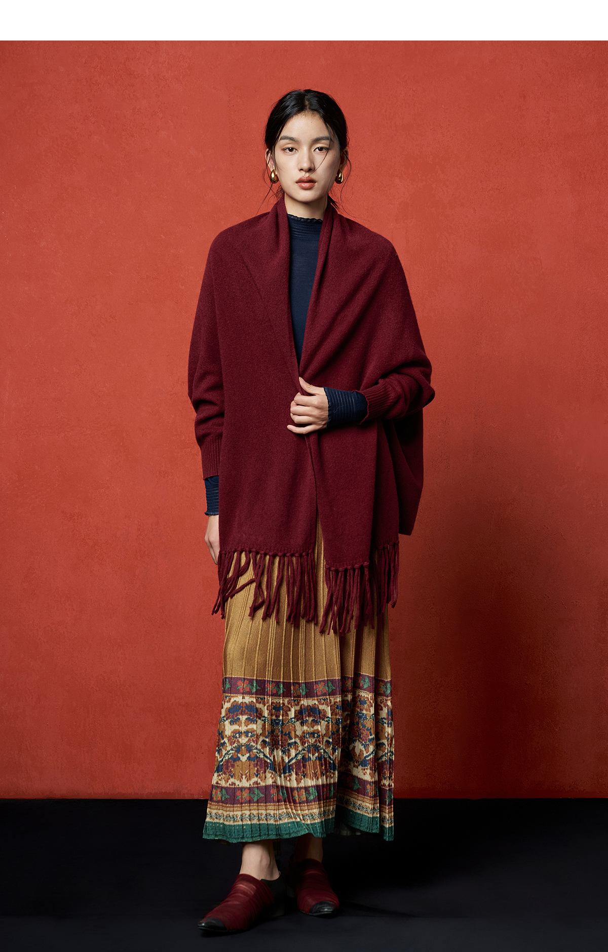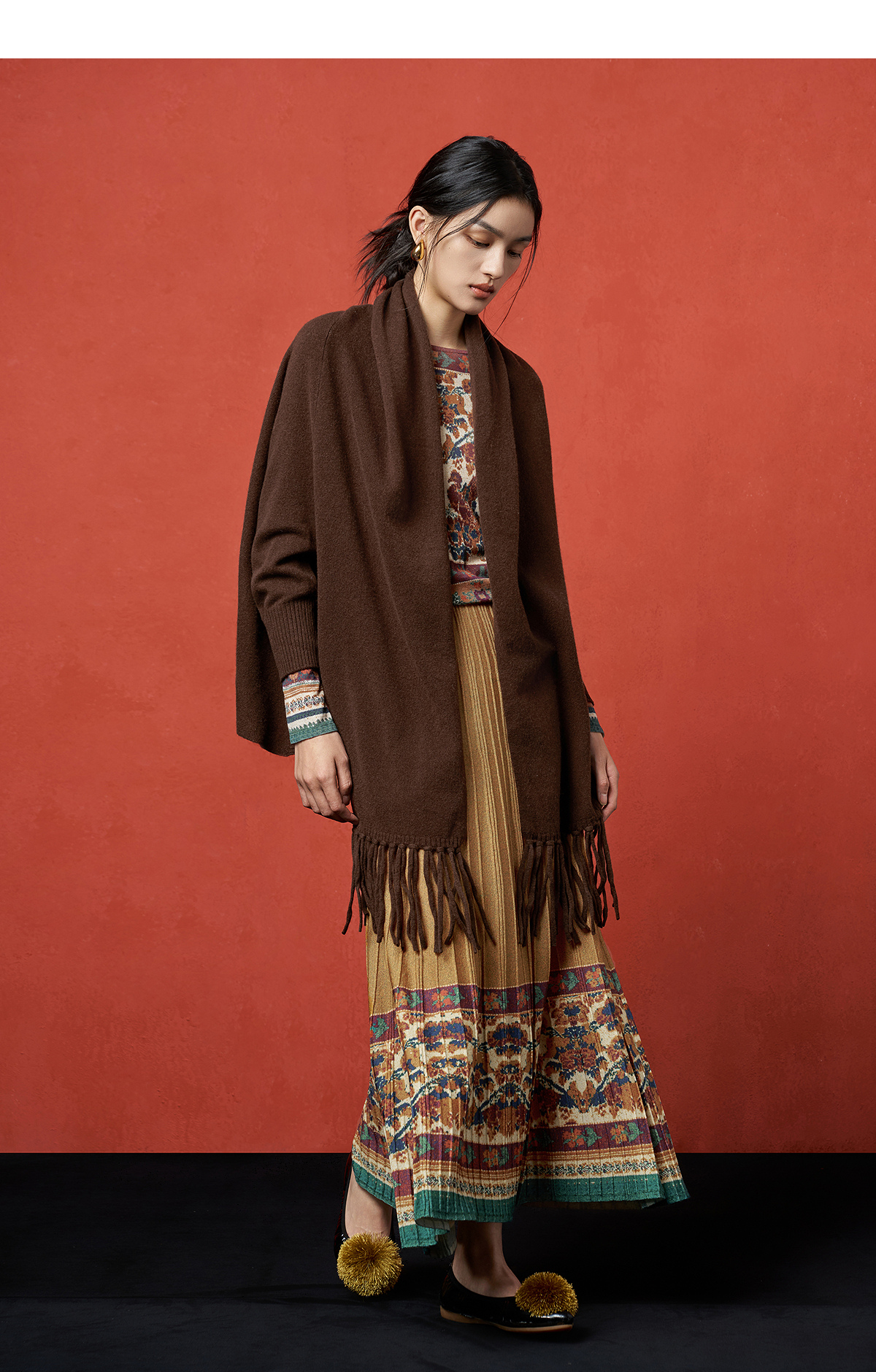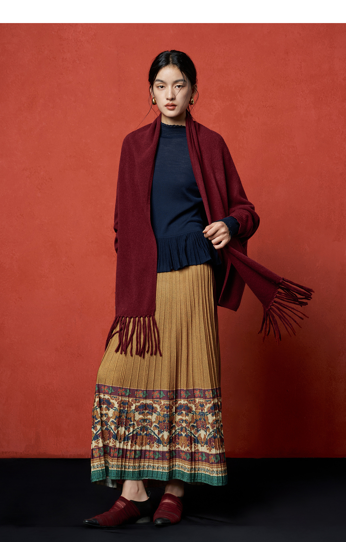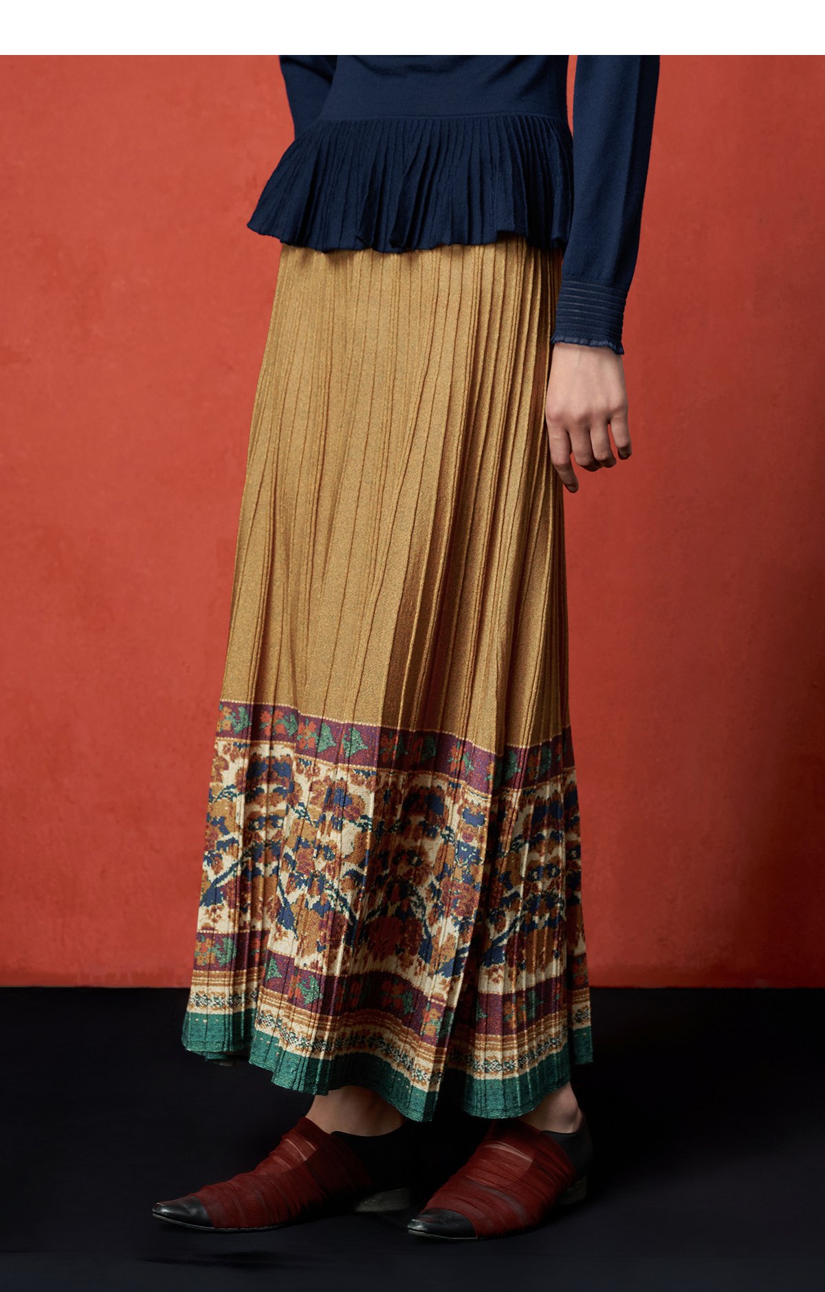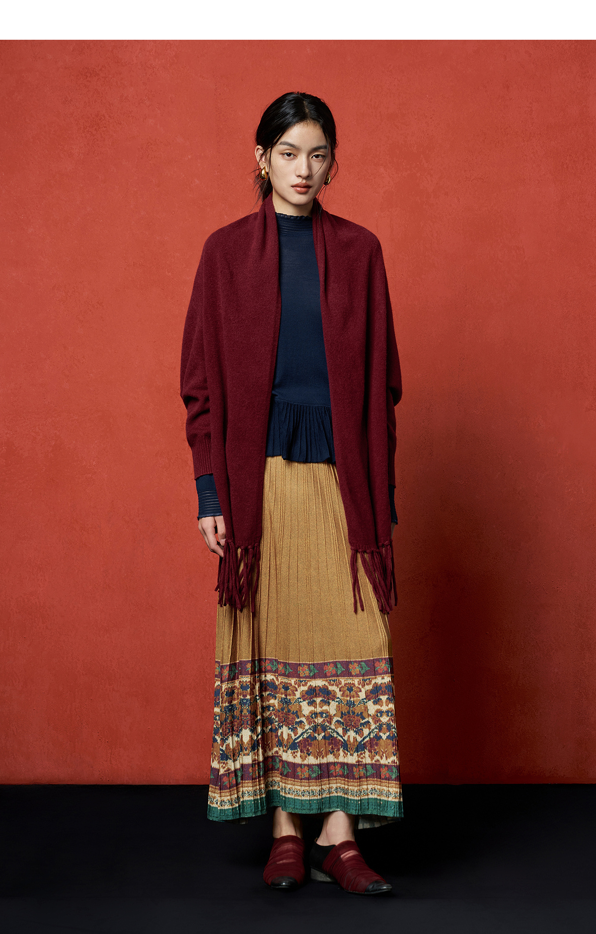 【林栖设计小店】秋色绵羊毛鸳鸯印花毛织半身裙褶皱复古百搭2025秋冬新款长裙子女T1954285