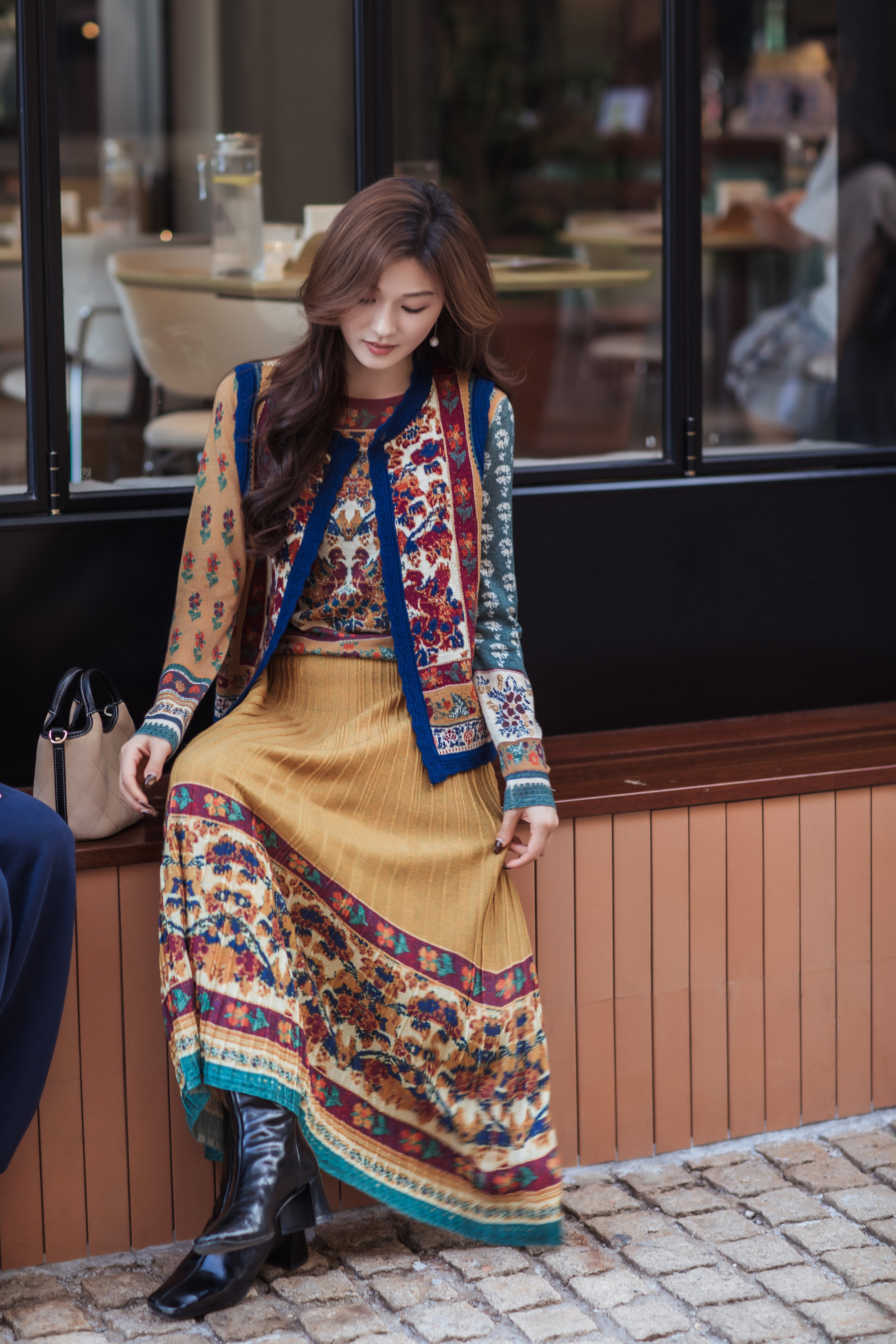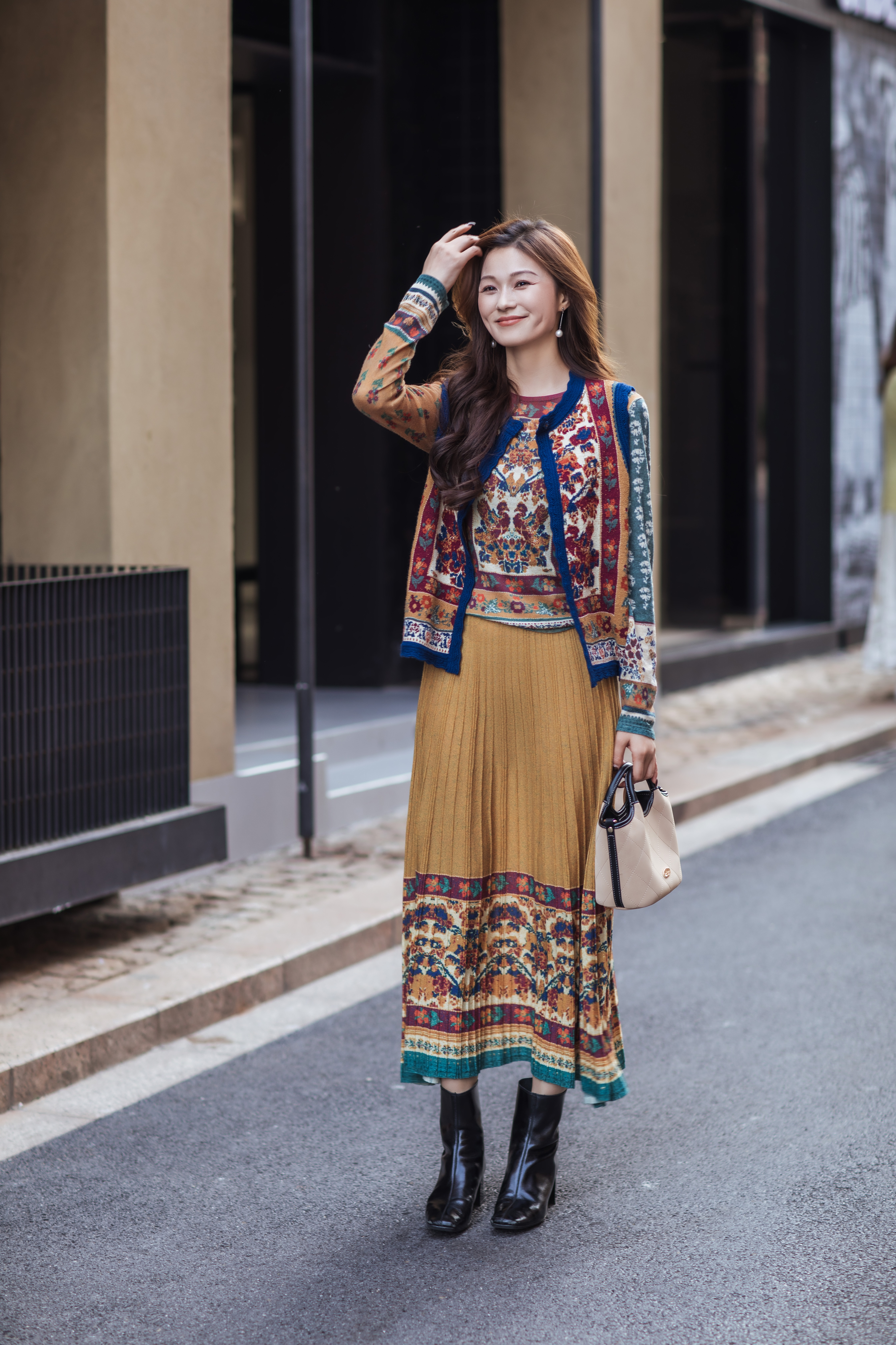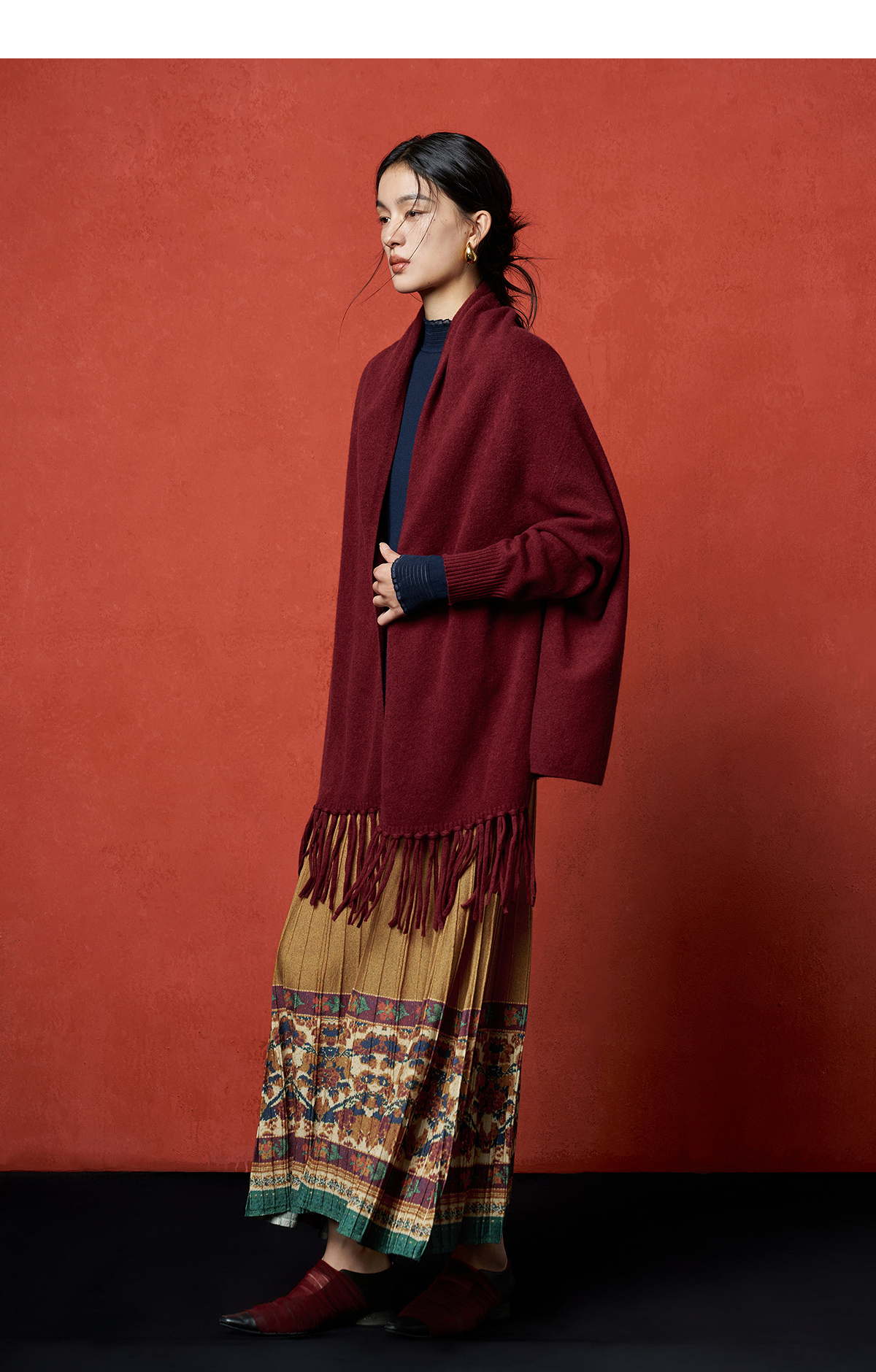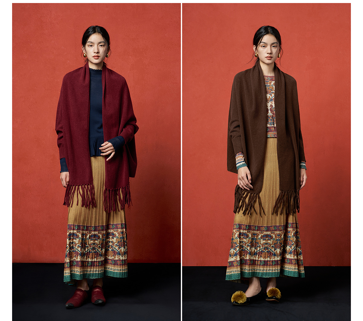 【林栖设计小店】秋色绵羊毛鸳鸯印花毛织半身裙褶皱复古百搭2025秋冬新款长裙子女T1954285