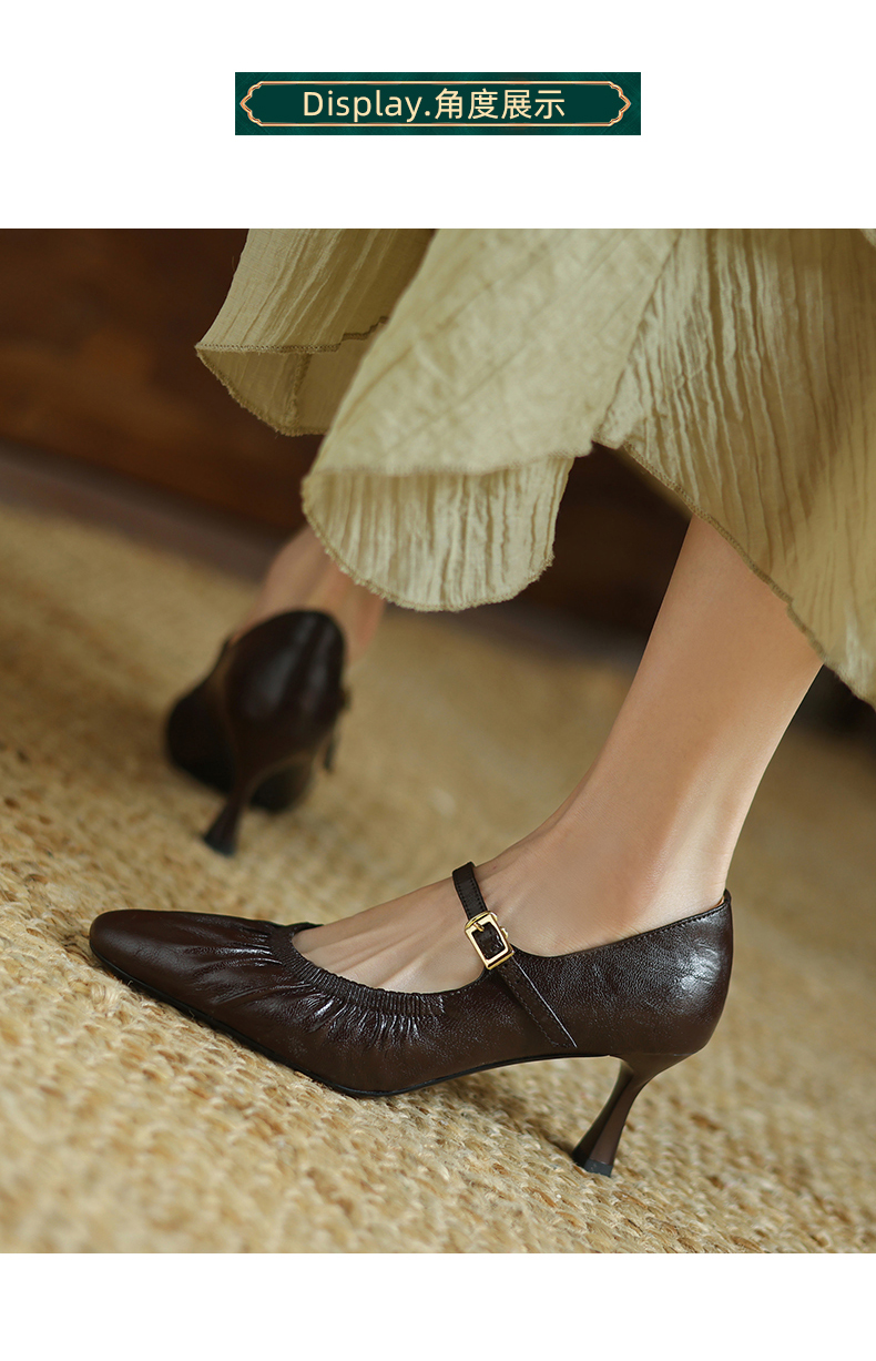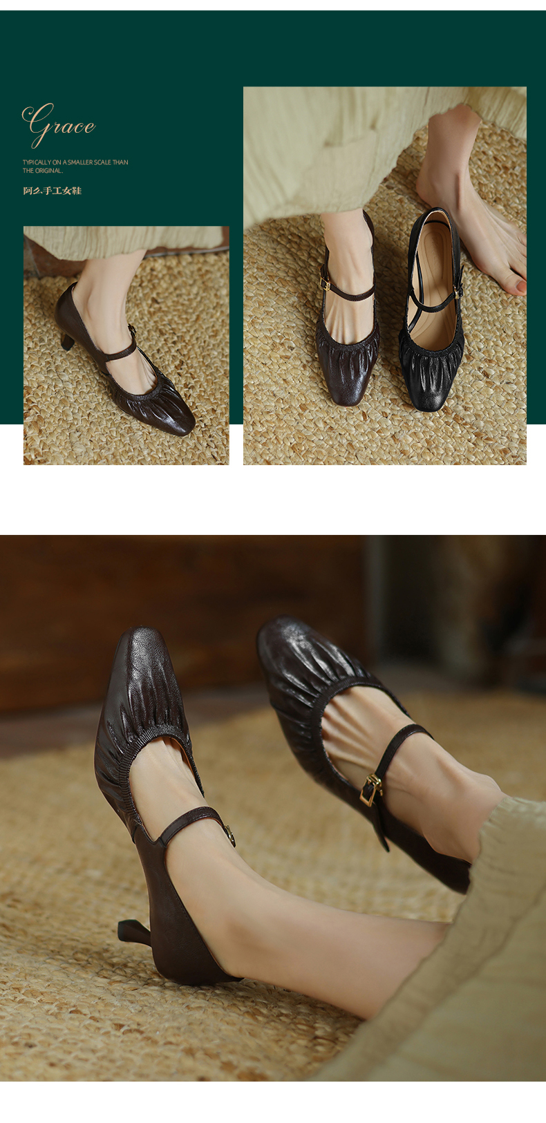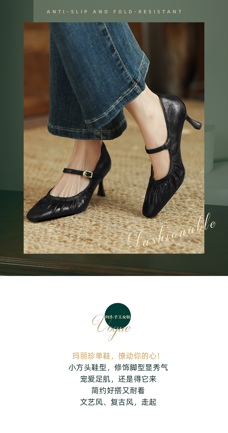 阿么手工女鞋一字带小方头高跟鞋细跟真皮褶皱法式浅口单鞋6.5CM