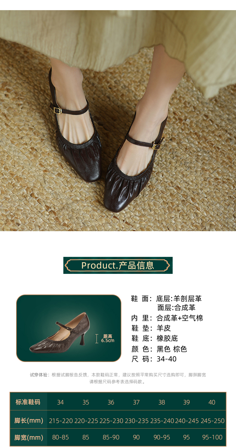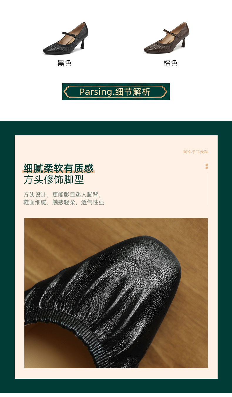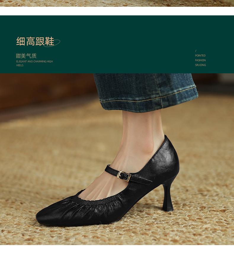 阿么手工女鞋一字带小方头高跟鞋细跟真皮褶皱法式浅口单鞋6.5CM