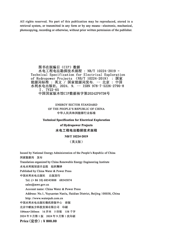 根据《国家能源局关于下达2013年第二批能源领域行业标准制(修)订计划的通知》(国能科技〔2013〕526号)的要求,规程编制组经广泛调查研究,认真总结实践经验,参考有关国内相关标准,并在广泛征求意见的基础上制定本规程。本英文规程是根据中国水利水电出版社出版的《水电工程电法勘探技术规程》NBT 10224-2019翻译而成的,本规程的主要技术内容是:基本规定、仪器设备、现场工作、数据处理与资料解释等。著作权归国家能源局所有。在使用过程中,如出现异议,以中文版为准。