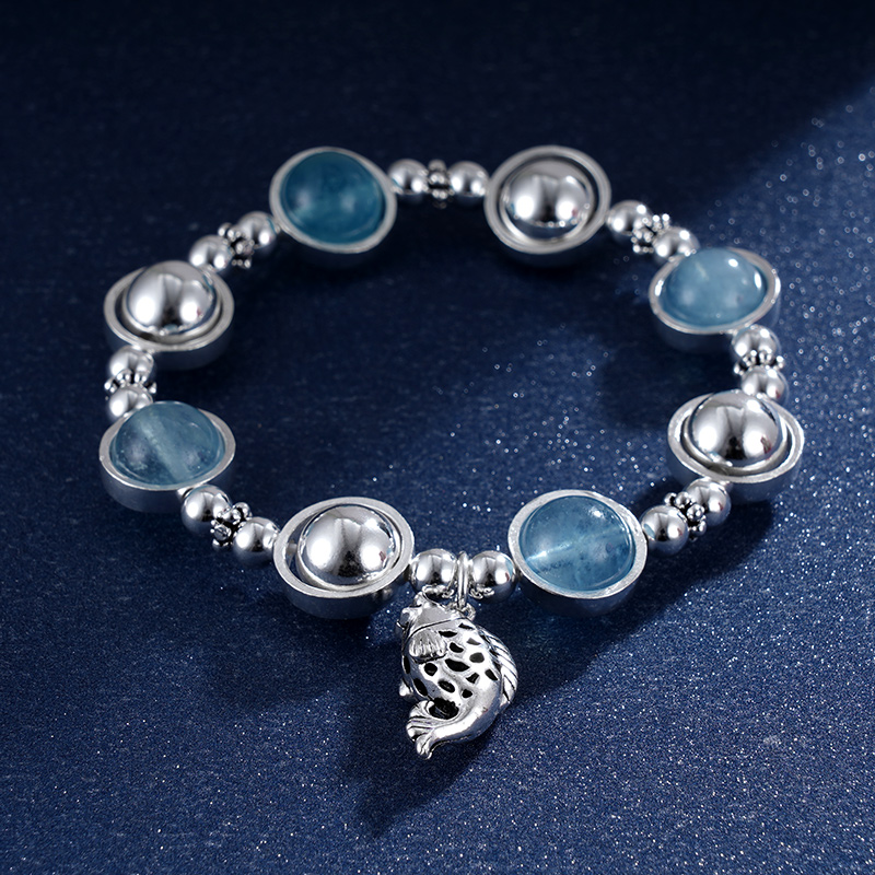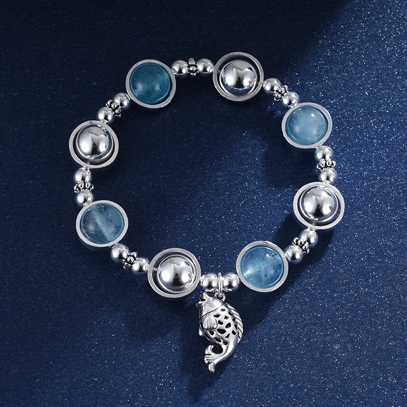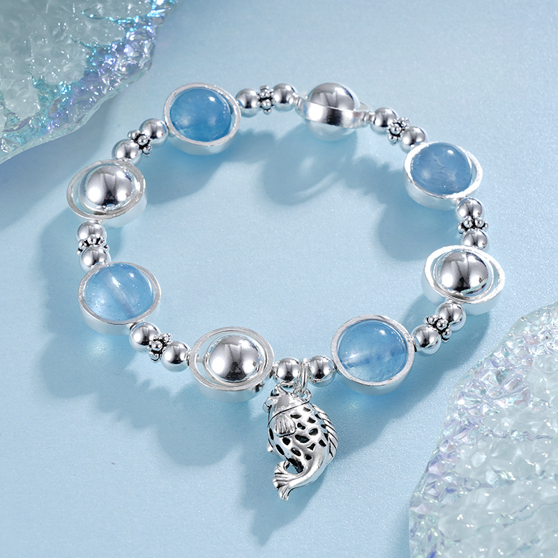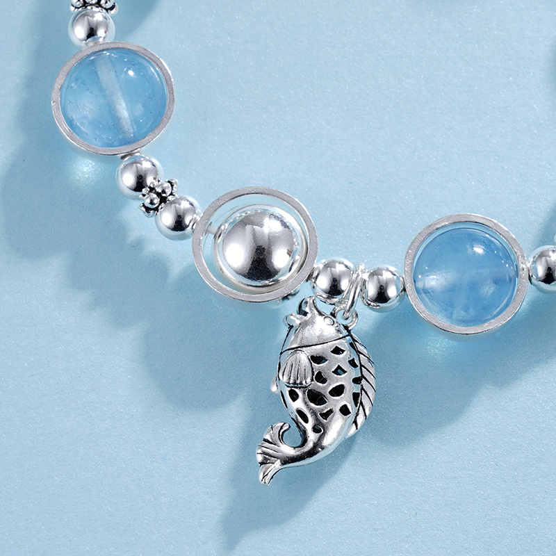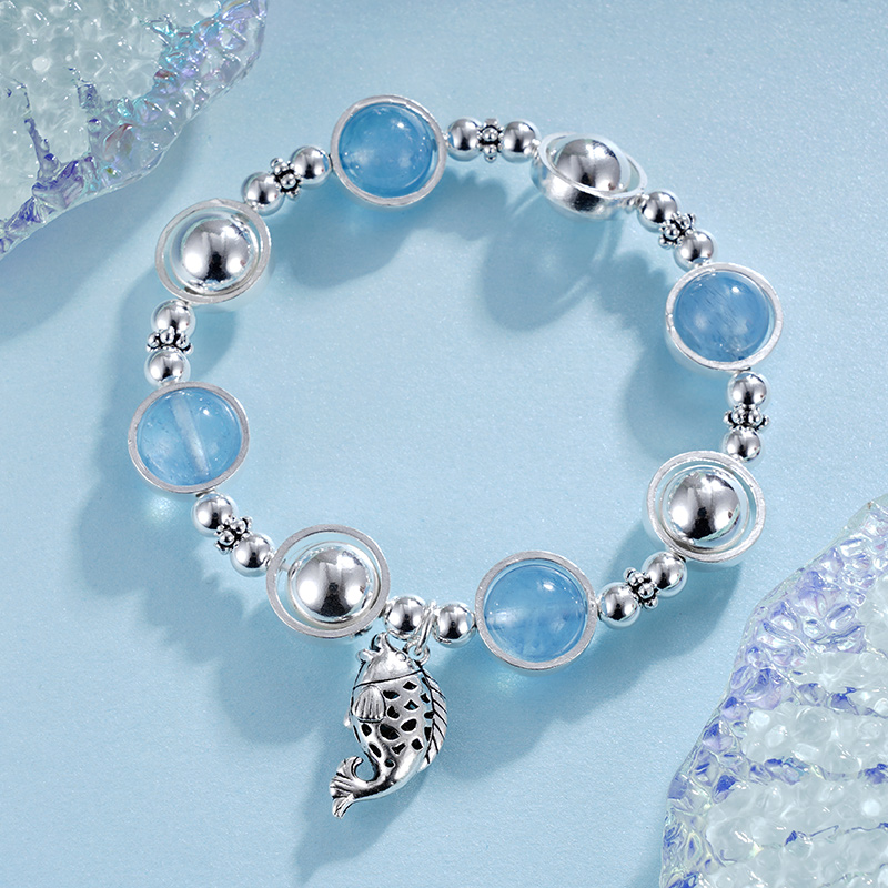 【寓意】:一枚清新淡雅的手串,镶嵌蓝水晶,搭配小鲤鱼坠饰,取小鱼遨游大海之意,象征在追寻梦想的道路上,获取力量,游刃有余。