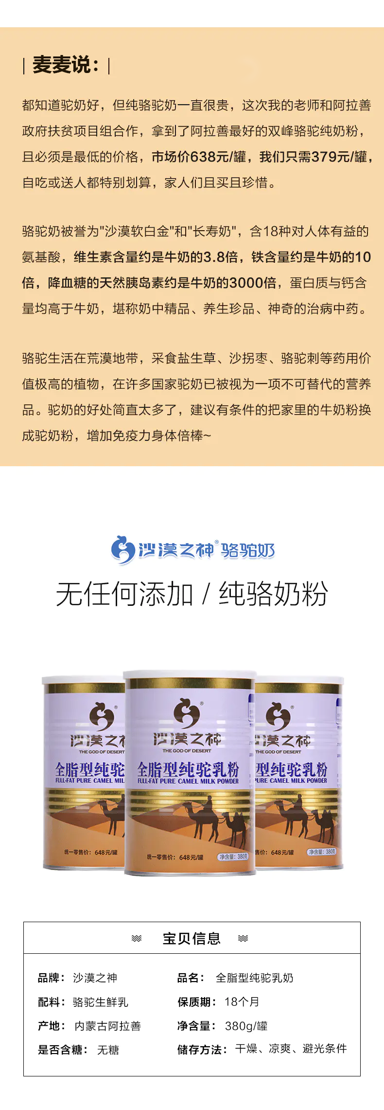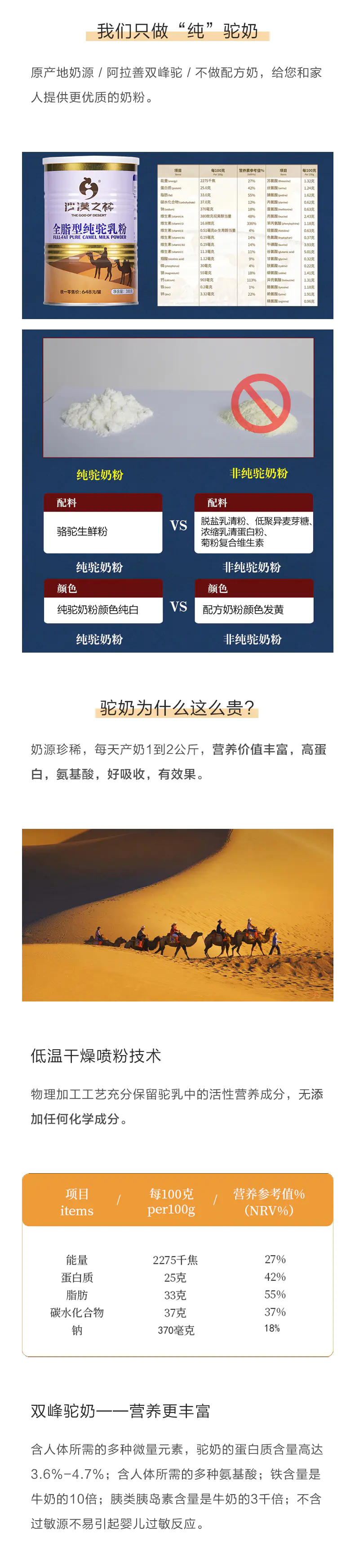 【有机认证的纯骆驼奶粉】阿拉善 双国家地理标志产品 健康营养无添加 给孩子补充高钙营养 380g一罐!【TJ-J仓】