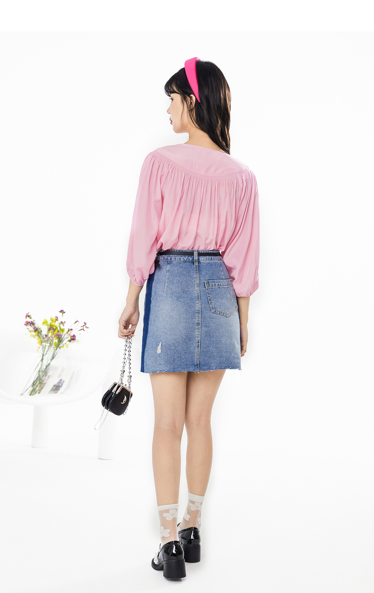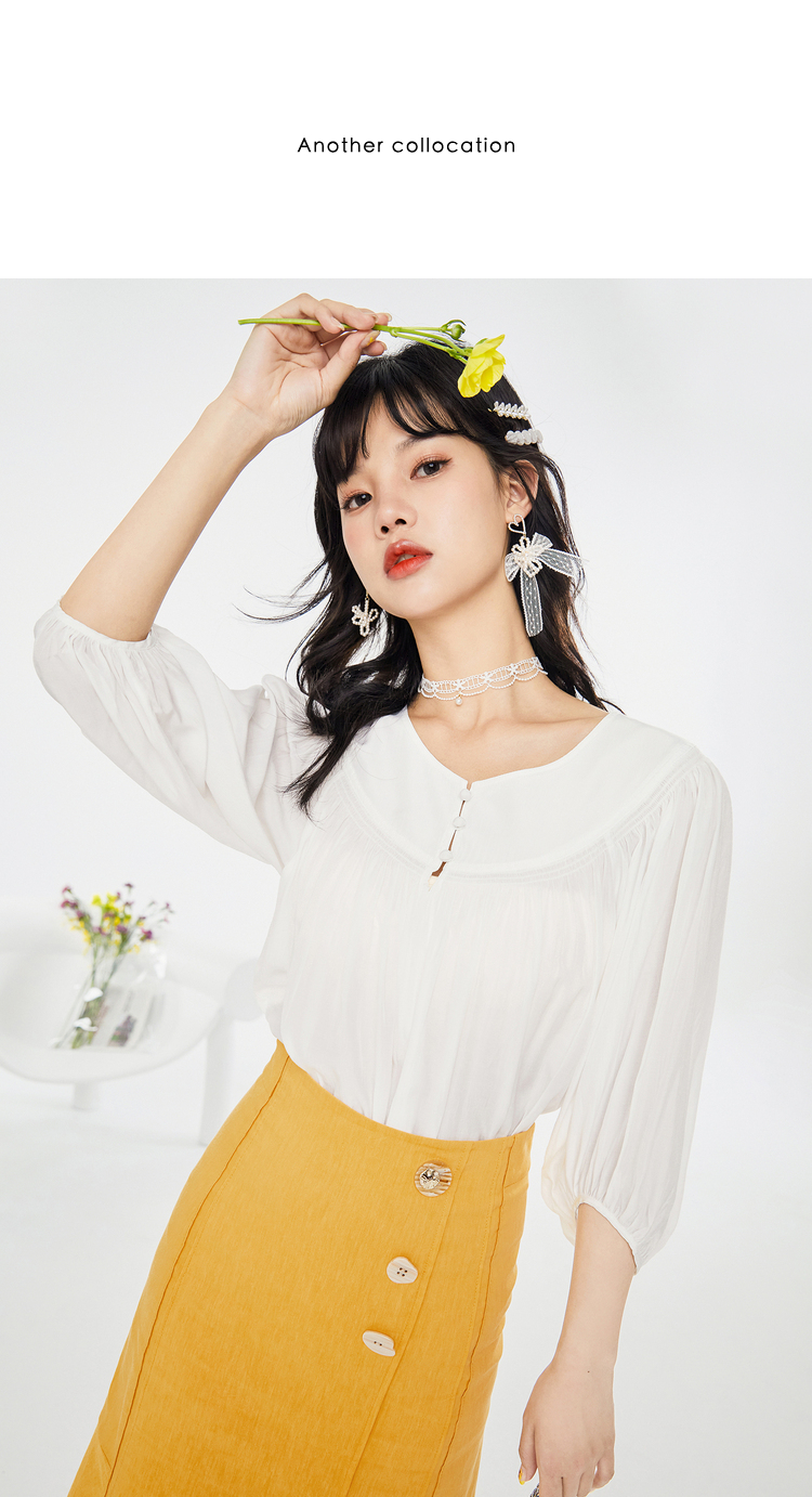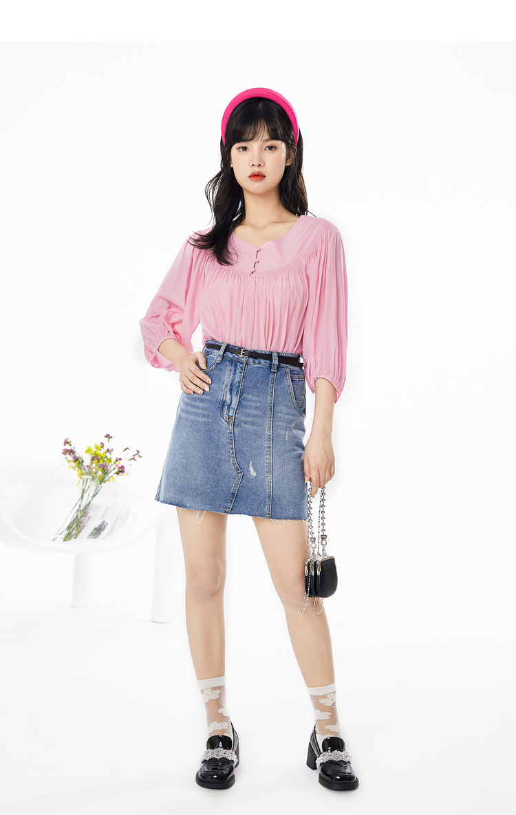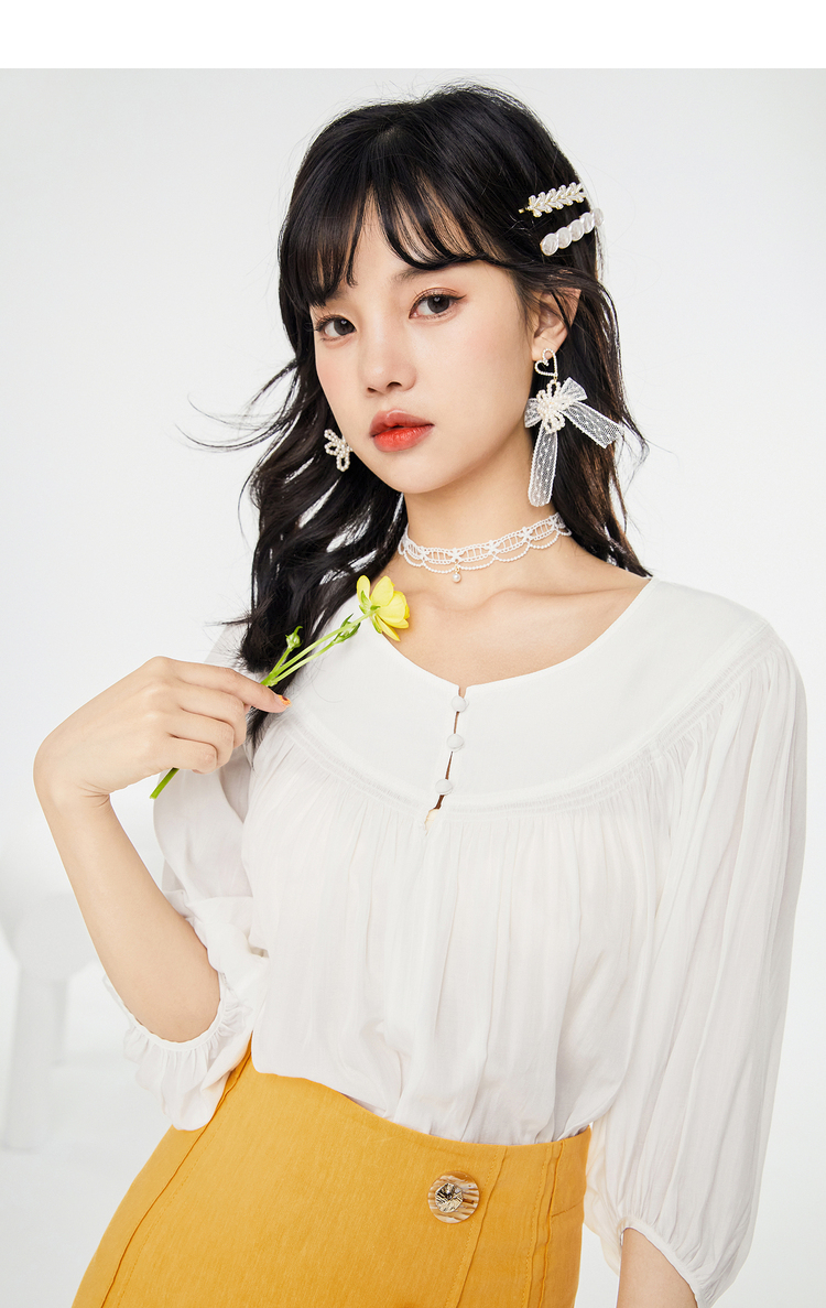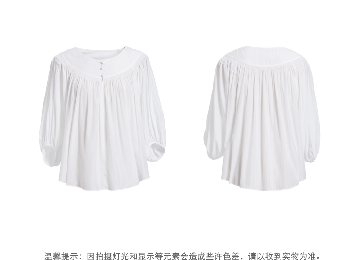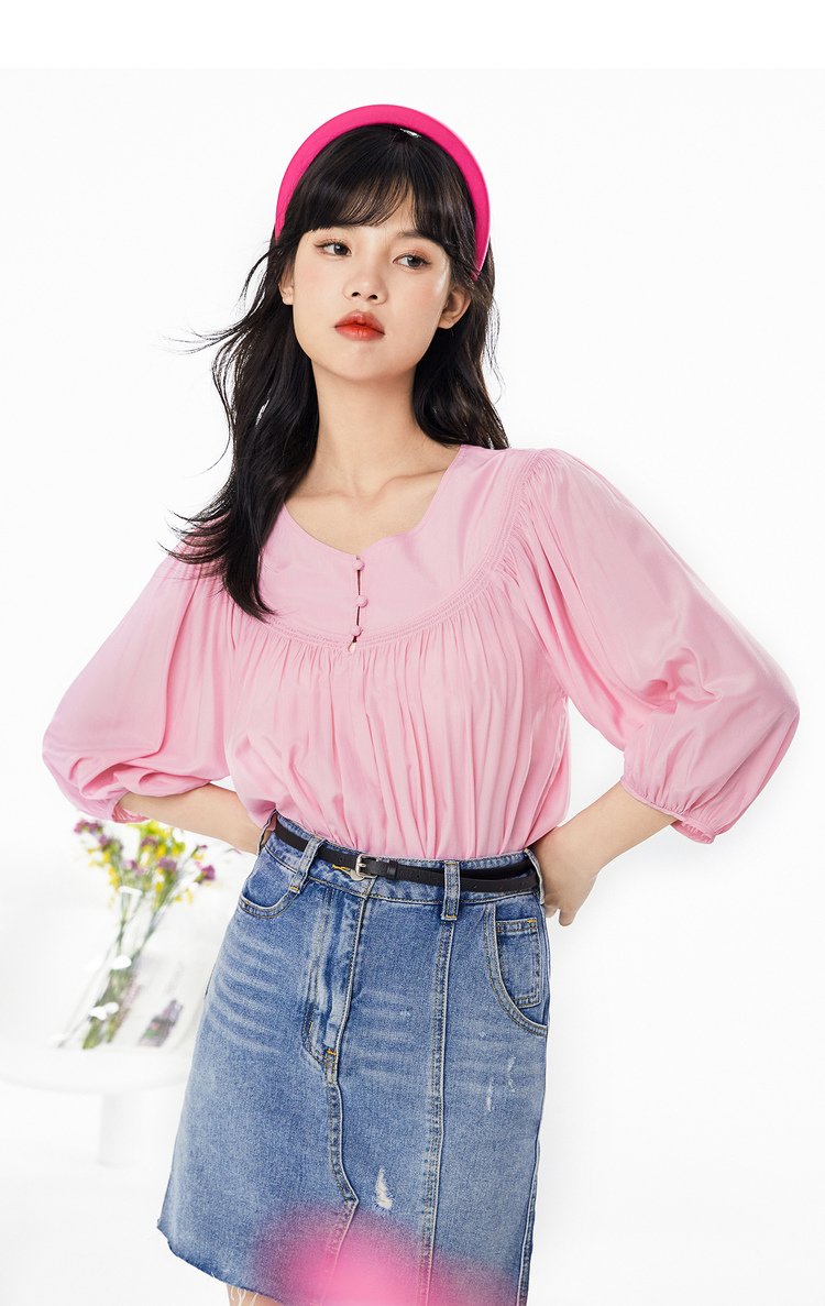 NEELLY纳俪春夏新款女圆领纯色五分灯笼袖衬衫商场同款套头衫N112005CR161