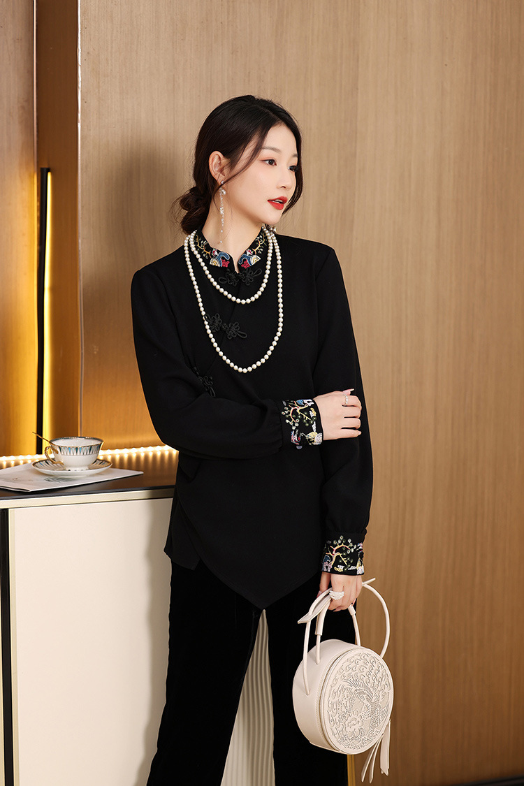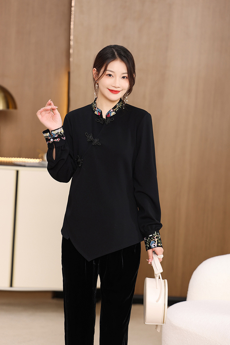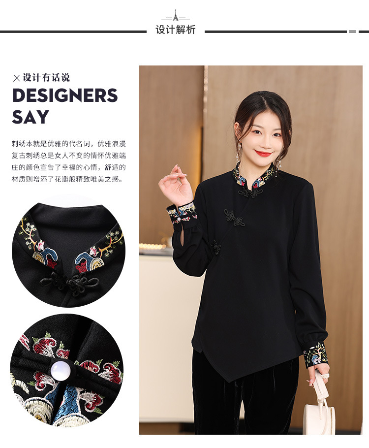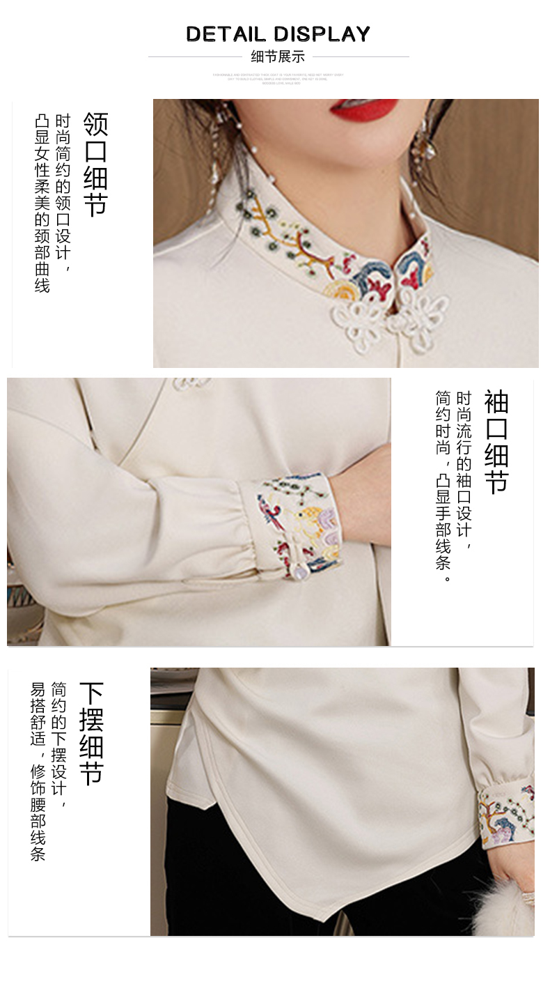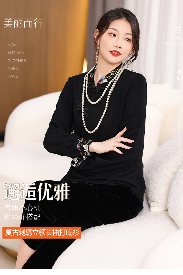 2022春秋新款中国风复古刺绣立领长袖女修身打底衫 HLV2270