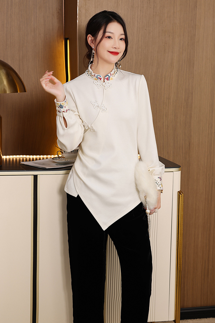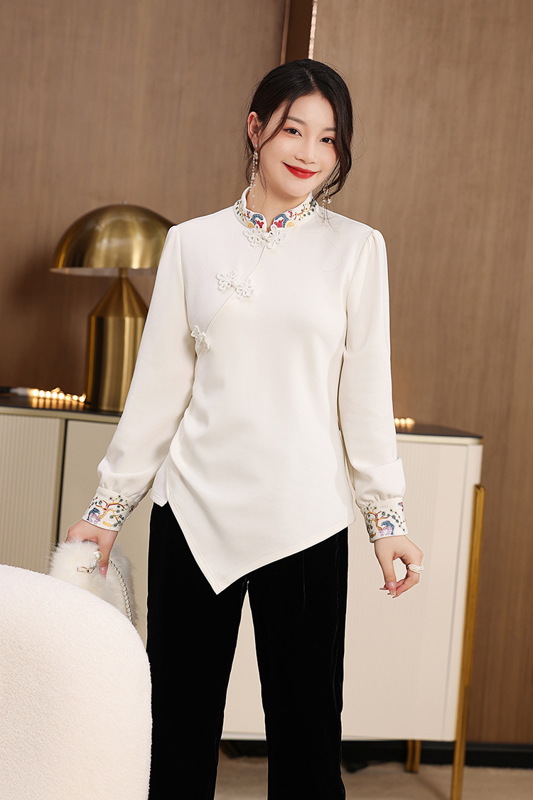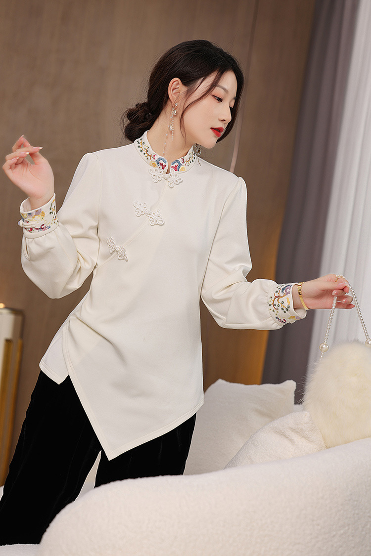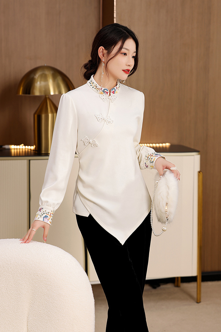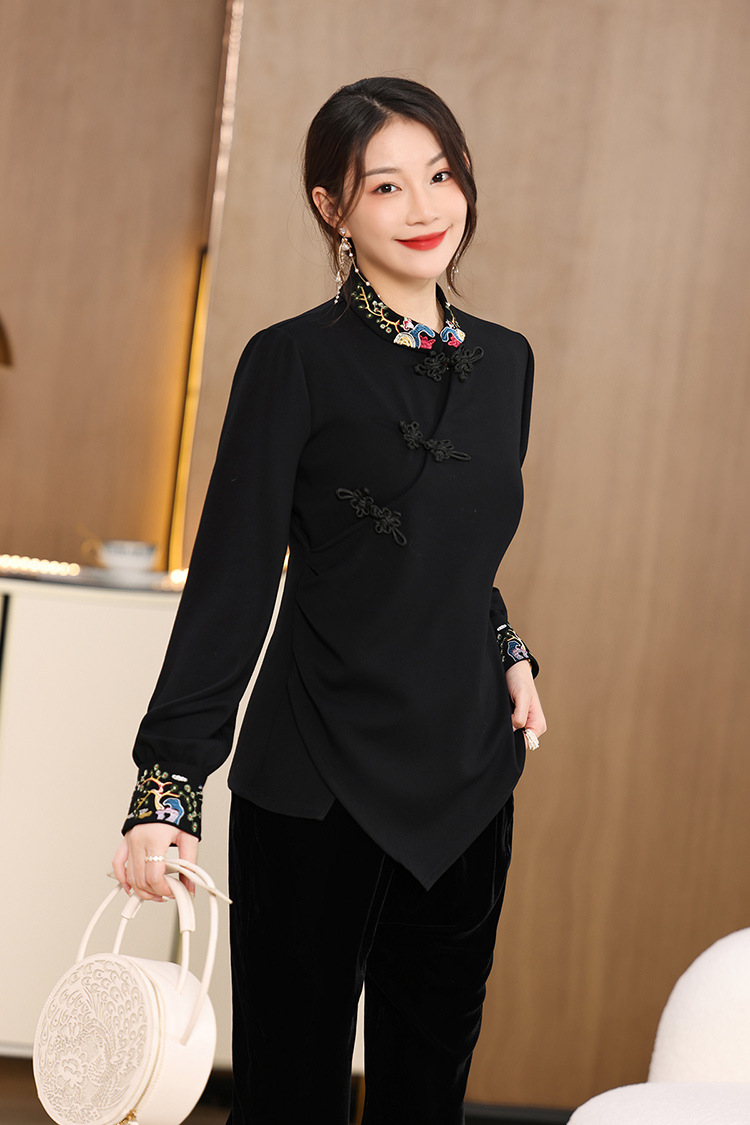 2022春秋新款中国风复古刺绣立领长袖女修身打底衫 HLV2270