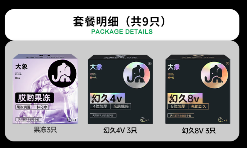 大象避孕套果冻润滑延时4倍加厚性用品男女用套套成人情趣安全套9只