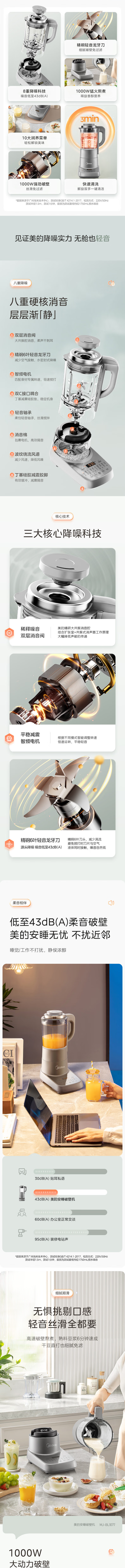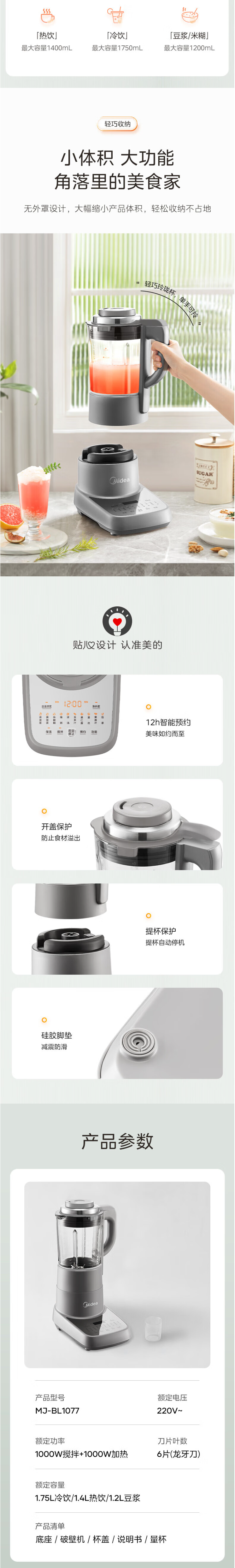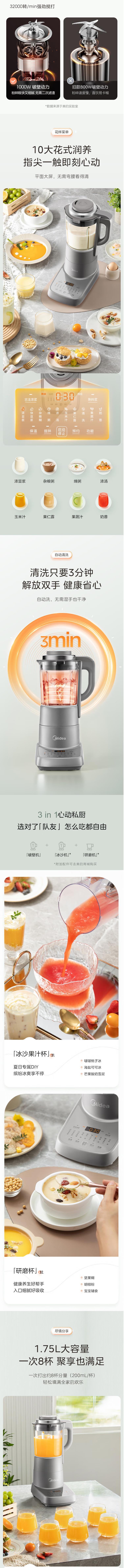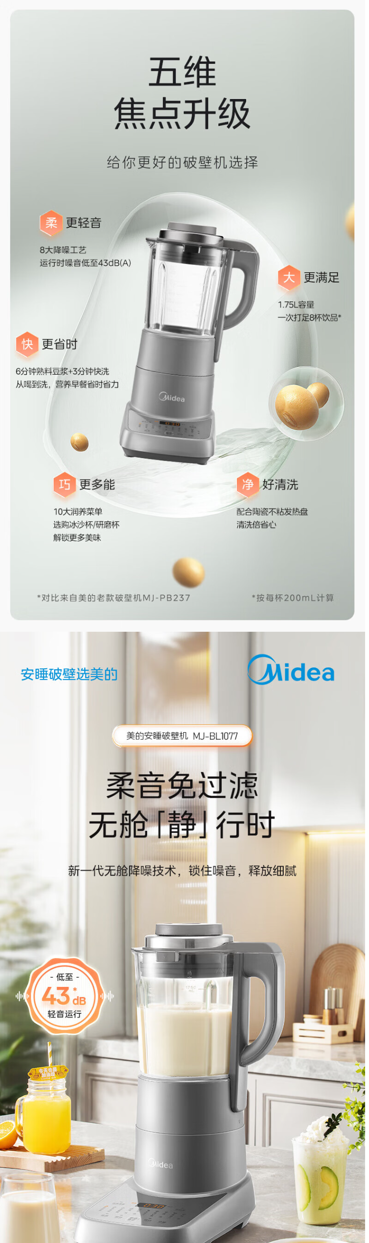 美的(510565)破壁机家用大容量1.75L多功能早餐豆浆机榨果汁辅食机8重降噪轻音料理机MJ-BL1077